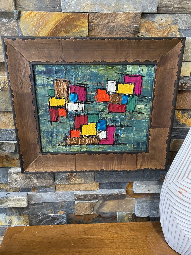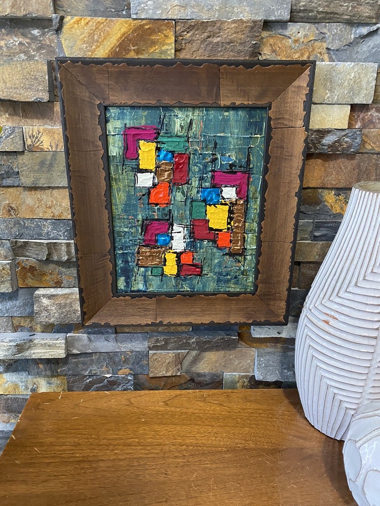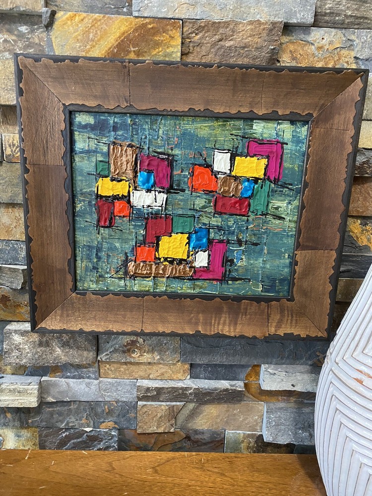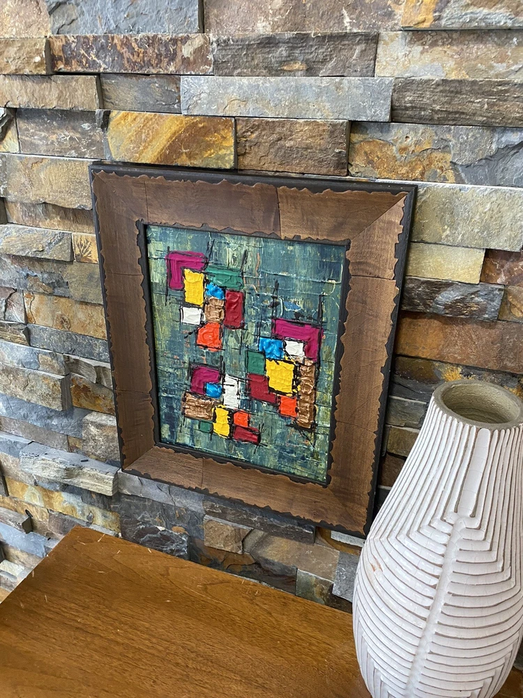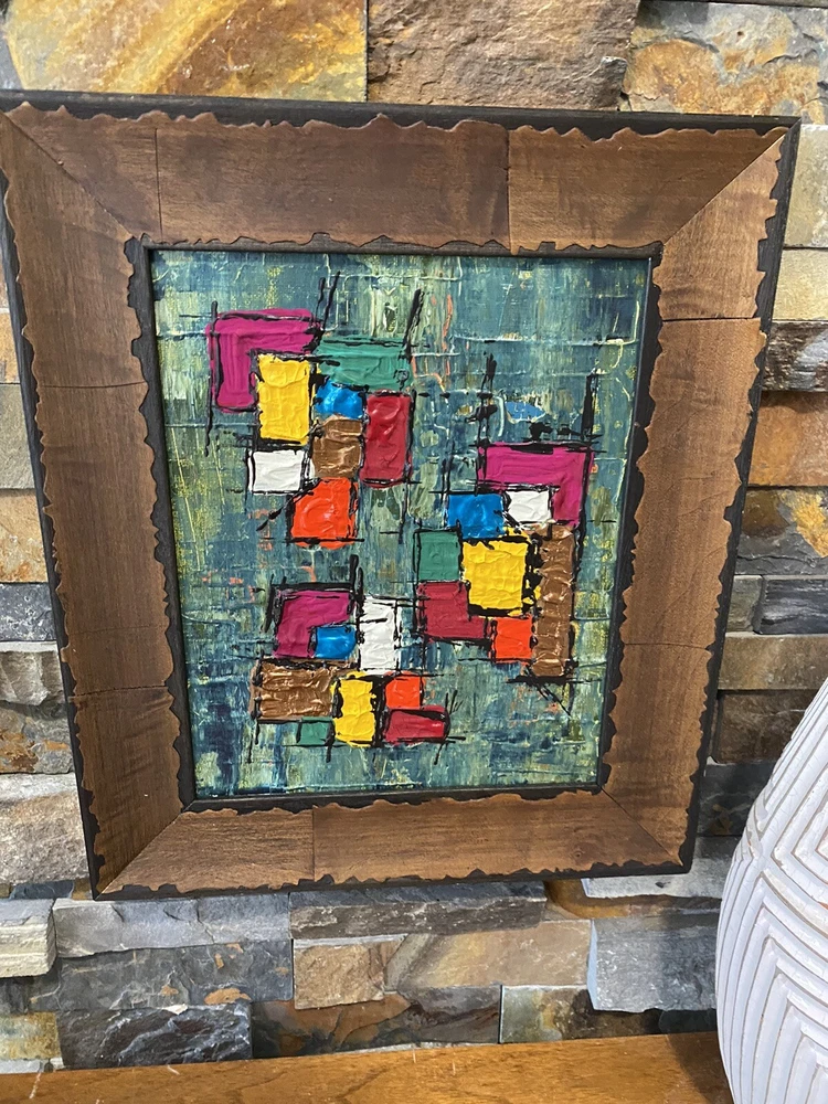 >>>Perfect for your Mid Century Modern Home>>> Original Acrylic Painting Titled- “Autumn” Original painting with upcycled free frame included - size with frame is 11.75” x 13.75” please note frames are not perfect, but complement the mcm designs. Wonderful MCM abstract design, vibrant layers of color Please ask questions prior to bidding ---- ( any accessories in picture not included ) Will ship within Continental US only ABOUT Me: I paint my passion. I grew up in a paneled ranch house with orange shag rugs and a mod cone fireplace in the den where we all watched the Brady Bunch ... ohhh that floating staircase! My work blends my obsession of anything mid century modern, with my love for using different materials, rich colors and textures, while mixing old with new. Early training on the East Coast supplemented by many trips to California have influenced my style. I am also a Frank Lloyd Wright devotee. A recent excursion to Sarasota has inspired my latest creations. All work is original, never to be duplicated. You deserve unique, one of a kind abstract masterpieces that will be the centerpiece of any room. I want you to smile and be moved every time you look at my art. Please check feedback - 100% satisfied customers.