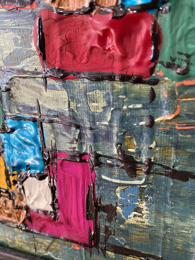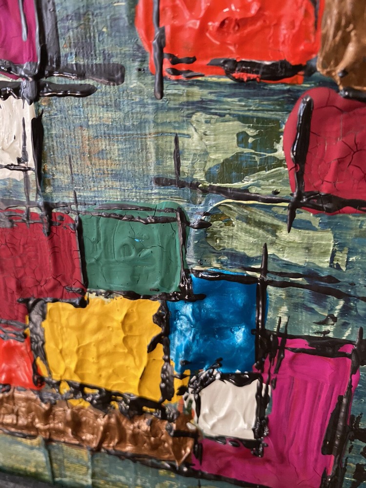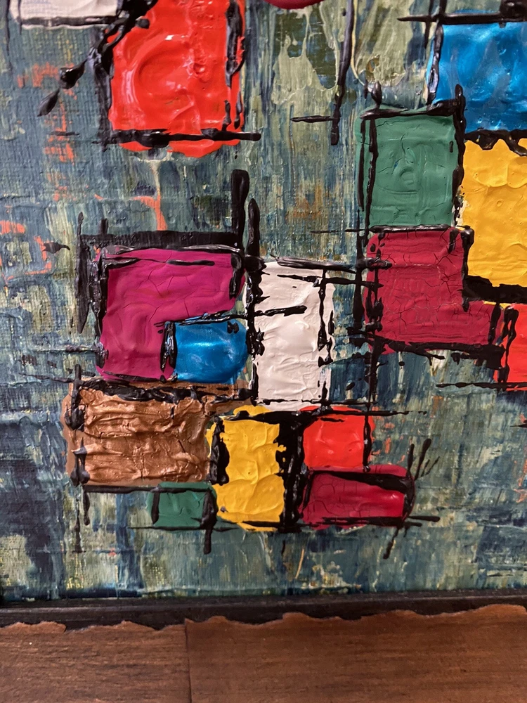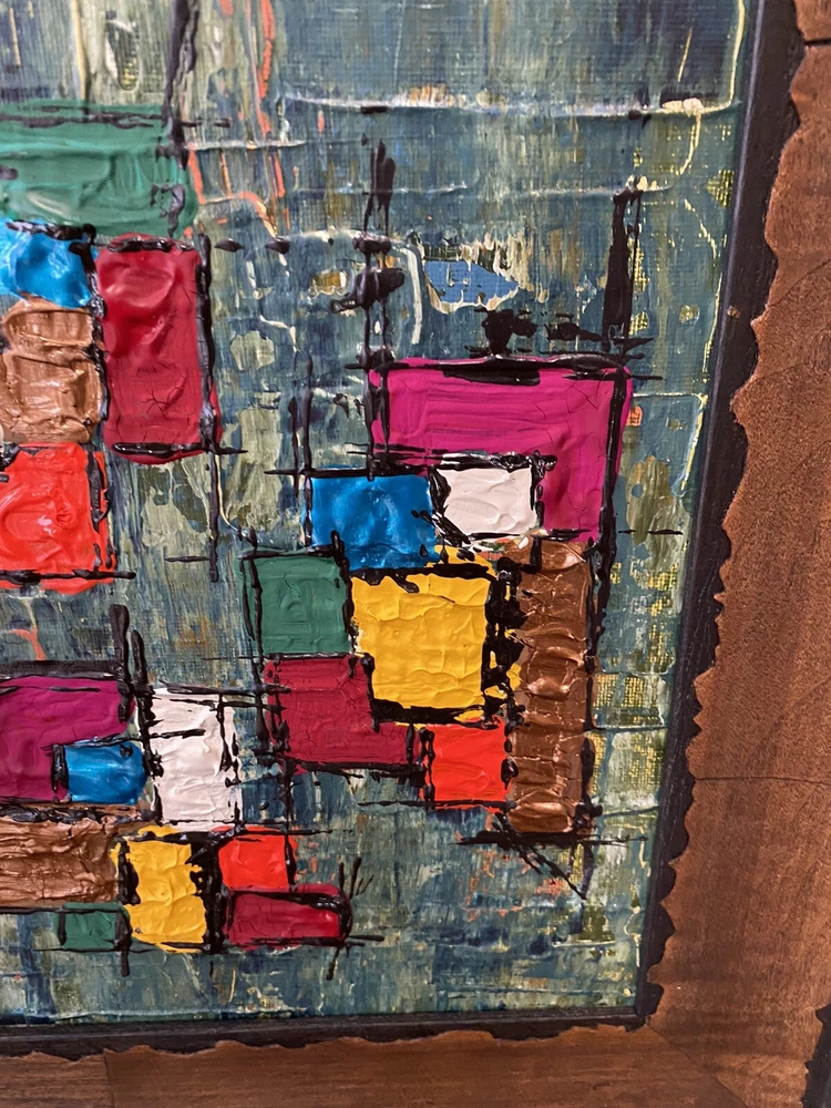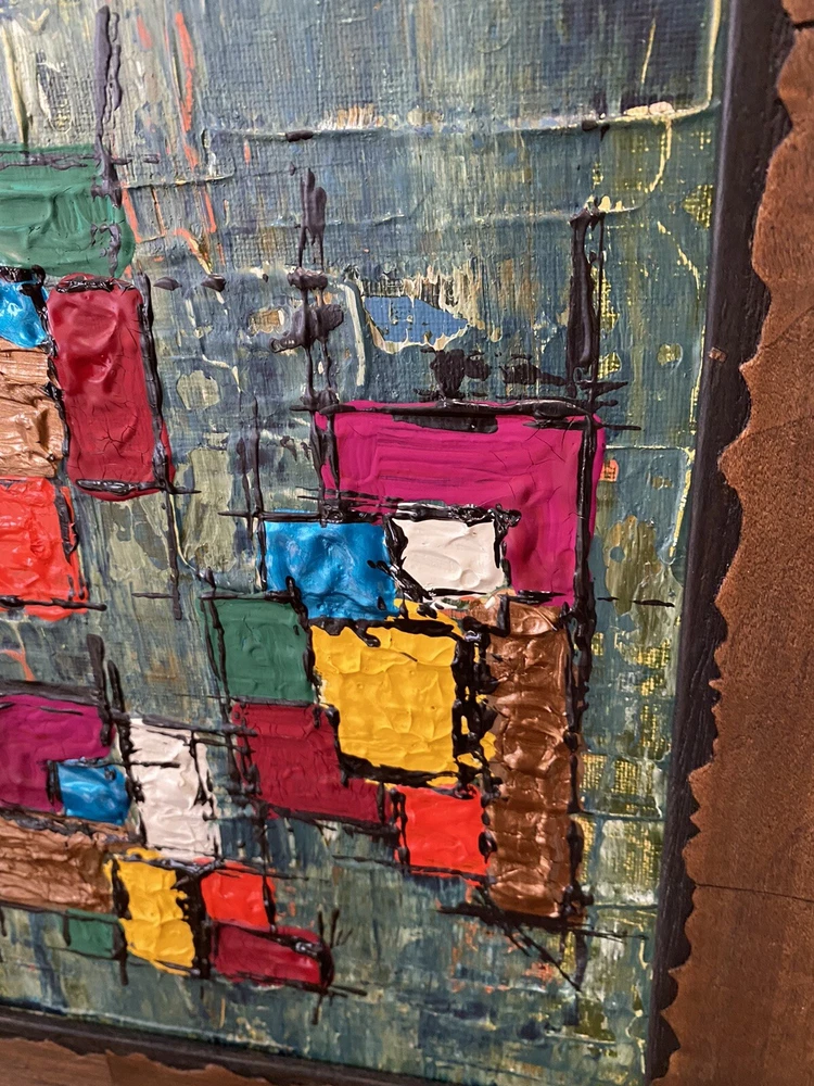 >>>Perfect for your Mid Century Modern Home>>> Original Acrylic Painting Titled- “Autumn” Original painting with upcycled free frame included - size with frame is 11.75” x 13.75” please note frames are not perfect, but complement the mcm designs. Wonderful MCM abstract design, vibrant layers of color Please ask questions prior to bidding ---- ( any accessories in picture not included ) Will ship within Continental US only ABOUT Me: I paint my passion. I grew up in a paneled ranch house with orange shag rugs and a mod cone fireplace in the den where we all watched the Brady Bunch ... ohhh that floating staircase! My work blends my obsession of anything mid century modern, with my love for using different materials, rich colors and textures, while mixing old with new. Early training on the East Coast supplemented by many trips to California have influenced my style. I am also a Frank Lloyd Wright devotee. A recent excursion to Sarasota has inspired my latest creations. All work is original, never to be duplicated. You deserve unique, one of a kind abstract masterpieces that will be the centerpiece of any room. I want you to smile and be moved every time you look at my art. Please check feedback - 100% satisfied customers.