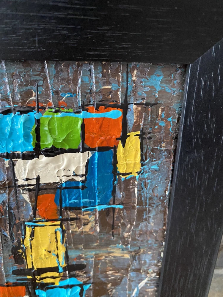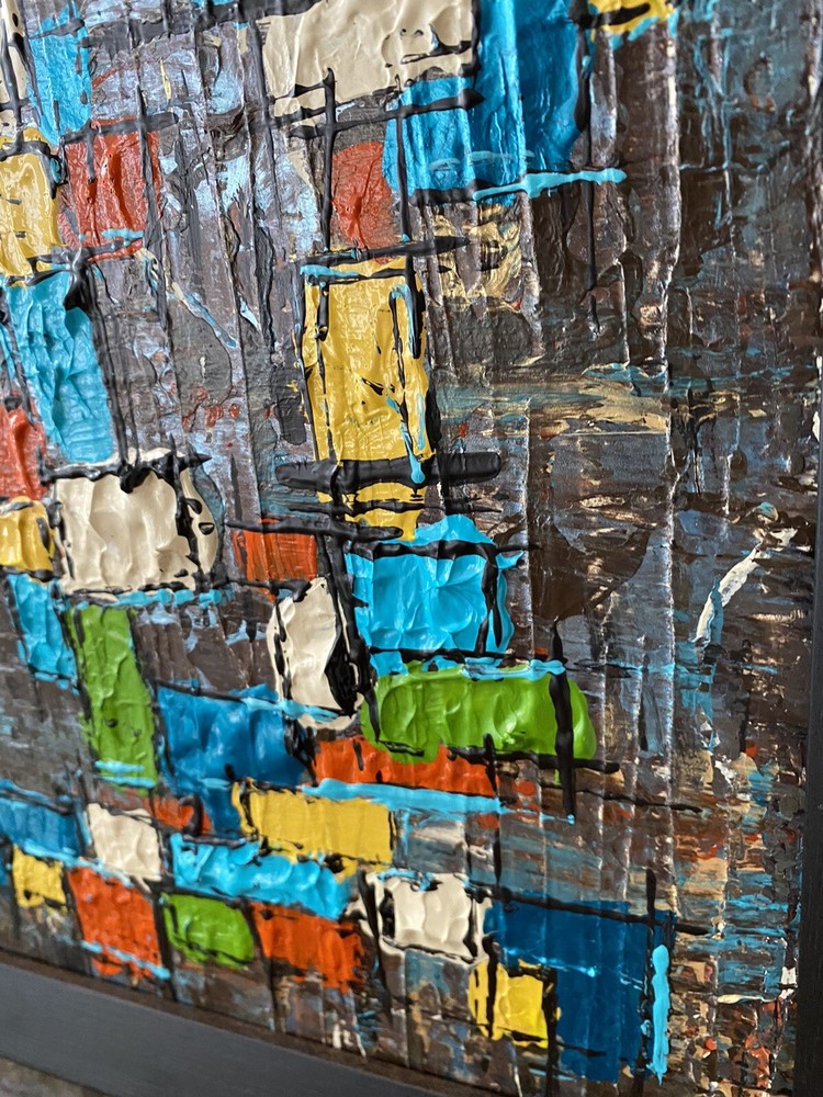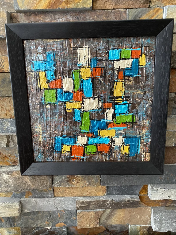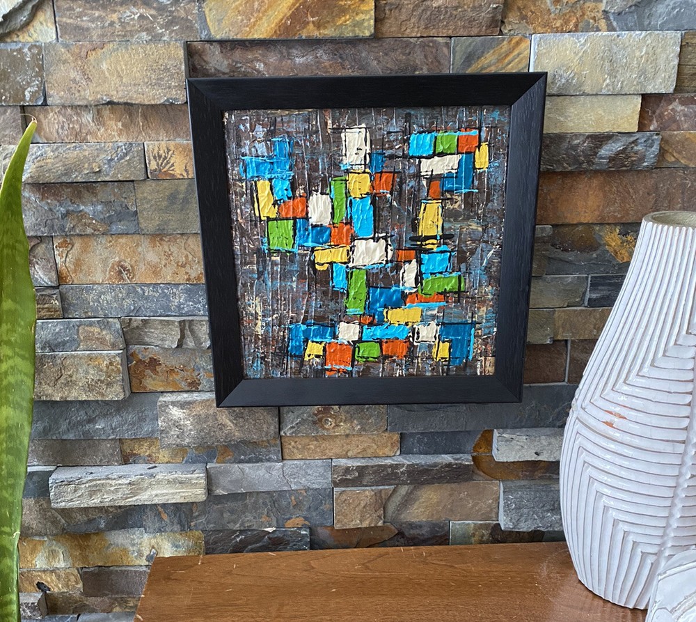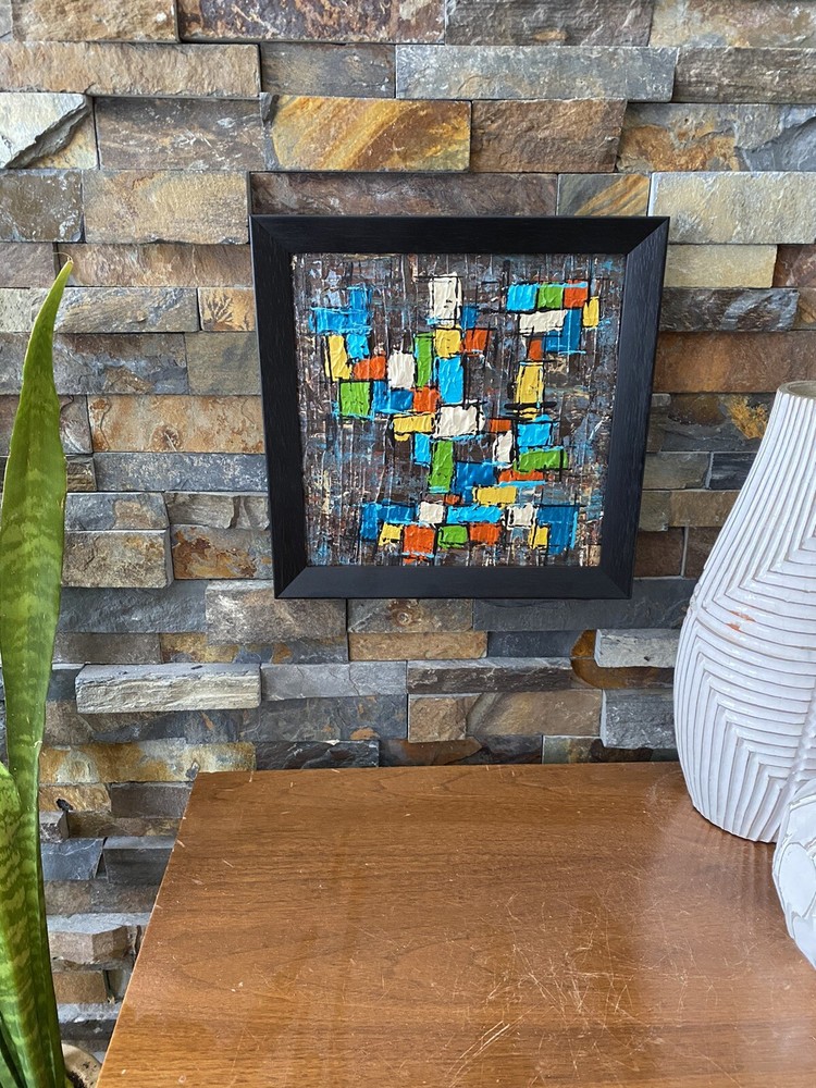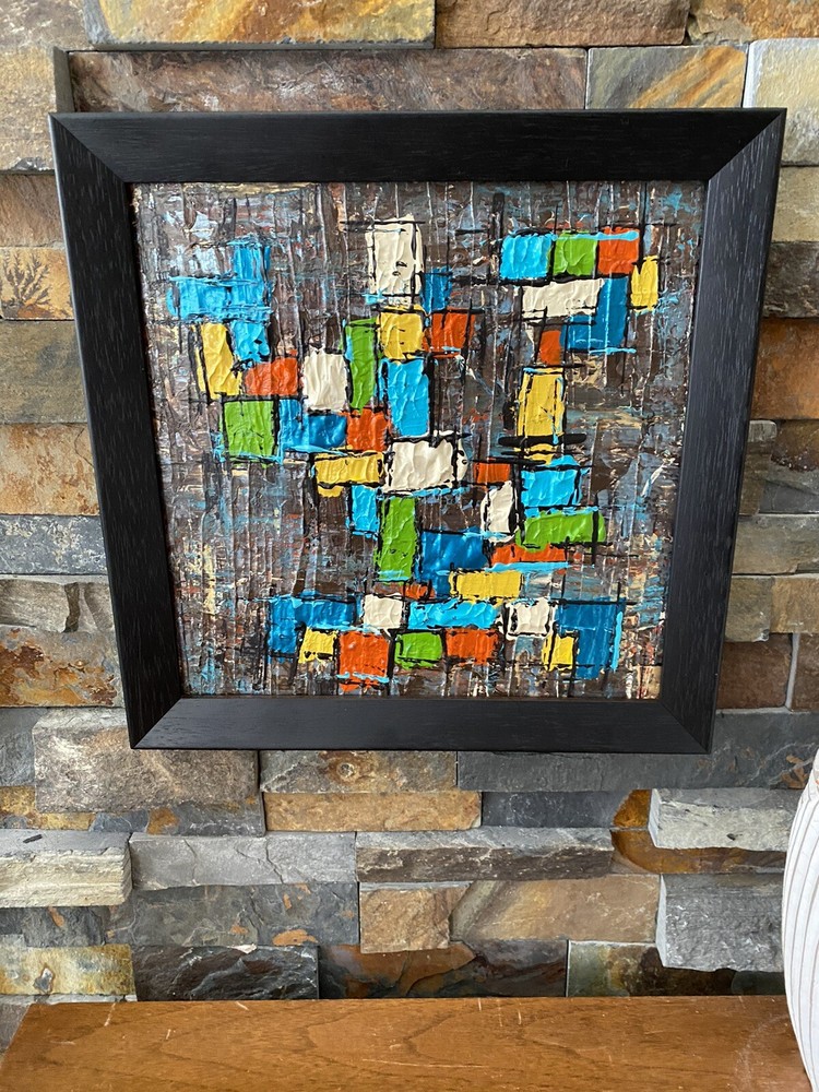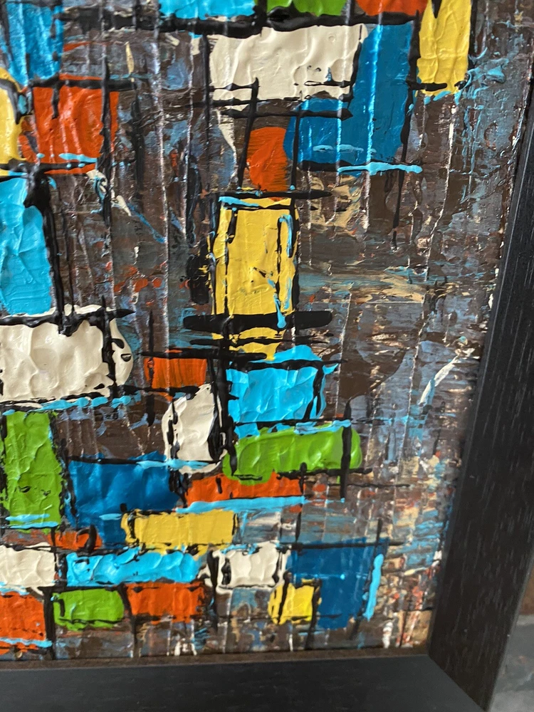 >>>Perfect for your Mid Century Modern Home>>> Original Acrylic Painting Titled- “Fiesta” Original painting in an upcycled free frame included - size with frame is 11” x 11” please note frames are not perfect, but complement the mcm designs. Wonderful MCM abstract design, vibrant layers of color Please ask questions prior to bidding ---- ( any accessories in picture not included ) Will ship within Continental US only ABOUT Me: I paint my passion. I grew up in a paneled ranch house with orange shag rugs and a mod cone fireplace in the den where we all watched the Brady Bunch ... love that floating staircase! My work blends my obsession of anything mid century modern, with my love for using different materials, rich colors and textures, while mixing old with new. Early training on the East Coast supplemented by many trips to California have influenced my style. I am also a Frank Lloyd Wright devotee. A recent excursion to Candlewood Lake has inspired my latest creations. All work is original, never to be duplicated. You deserve unique, one of a kind abstract masterpieces that will be the centerpiece of any room. I want you to smile and be moved every time you look at my art. Please check feedback - 100% satisfied customers.