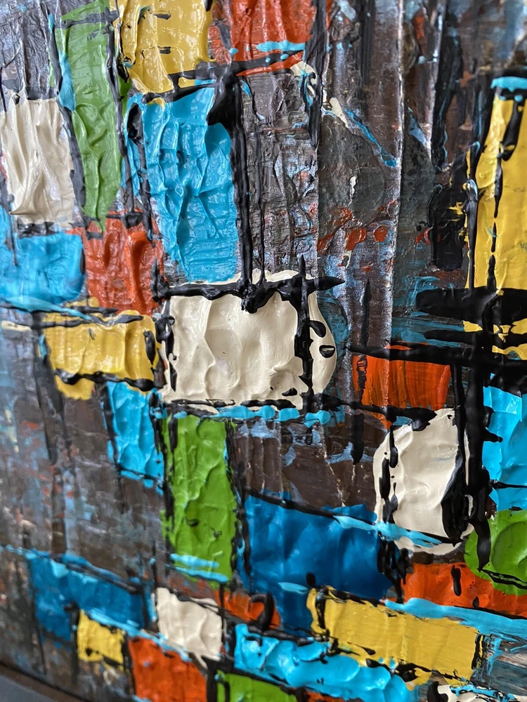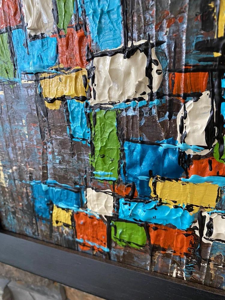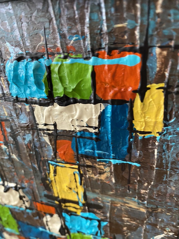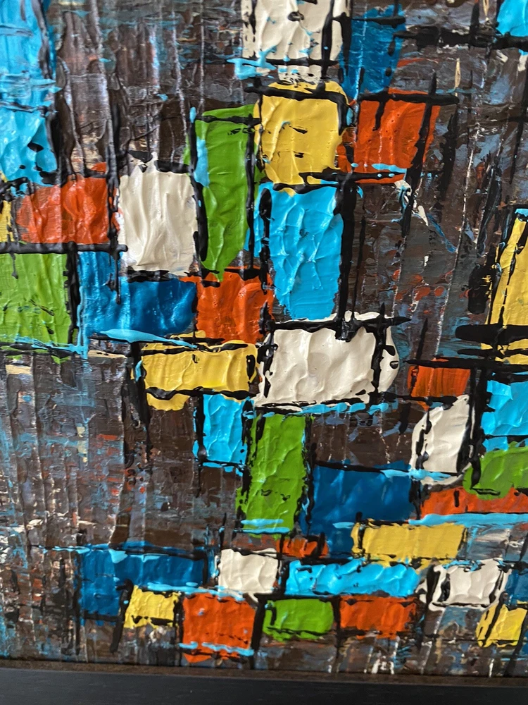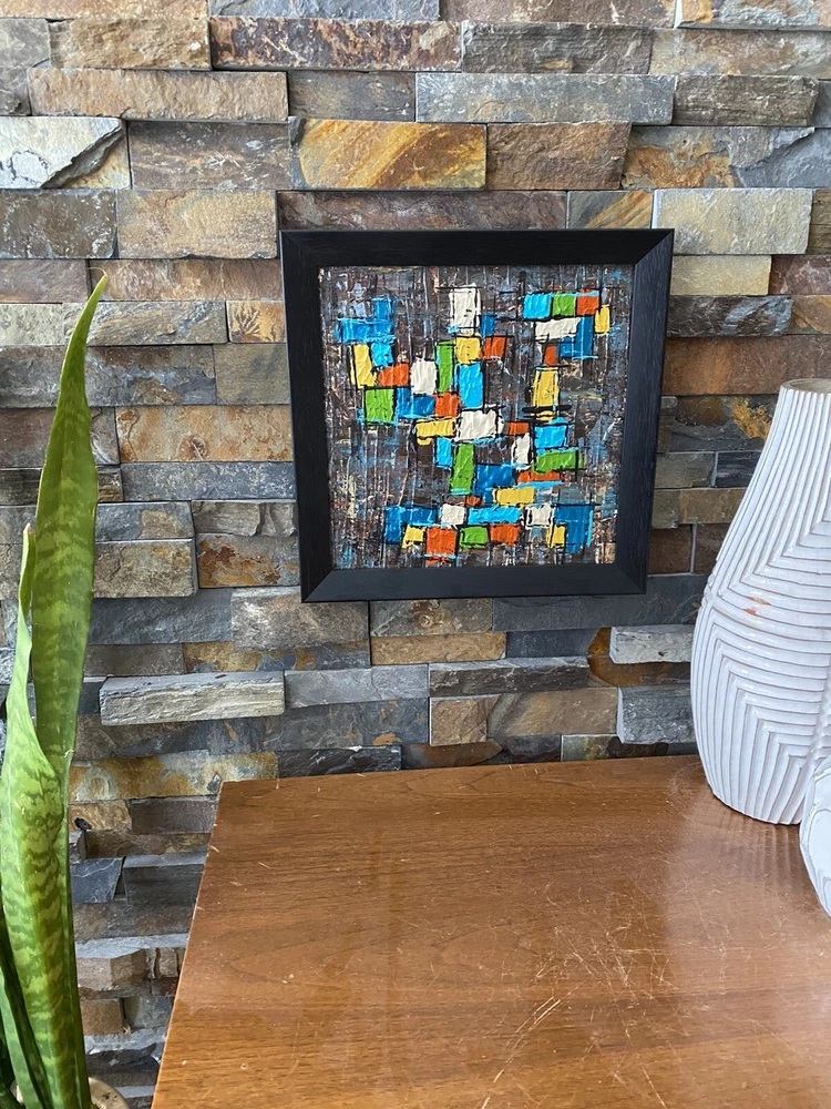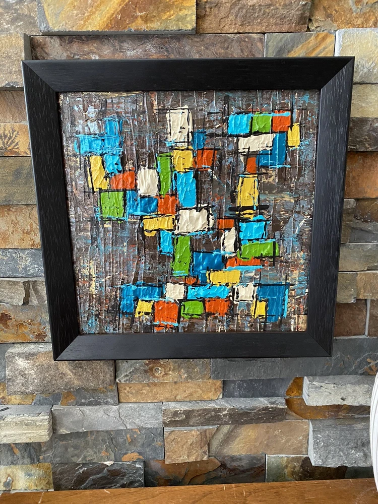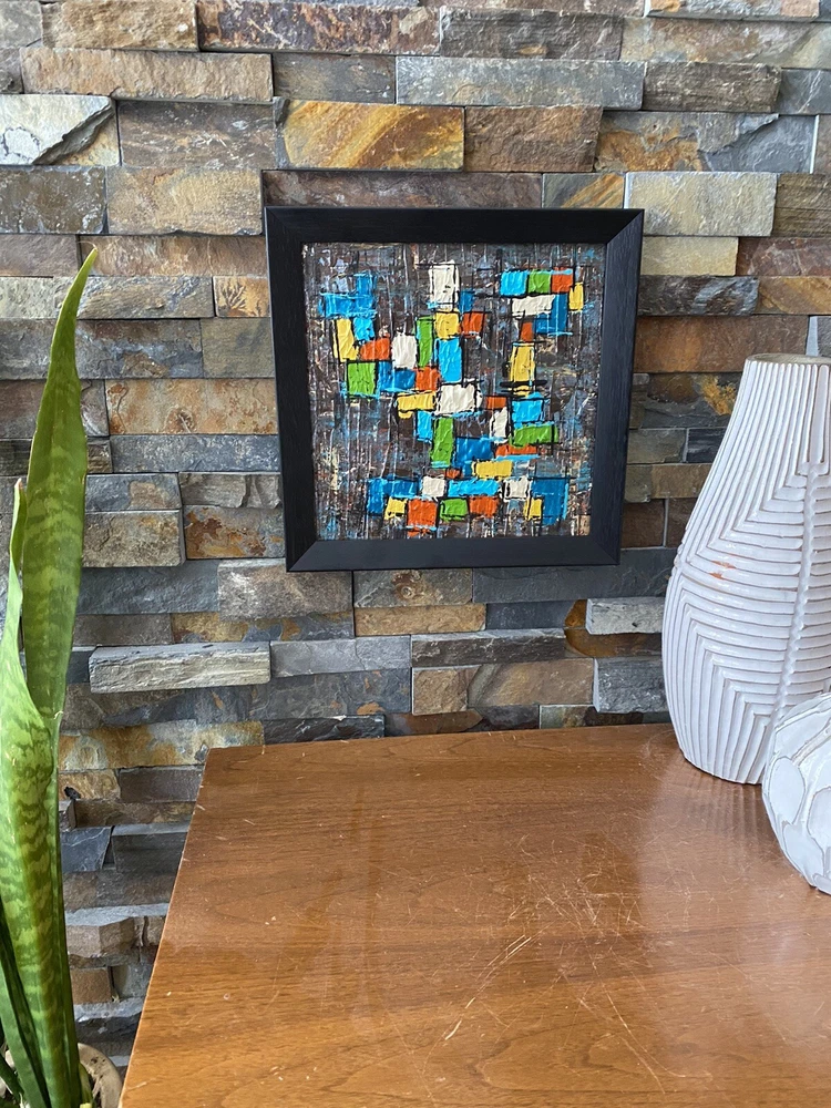 >>>Perfect for your Mid Century Modern Home>>> Original Acrylic Painting Titled- “Fiesta” Original painting in an upcycled free frame included - size with frame is 11” x 11” please note frames are not perfect, but complement the mcm designs. Wonderful MCM abstract design, vibrant layers of color Please ask questions prior to bidding ---- ( any accessories in picture not included ) Will ship within Continental US only ABOUT Me: I paint my passion. I grew up in a paneled ranch house with orange shag rugs and a mod cone fireplace in the den where we all watched the Brady Bunch ... love that floating staircase! My work blends my obsession of anything mid century modern, with my love for using different materials, rich colors and textures, while mixing old with new. Early training on the East Coast supplemented by many trips to California have influenced my style. I am also a Frank Lloyd Wright devotee. A recent excursion to Candlewood Lake has inspired my latest creations. All work is original, never to be duplicated. You deserve unique, one of a kind abstract masterpieces that will be the centerpiece of any room. I want you to smile and be moved every time you look at my art. Please check feedback - 100% satisfied customers.