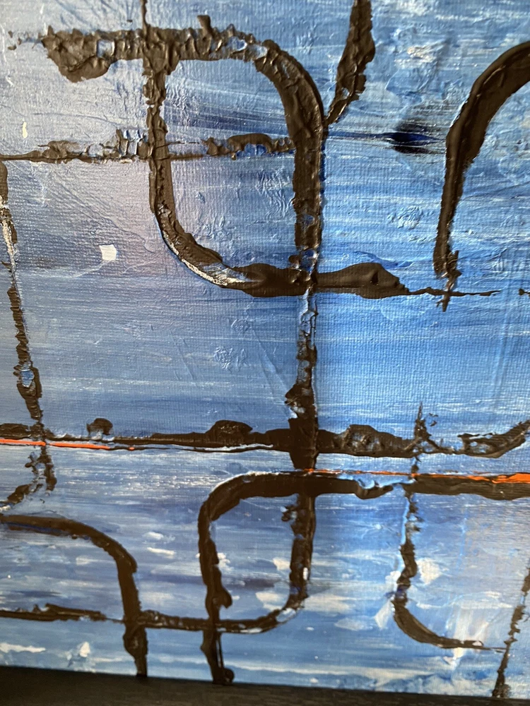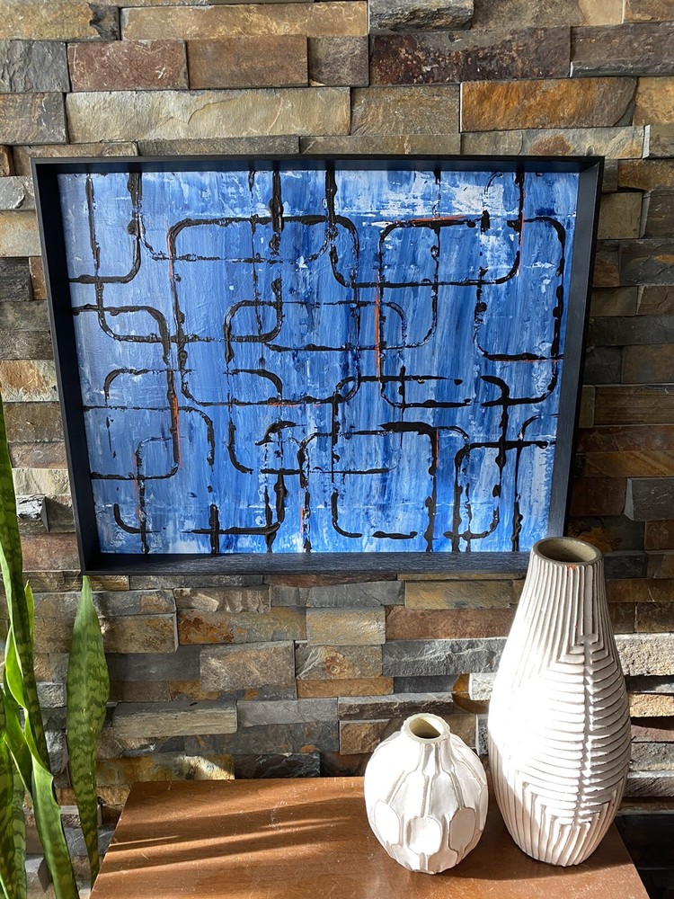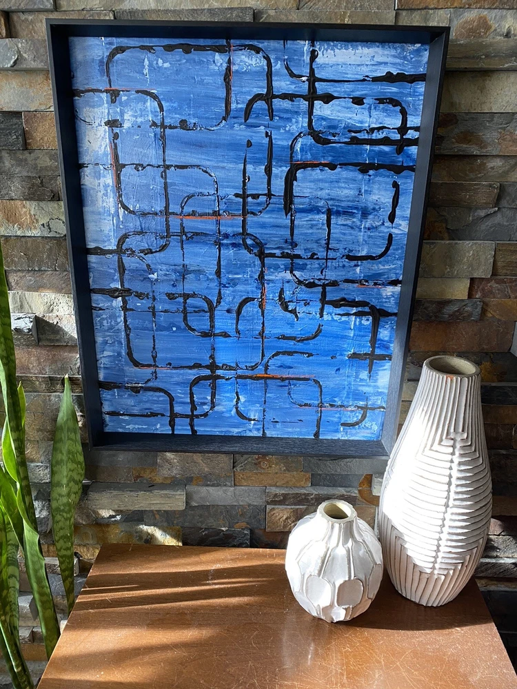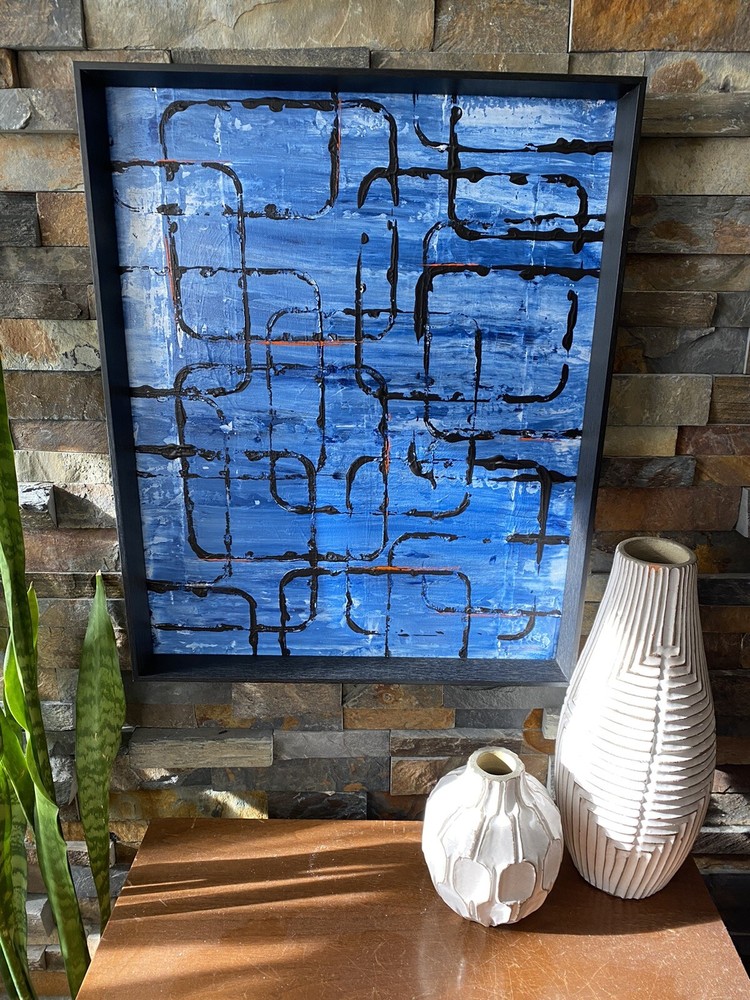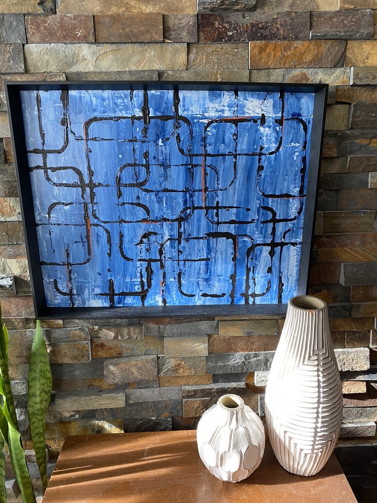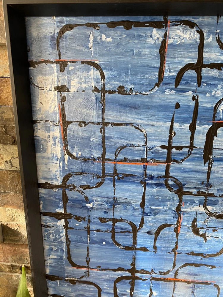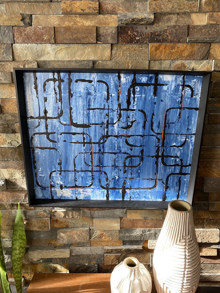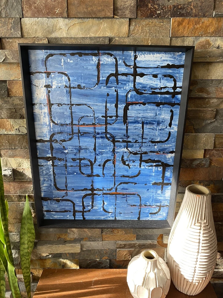 >>>Perfect for your Mid Century Modern Home>>> Original Acrylic Painting Titled- “ Embrace ” 20 3/4” x 16 3/4” with recycled free frame included Wonderful MCM abstract design, layers of vibrant color Please ask questions prior to bidding ---- ABOUT Me: I paint my passion. I grew up in a paneled ranch house with orange shag rugs and a mod cone fireplace in the den where we all watched the Brady Bunch ... ohhh that floating staircase! My work blends my obsession of anything mid century modern, with my love for using different materials, rich colors and textures, while mixing old with new. Early training on the East Coast supplemented by many trips to California have influenced my style. I am also a Frank Lloyd Wright devotee. A recent excursion to Sarasota has inspired my latest creations. All work is original, never to be duplicated. You deserve a unique, one of a kind abstract masterpiece that will be the centerpiece of any room. I want you to smile and be moved every time you look at my art. Please check feedback - 100% satisfied customers.