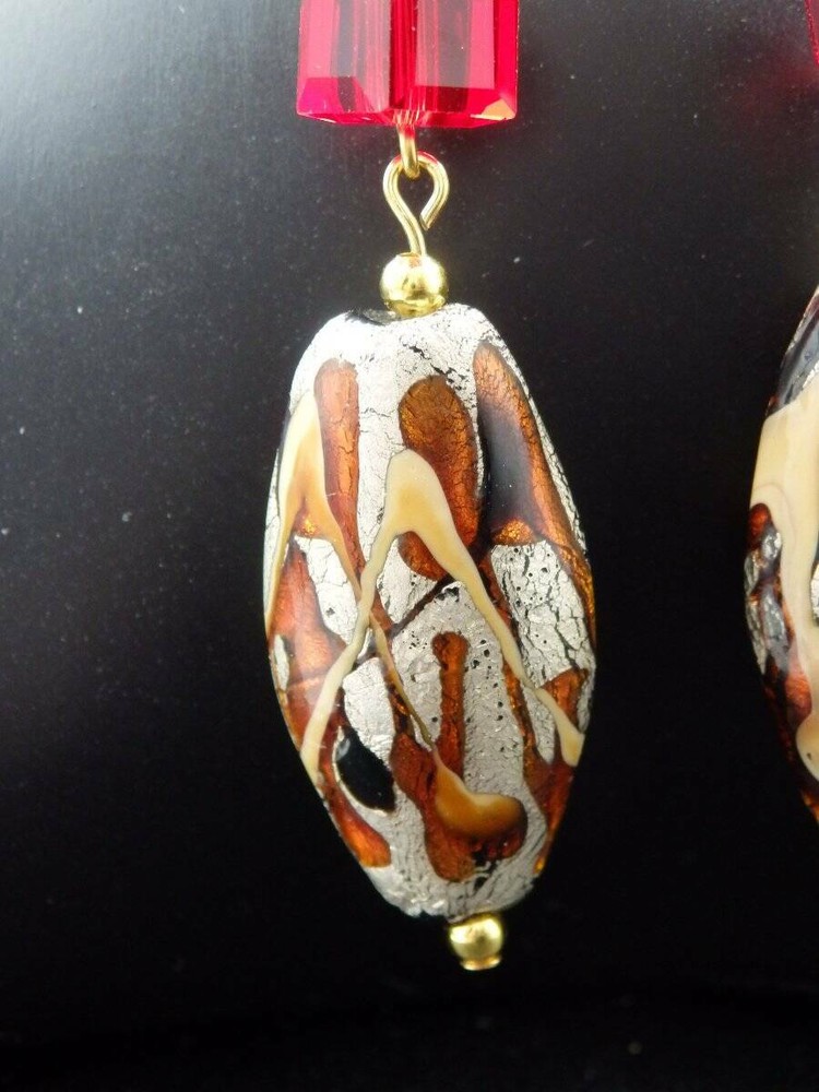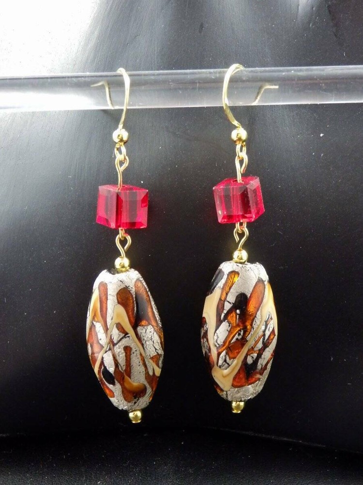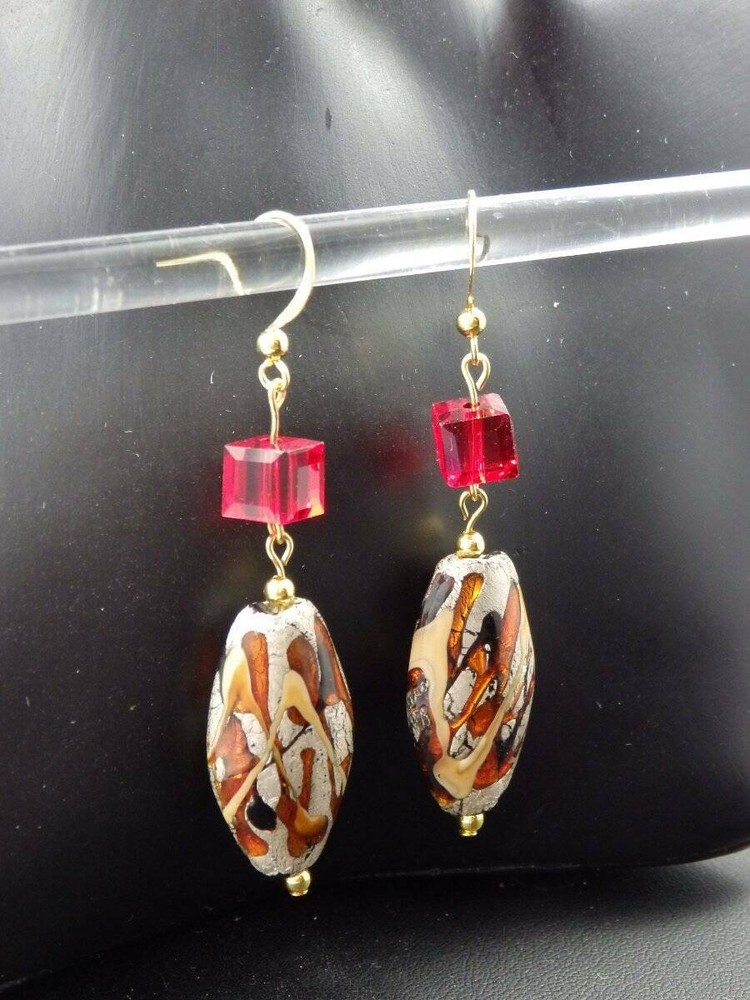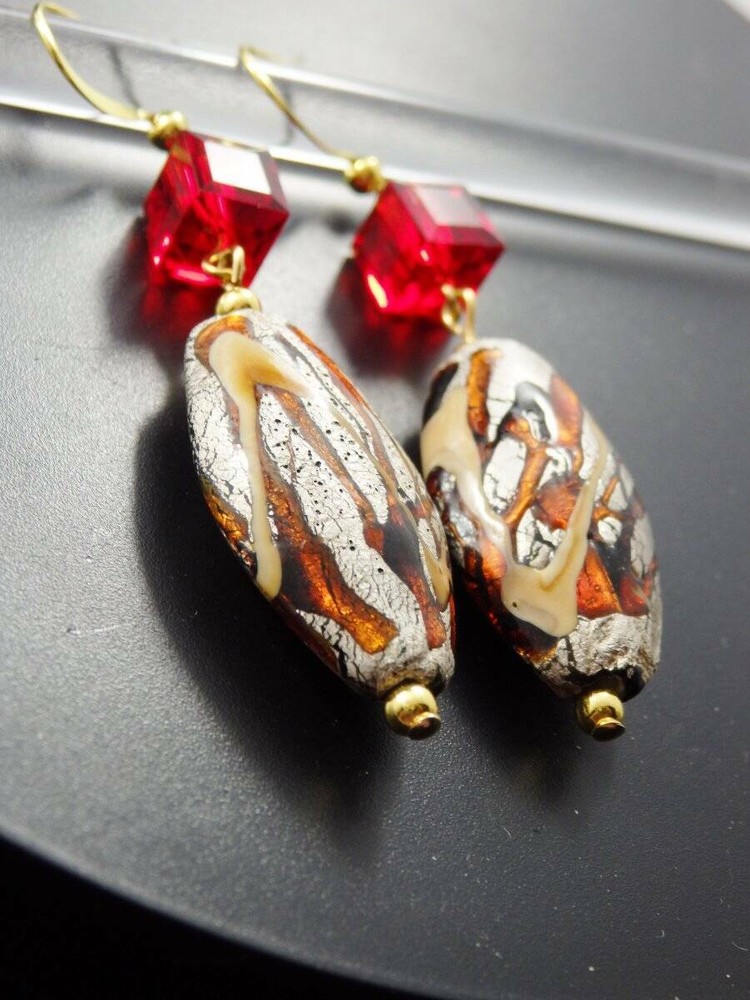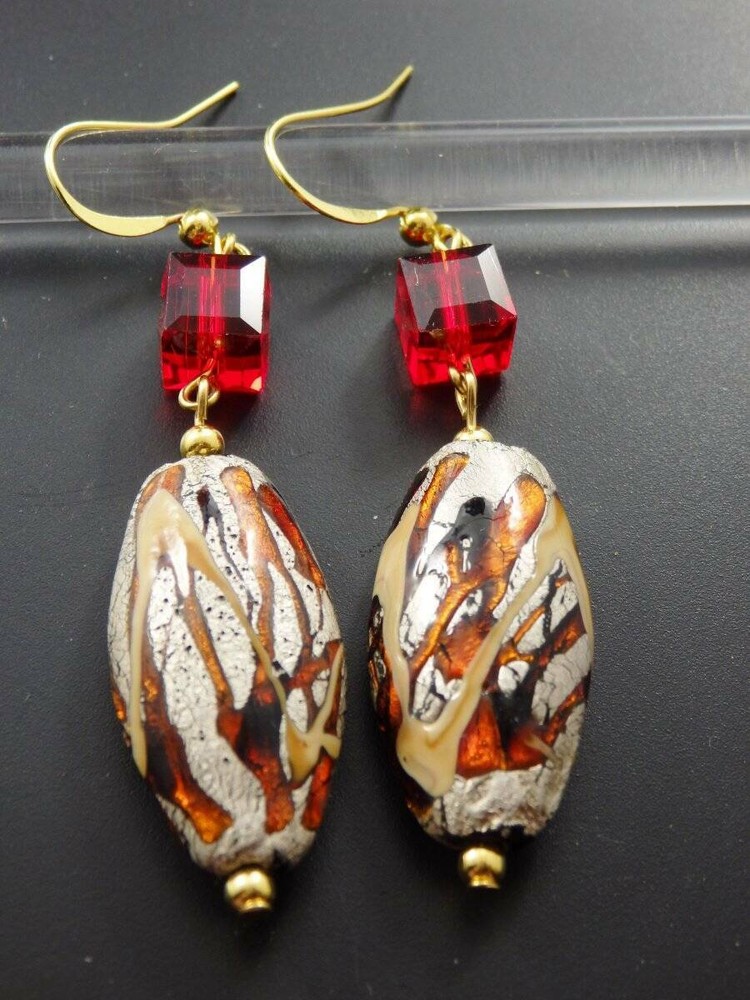 Unique Mid Century Orange, Red Olive Shaped Modernist Glass Dangle Earrings X Click to Enlarge Description These mid century style earrings were made with unique handmade glass beads from the 1960's Flattened olive shaped beads are a modernist mixture of trnasparent and opaque glass Reds and oranges are reminiscent of flames Swarovski crystal cube enchances the top All metals are Gold plated French hooks Earrings are approximately 2.50" x 0.50 The item shown is the one you will receive. Jewelry photographs are taken with a super macro lens. This will cause minor defects to be visible. If these defects are visible to the naked eye, they will be noted in the listing. STORED IN AND SHIPS FROM A SMOKE-FREE ENVIRONMENT I COMBINE SHIPPING FOR MULTIPLE ITEMS See my other listings for more great items! X X Click to Enlarge Click to Enlarge X X Click to Enlarge Click to Enlarge Payment PayPal, Visa, Mastercard, American Express, Discover Payment is expected within 4 days of winning bid or commitment to buy. An automated case will be initiated by EBay after 4 days. Should you need longer to pay, please contact me and I will gladly work with you. Shipping I will ship by the most economical USPS method for size and weight of items purchased. I combine shipping costs for multiple purchases, please request an invoice before you pay Expedited Shipping is available About Vintage Items: The components in my shop date from the 1920's through 1980's, with the majority being from the period of 1930's through 1950's. Please bear in mind that these items are old - ranging in age from 25 to 94 years old and although the majority are New Old Stock (NOS) stored for years when new and never used, they likely may not be in "perfect" condition. There may be small imperfections and signs of age, as can be expected with vintage items of this tenure. If the items have defects or have heavy wear not expected for the age, it will be noted in the description. New components (lever backs, ear wires, jump rings, stampings, etc.) are lead and nickel free MizD Design is my brand name for the original designs that I create using vintage stones and other vintage components along with new findings as indicated in the item description. I spend a great deal of pleasurable time curating high quality authentic old stones and components and I love obtaining unusual and one of a kind stones/pieces that can be incorporated in my designs. I hope that you enjoy viewing/wearing my designs because I enjoyed creating them for you. Other Items Feedback Contact eBay Store Showcase by Seller SourceBook txzj pxzj2834 txzj67