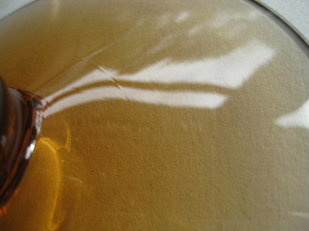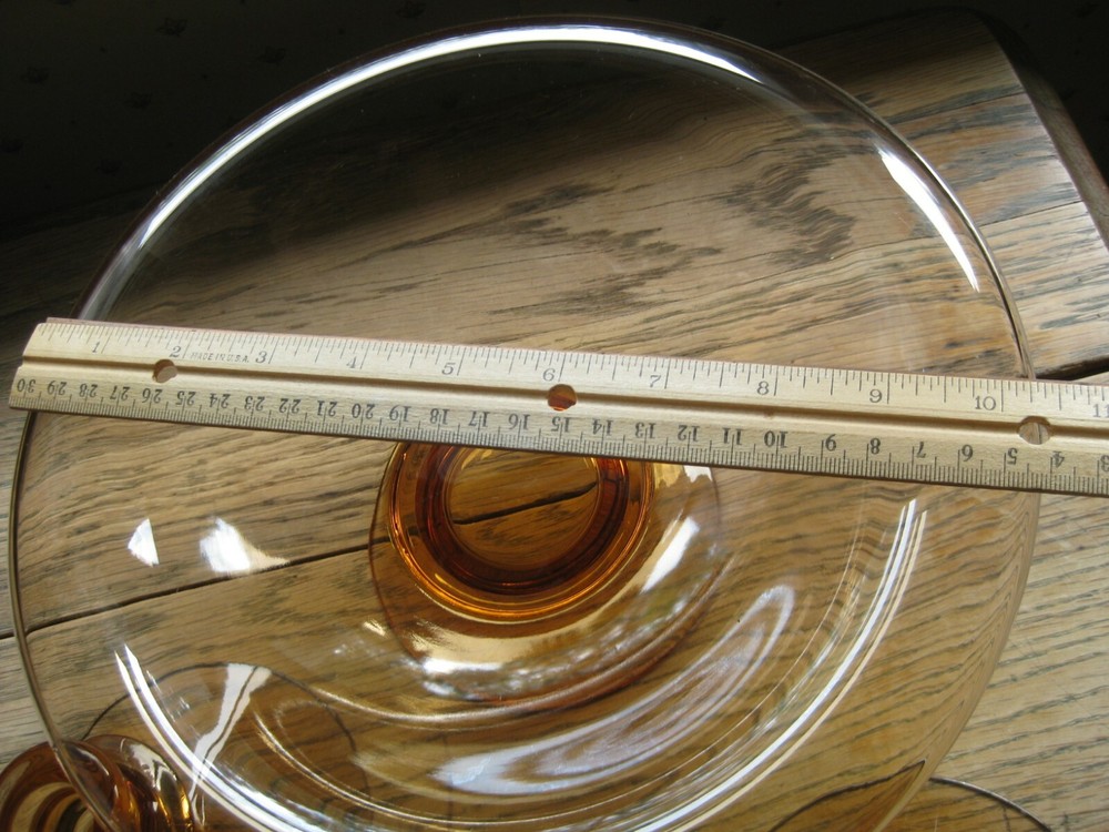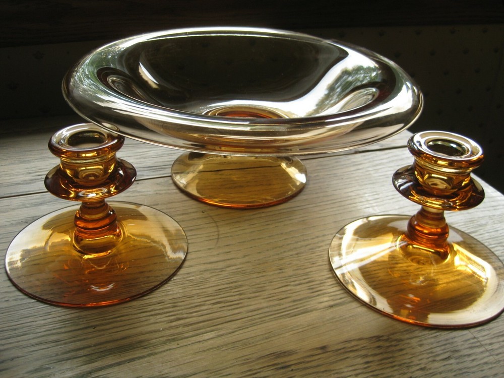 Vintage amber glass 3 piece set, elegant in it's simple lines. No etching which IMO is a plus. The set is nearly perfect with the exception of one candlestick which has a slight teeny tiny track of ever so small marks (like etching only not). So minuscule that it was difficult to get a picture of but I did post one. The set would be outstanding decorated for Halloween and then Thanksgiving!! The set weighs 3 3/4 lbs. I double bubble and double box all fragiles. Please see pictures for ruler'd measurements. Please view my Ebay seller feedback where buyers have commented positively about the quality of my items and the exceptional packaging. Thank you for stopping by