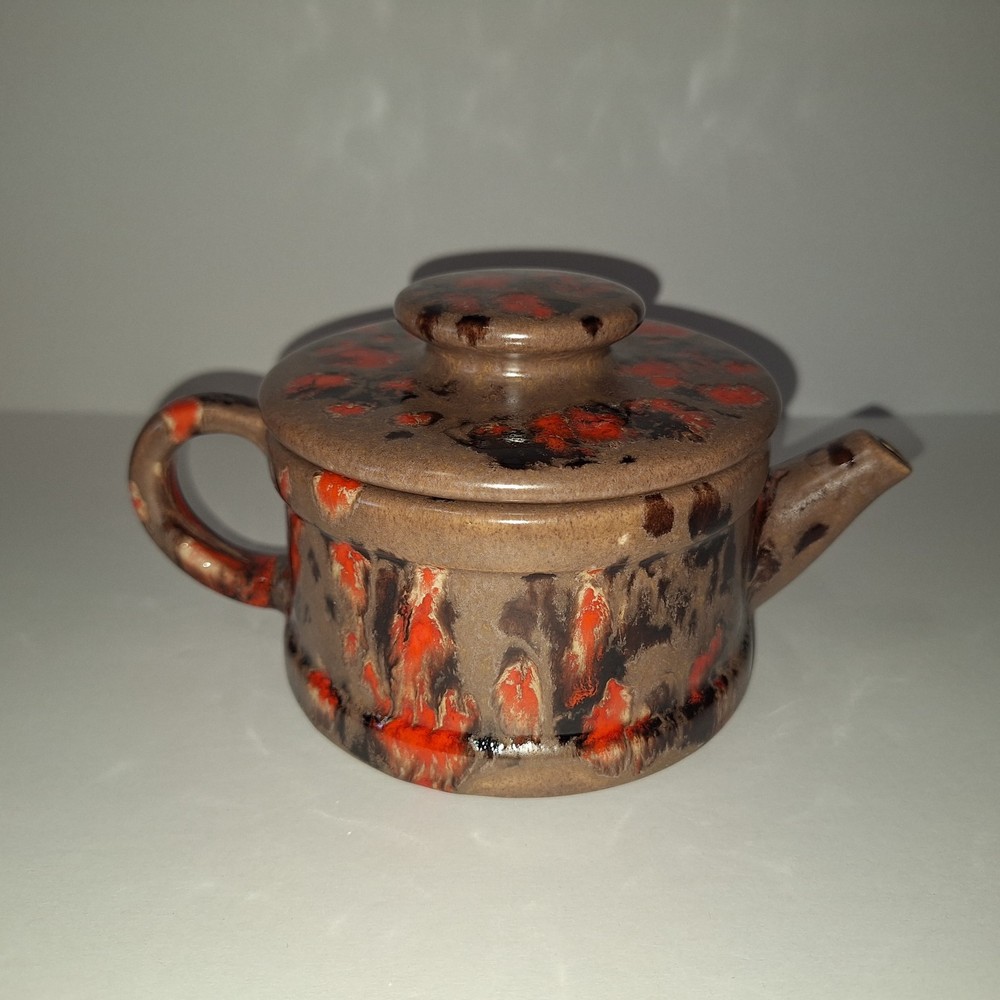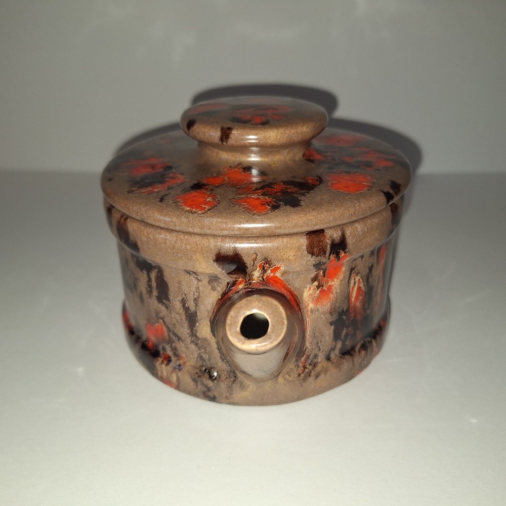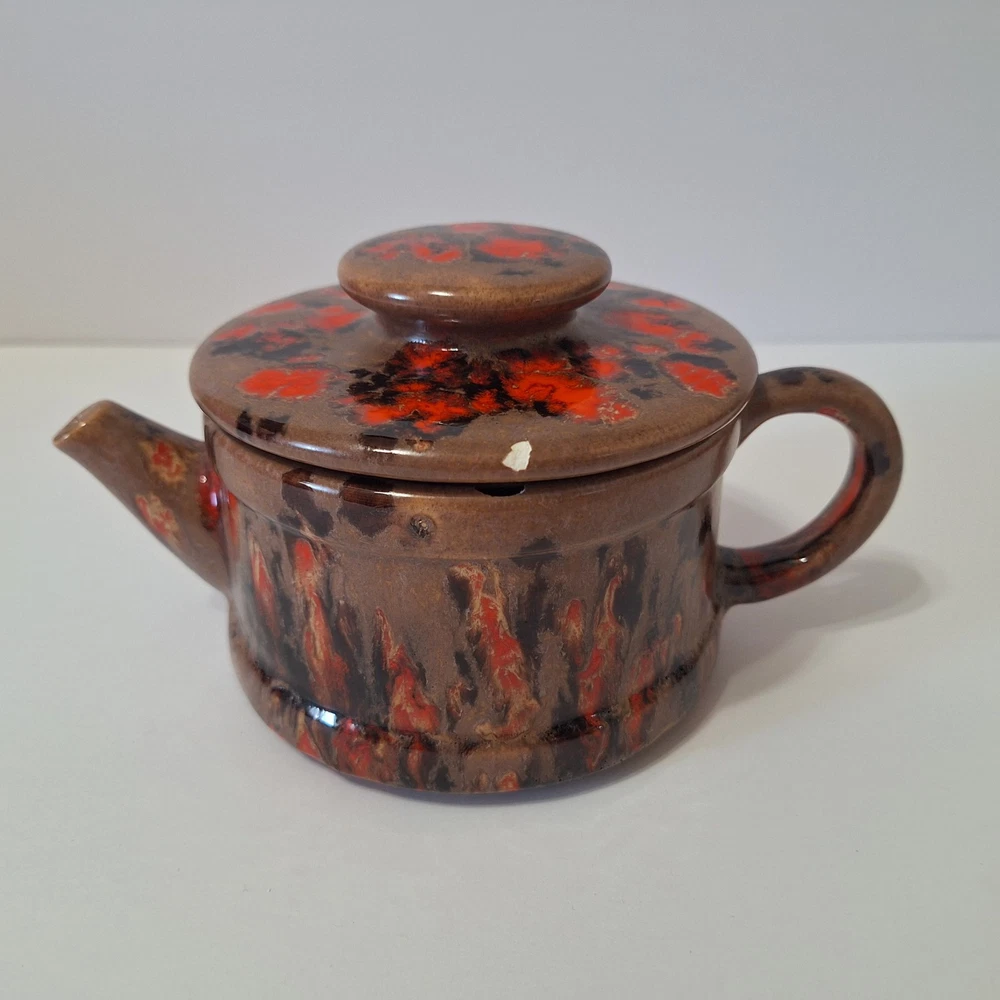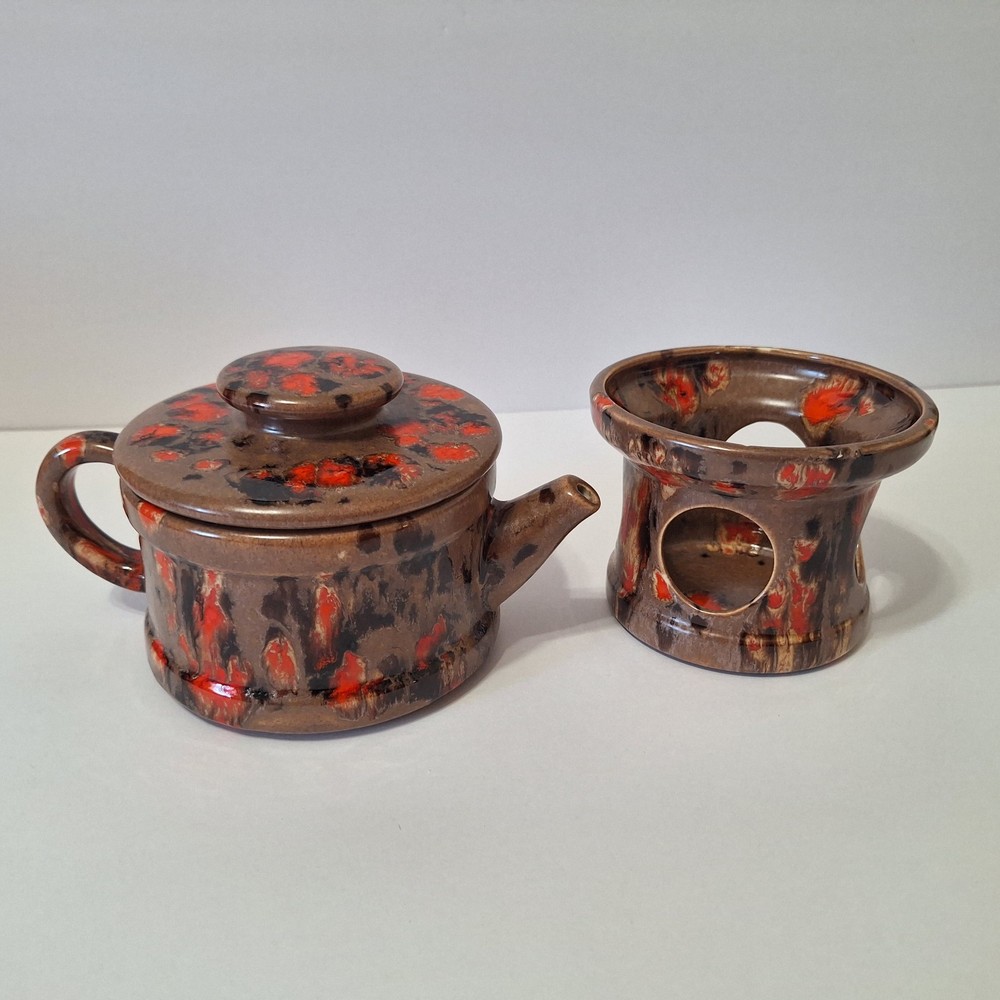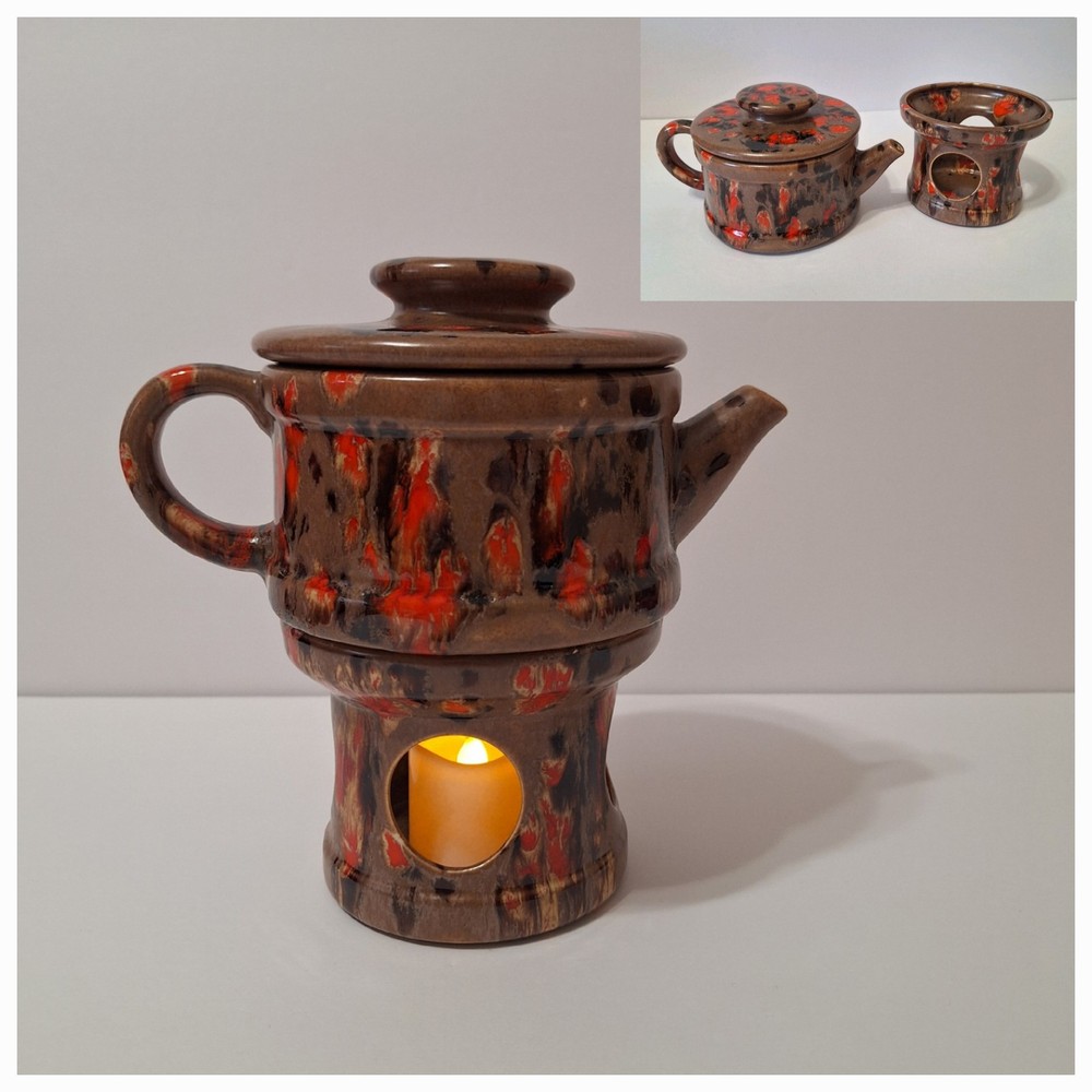 This Mid Century Modern "Artist Pottery" 3-Piece Tea Set includes a round 🫖 tea pot with lid and a🕯 candle warmer. The set is glazed in a matte chocolate brown and speckled with a glossy, vibrant orange drip glaze popular in the 1960s. The tea pot measures 7 inches in length, 4 inches in width, and 2.5 inches in depth, while the warmer is 3.25 inches high. This original art pottery set is a unique addition to any vintage MCM collection. This item is in Very Good "pre-owned" condition for its age and prior use. The colors are still vivid and bright. There are no cracks or repairs. There is one chip in the lid and corresponding rim of the tea pot. (Tealight candle not included, for display only) Please see all photos 📸. This item comes from a smoke-free home. I have described it as accurately as possible. Please see all photos and ask questions before bidding or purchasing. Colors displayed can be affected by monitor settings, so I do my best to ensure that the color is presented accurately. It is shipped by USPS Ground Advantage or the most economical USPS shipping option. 🧩🧩 Please check out my other items at Kdhaz6400f8o. Thank you for looking!! 😊