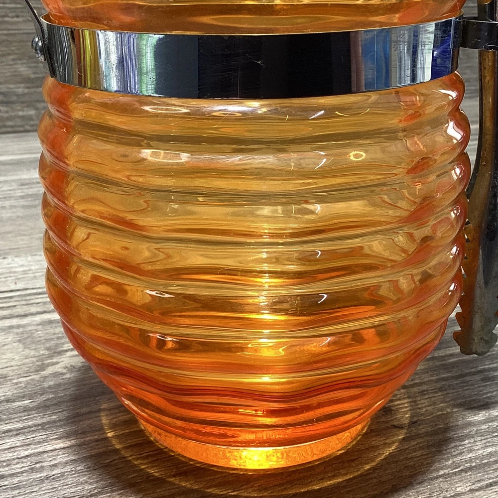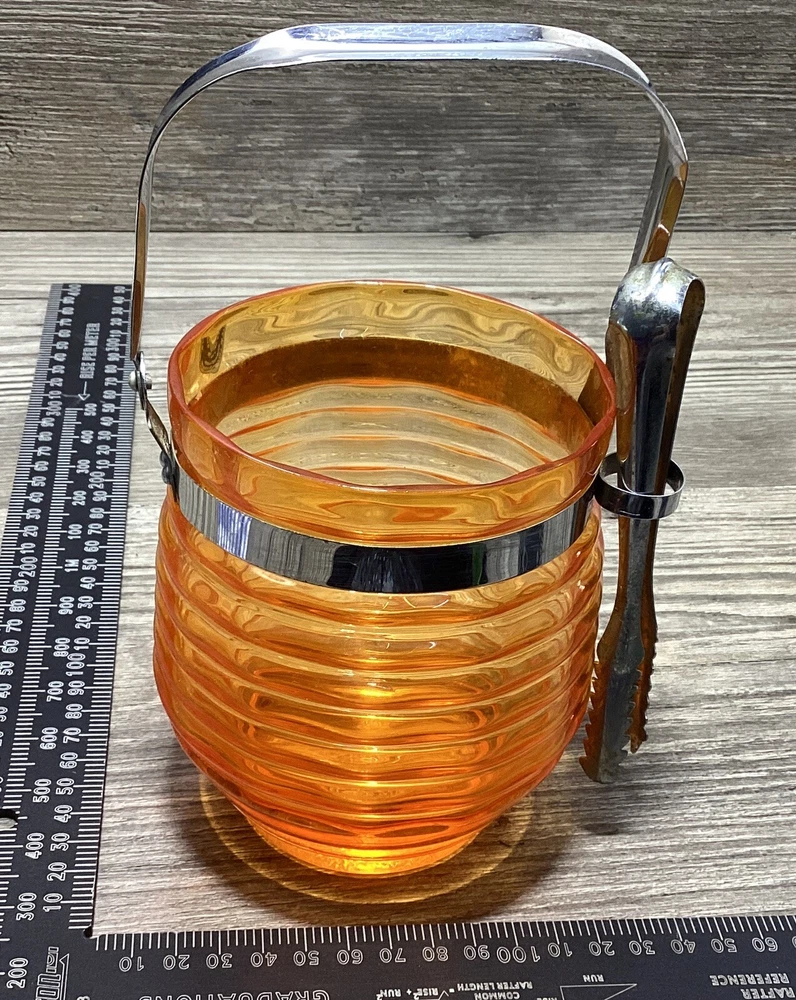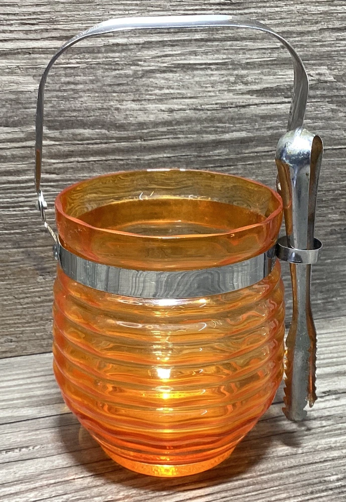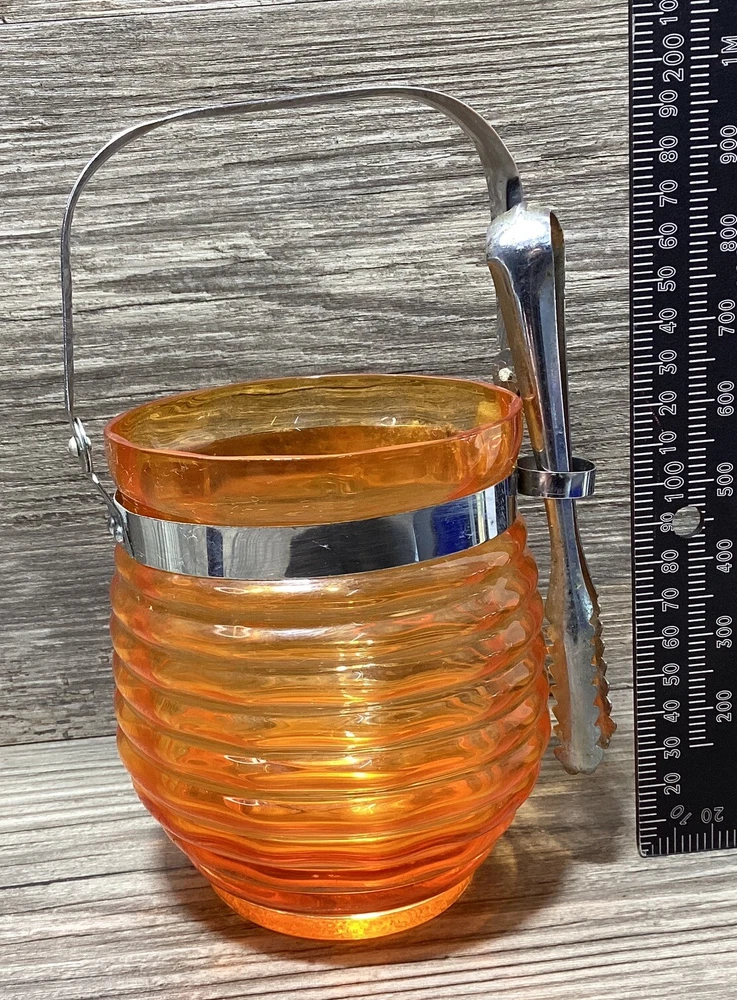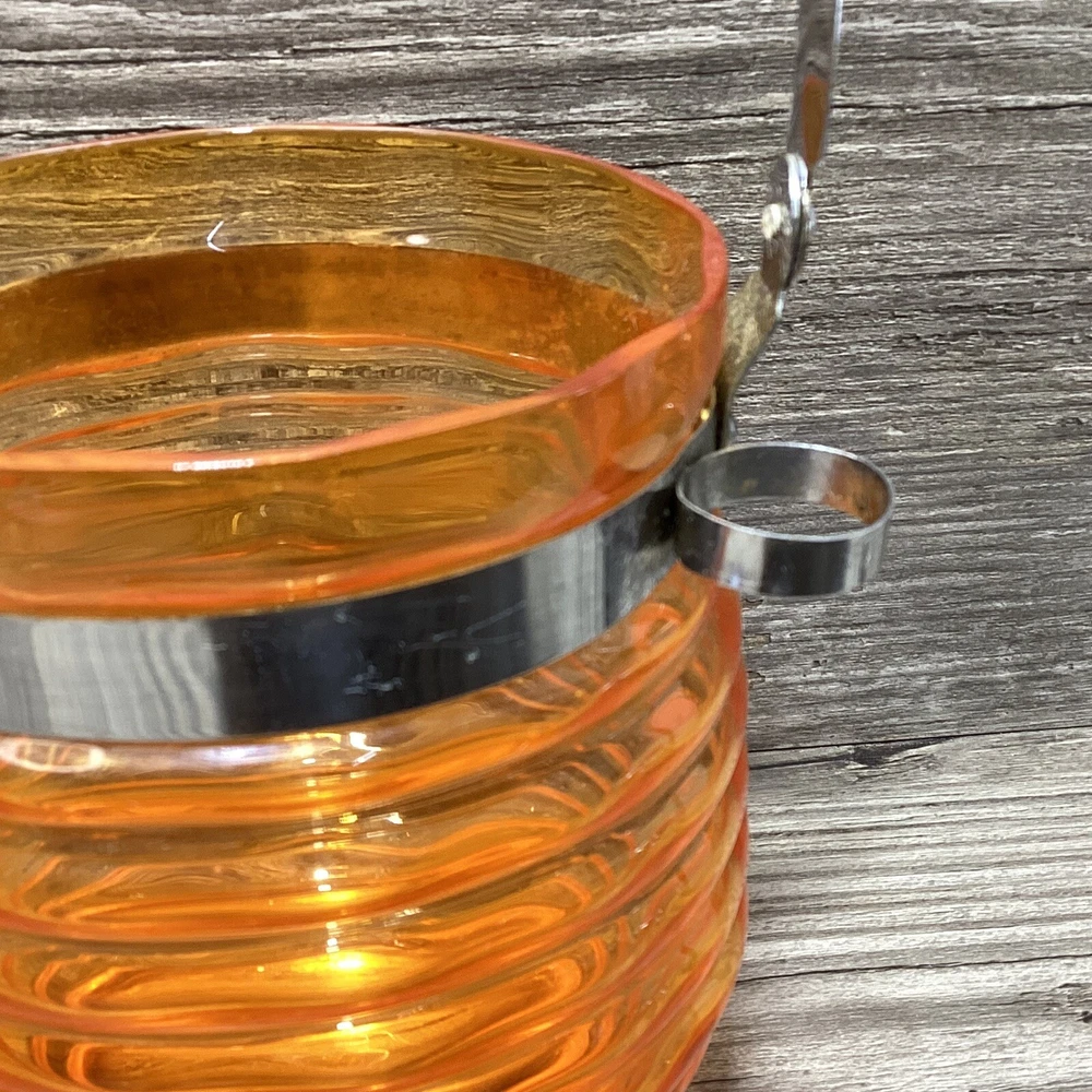 Add a touch of vintage charm to your barware collection with this stunning Orange Beehive Glass Silver Brassware Metal Ice Bucket. The mid-century modern style ice bucket comes with tongs included and features a beautiful orange ribbed glass design, adding a pop of colour to your home bar. The item diameter is 11cm while the item height, including handle, is 19.5cm, making it the perfect size for holding ice and keeping your drinks cool. Crafted from high-quality glass material, this ice bucket is both stylish and durable. The silver brassware metal handle adds an extra touch of elegance, making it a great addition to any special occasion. At 14cm in width, it is a great size for displaying and using while entertaining guests. Perfect for all occasions, this vintage ice bucket is a must-have for any home bar collector. The tongs do have pitting/tarnish as shown in the photos.