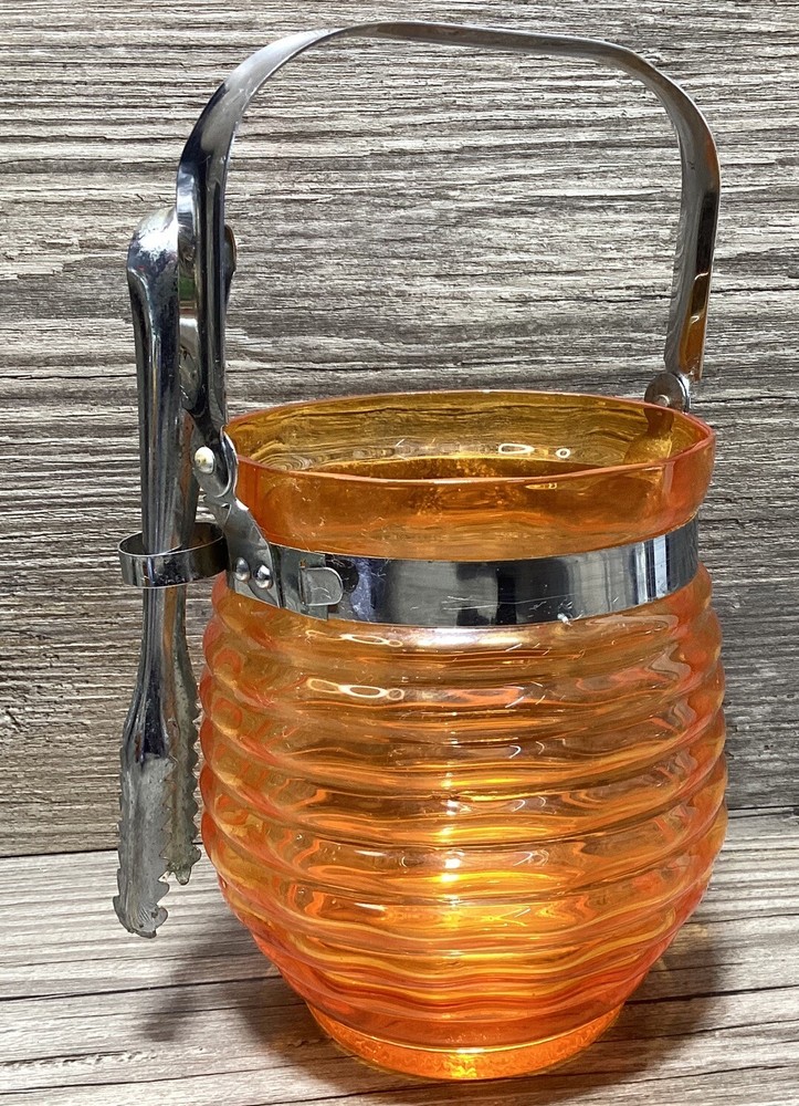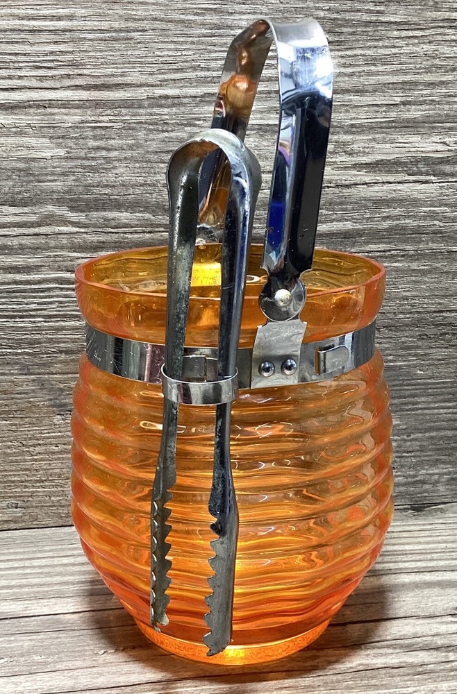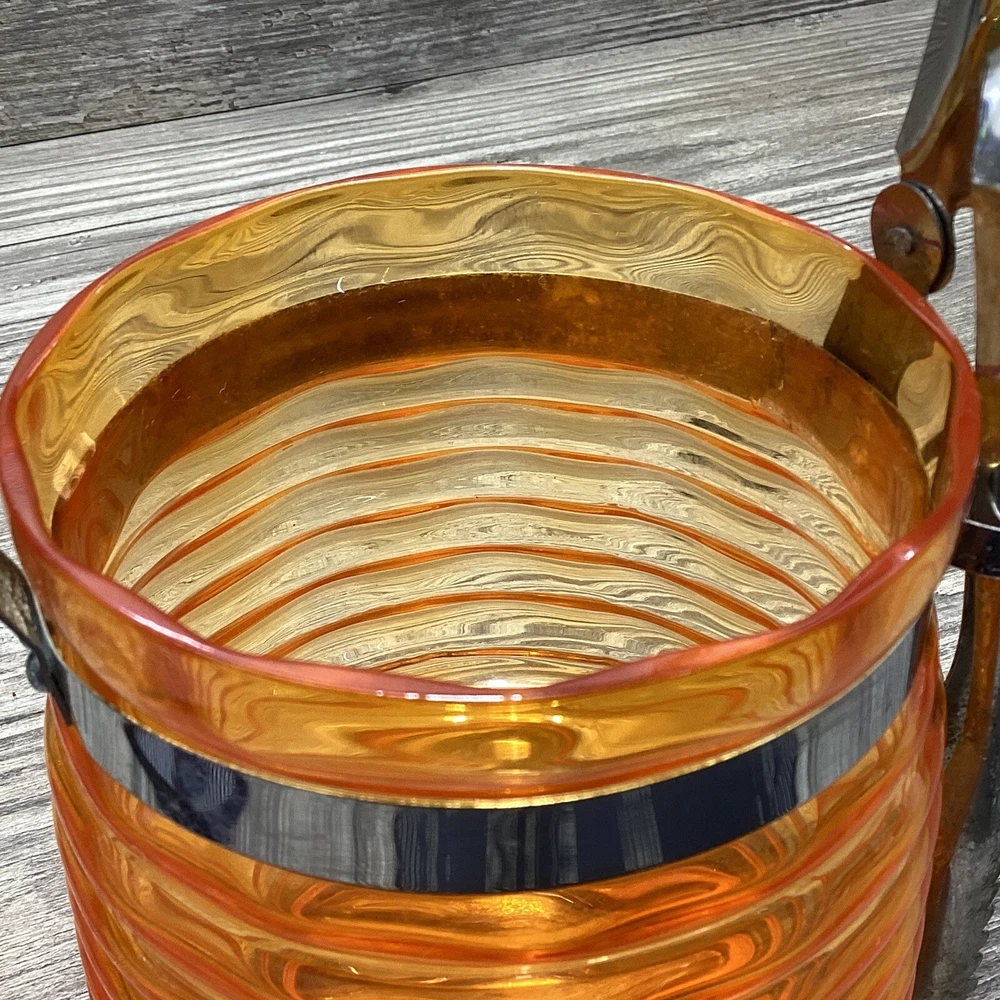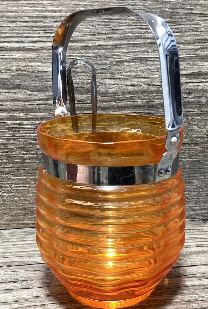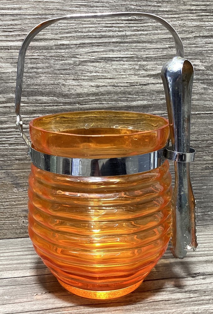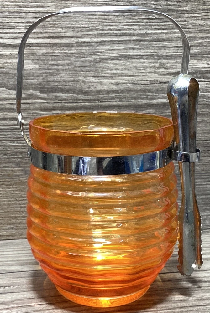 Add a touch of vintage charm to your barware collection with this stunning Orange Beehive Glass Silver Brassware Metal Ice Bucket. The mid-century modern style ice bucket comes with tongs included and features a beautiful orange ribbed glass design, adding a pop of colour to your home bar. The item diameter is 11cm while the item height, including handle, is 19.5cm, making it the perfect size for holding ice and keeping your drinks cool. Crafted from high-quality glass material, this ice bucket is both stylish and durable. The silver brassware metal handle adds an extra touch of elegance, making it a great addition to any special occasion. At 14cm in width, it is a great size for displaying and using while entertaining guests. Perfect for all occasions, this vintage ice bucket is a must-have for any home bar collector. The tongs do have pitting/tarnish as shown in the photos.
