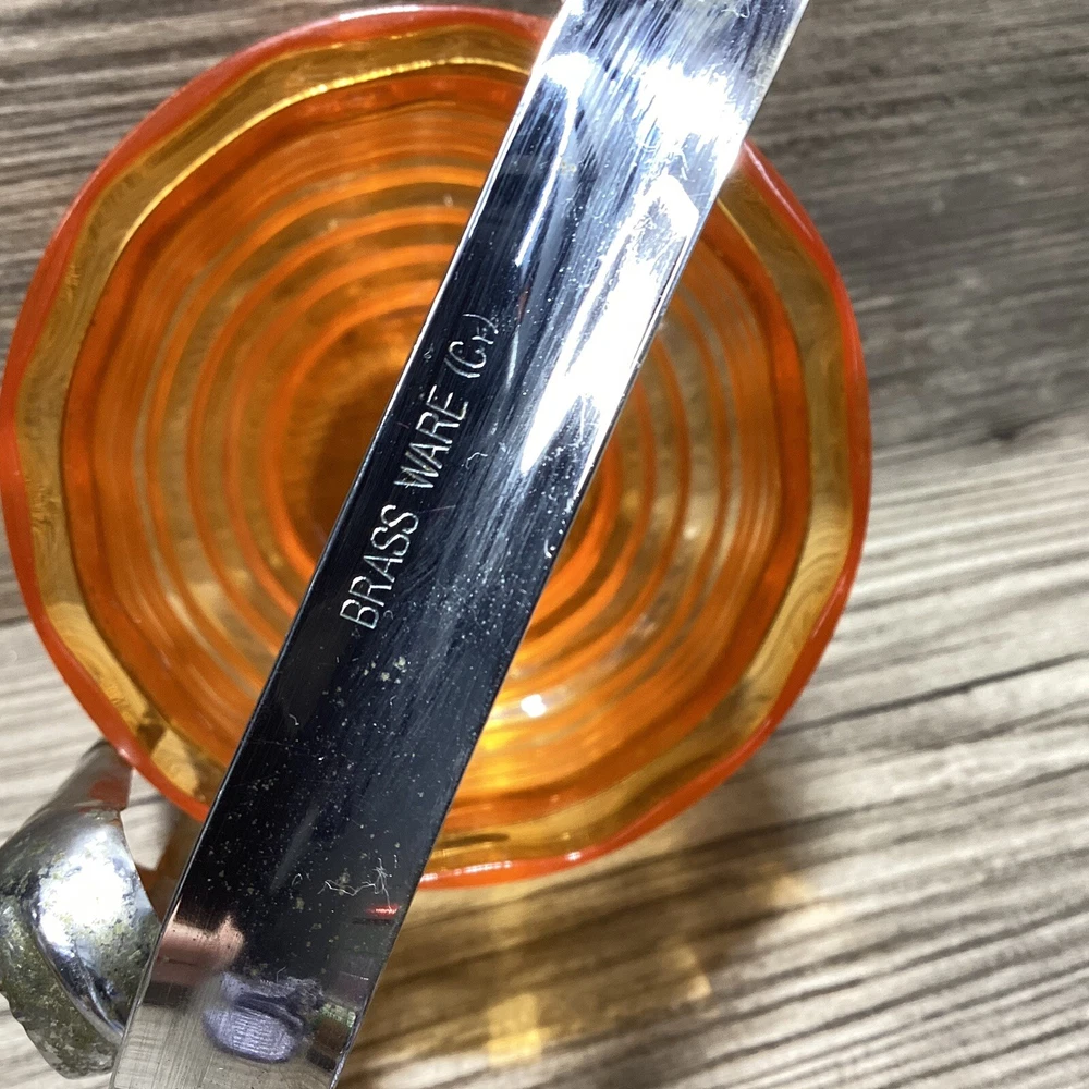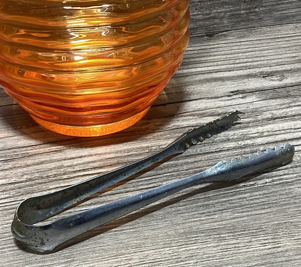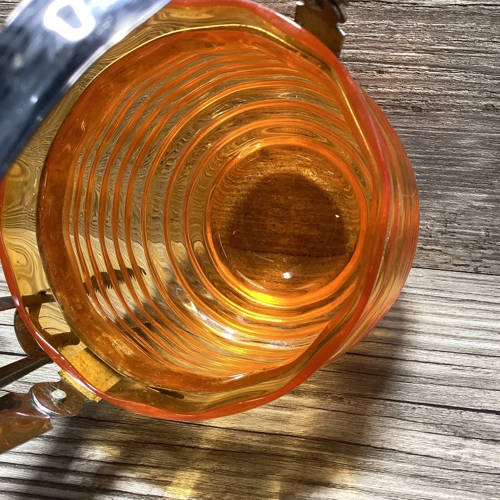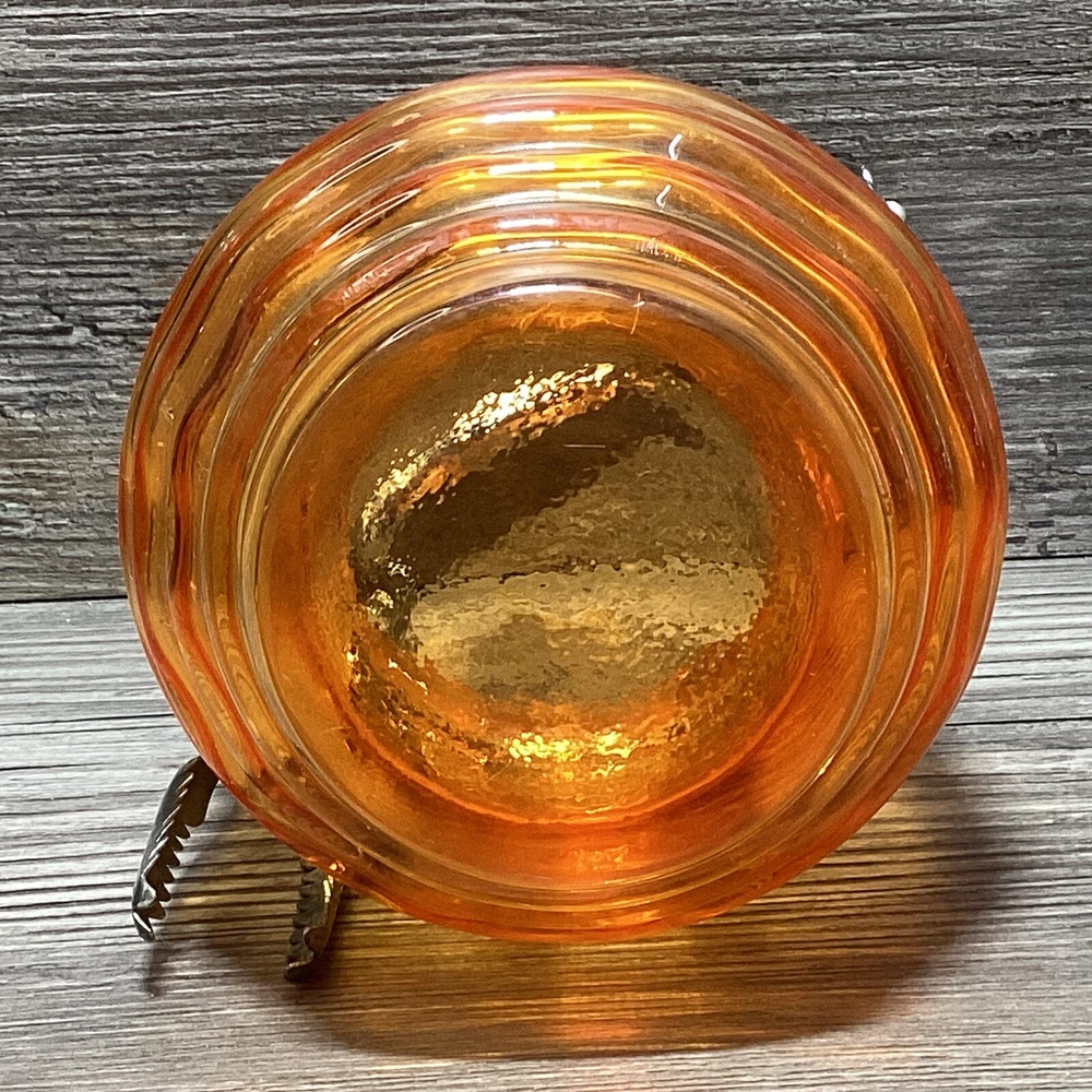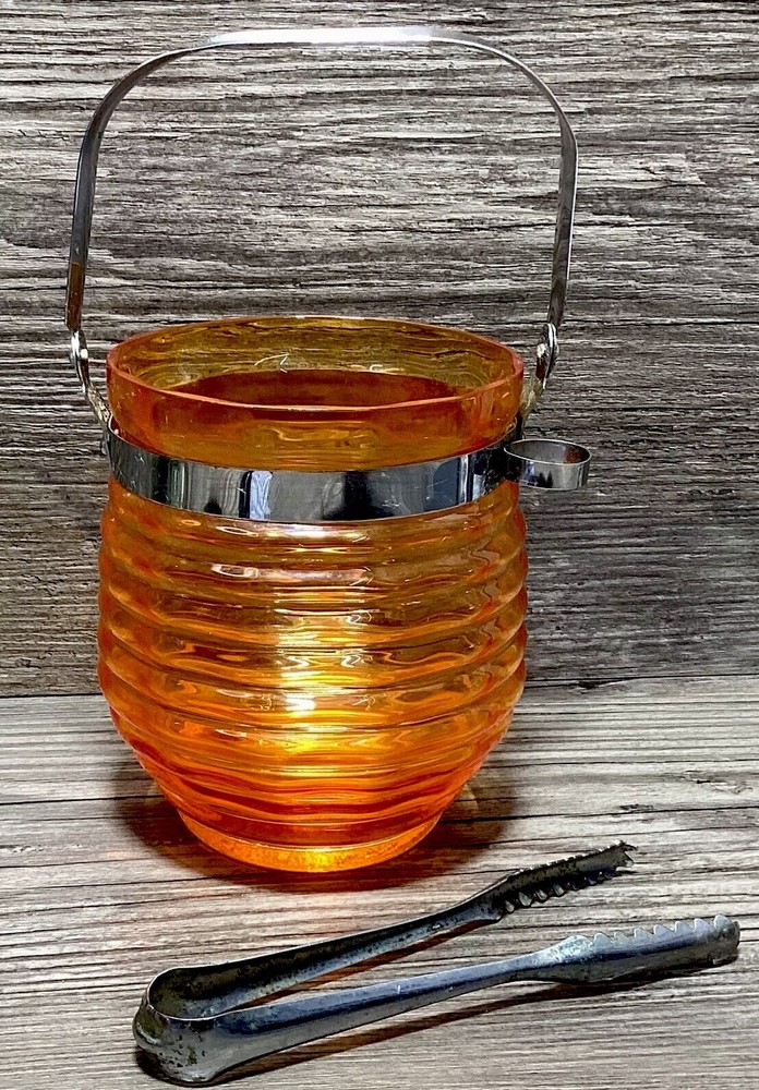 Add a touch of vintage charm to your barware collection with this stunning Orange Beehive Glass Silver Brassware Metal Ice Bucket. The mid-century modern style ice bucket comes with tongs included and features a beautiful orange ribbed glass design, adding a pop of colour to your home bar. The item diameter is 11cm while the item height, including handle, is 19.5cm, making it the perfect size for holding ice and keeping your drinks cool. Crafted from high-quality glass material, this ice bucket is both stylish and durable. The silver brassware metal handle adds an extra touch of elegance, making it a great addition to any special occasion. At 14cm in width, it is a great size for displaying and using while entertaining guests. Perfect for all occasions, this vintage ice bucket is a must-have for any home bar collector. The tongs do have pitting/tarnish as shown in the photos.