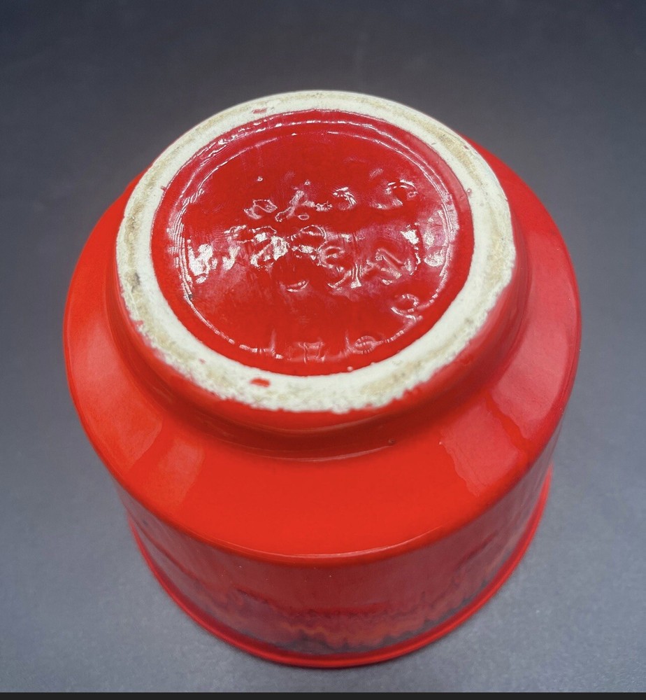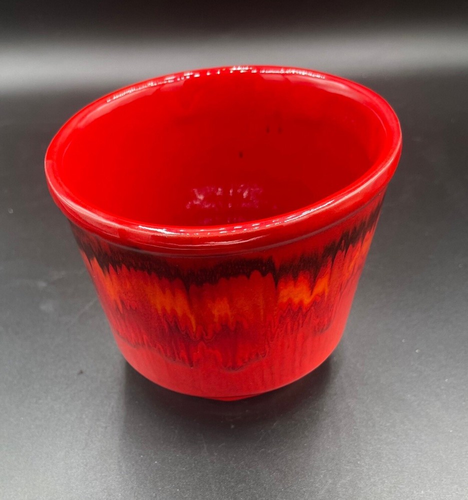 Mid Century Modern Orange Red Drip Flower Pot Bowl. Beautiful glaze. No flaws. Pottery stamp is etched in the bottom. It is hard to read because of the glazing, but is readable with effort. No cracks or chips. 5” across. 4” high.