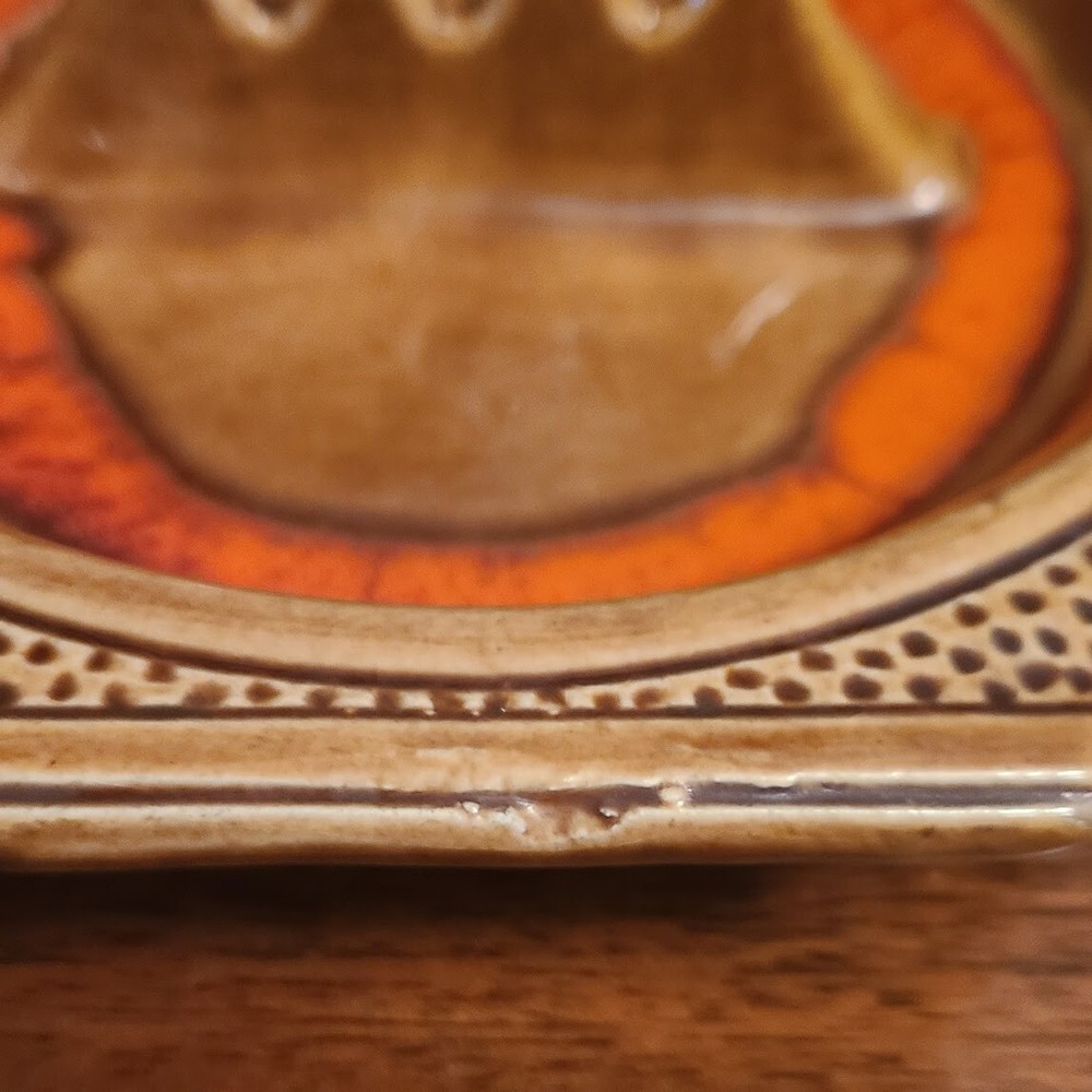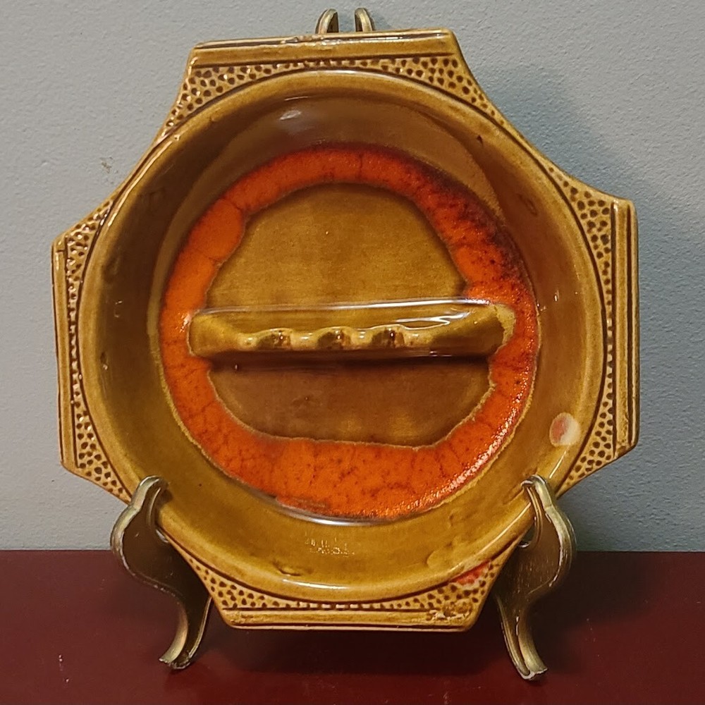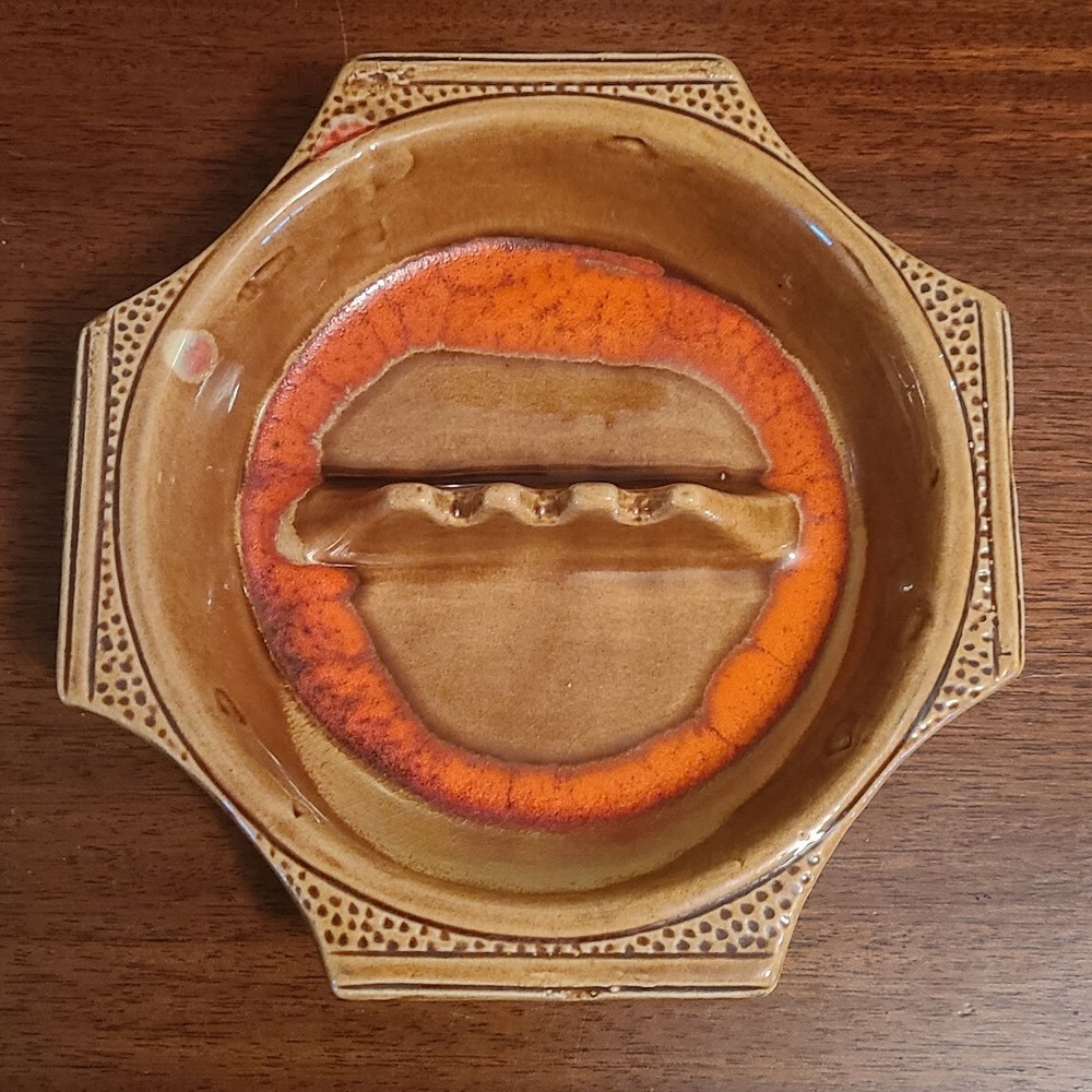 Love this unique mid-century ashtray—its bold orange and brown swirls really pop, and the octagon shape adds cool retro flair. Despite a tiny nick (honestly barely noticeable), it's in amazing condition with no cracks or chips. The mix of straight and curved sides plus those stylish cigarette rests give it so much character. Perfect for collectors or just as a stylish decor piece. Great size too—fits nicely on any table!