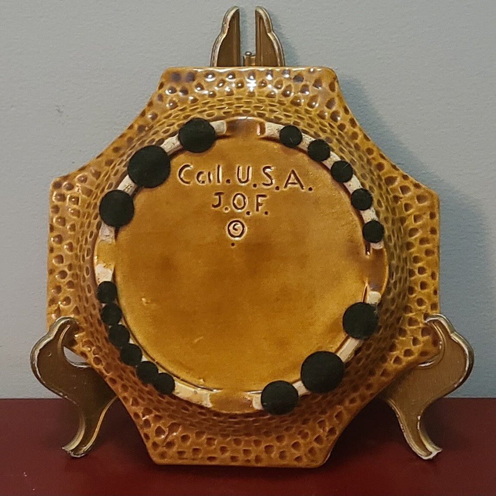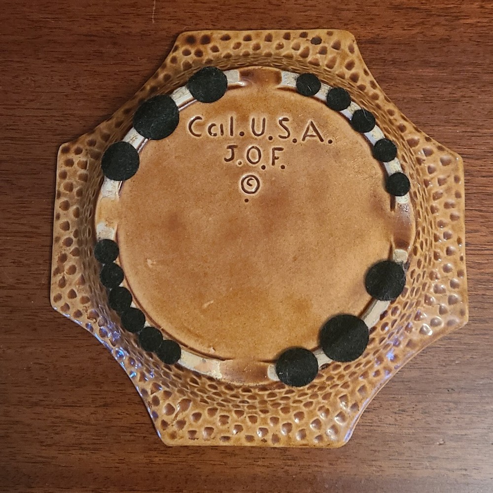 Mid Century Modern California Pottery J.O.F. Octagon Orange / Brown Ashtray This MCM ashtray is in excellent condition with no chips, cracks, crazing, or scratches. There is a small nick on one edge [see photos]. Eight sided, four sides are straight and four sides are curved. The ashtray bowl is mottled orange with an amoeba-like mustard brown center and rising charrette rests. The lips of the straight sides are bordered and have a dimpled design. Approximate Measurements 7" square 5" base diameter 1 1/2" deep Mark Cal. U.S.A J.O.F. Great vintage piece for your mid-century décor! Please take a moment to explore my listings of unique, vintage, and antique items. Newly discovered treasures listed almost daily! Feel free to email with any questions or when interested in multiple pieces. I'll happily respond to any inquiry and quote reduced combined shipping prior to purchase. Thanks for stopping!