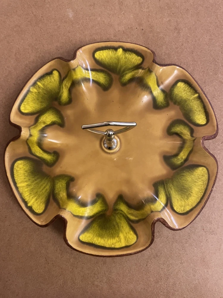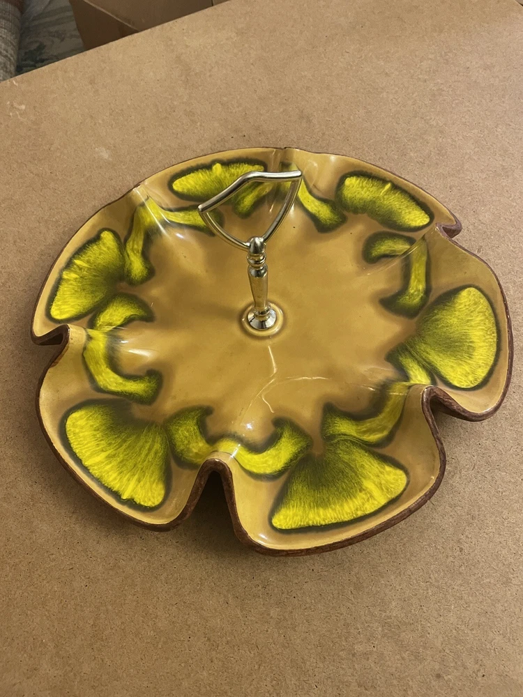 This platter plate dish by Sequoia California Pottery is a stunning piece of mid-century modern décor. The yellow, green, orange brown botanical pattern on the clay material is hand-painted and finish...