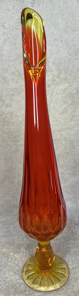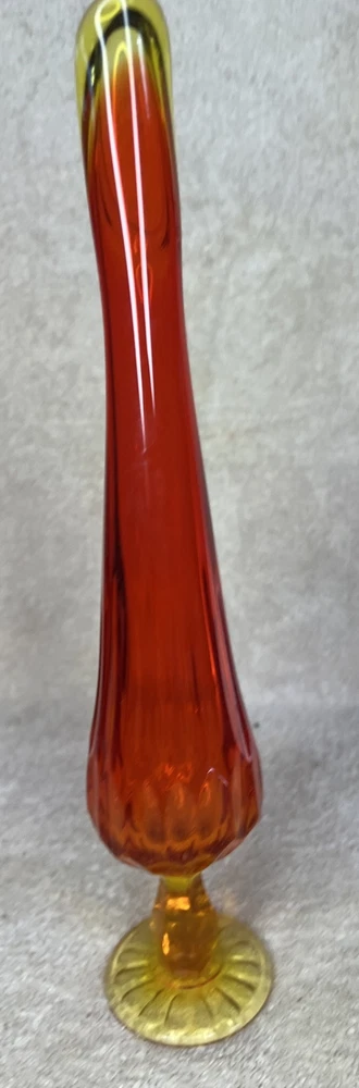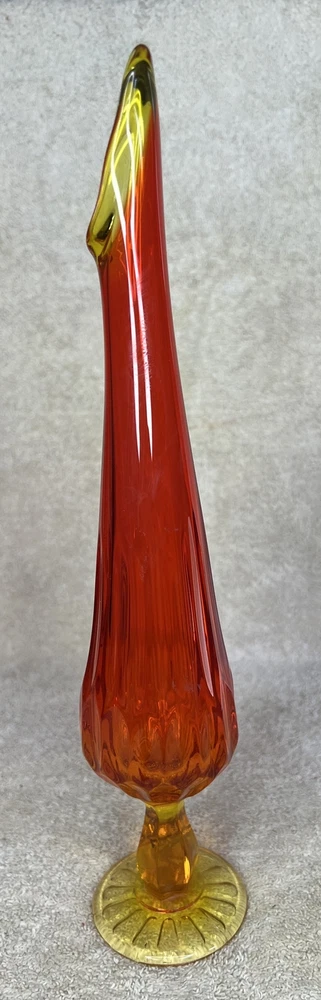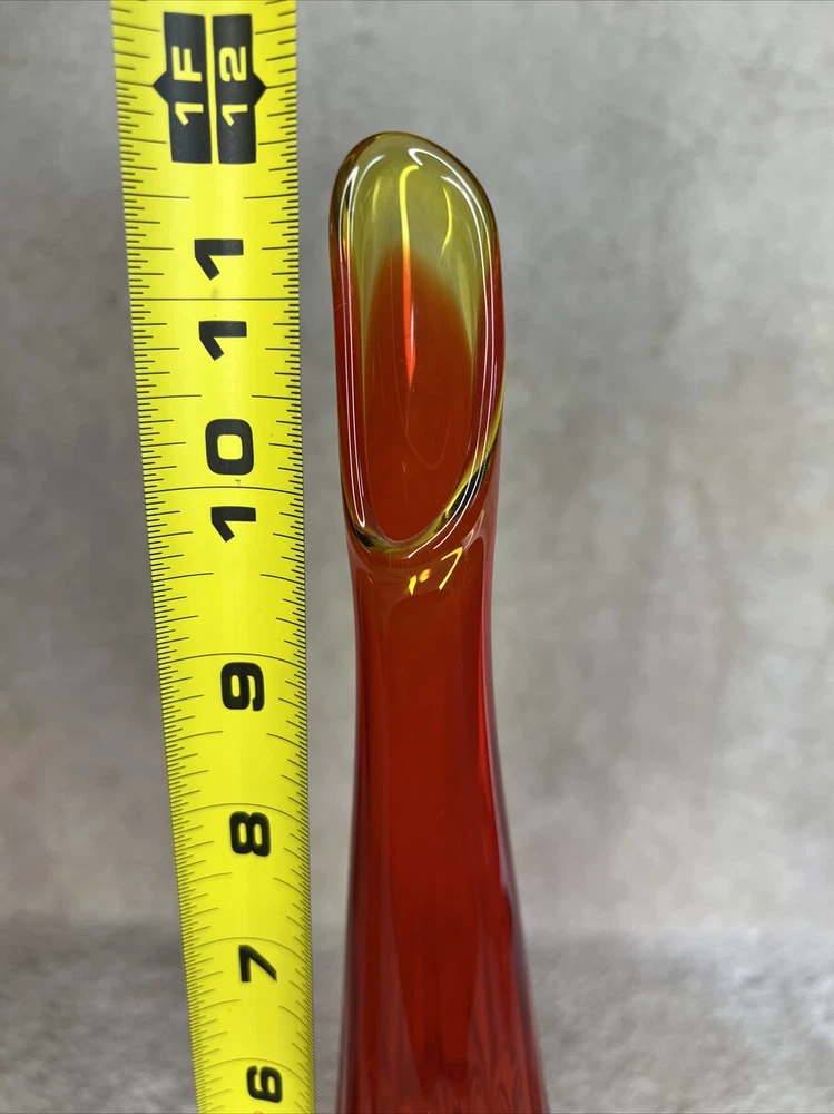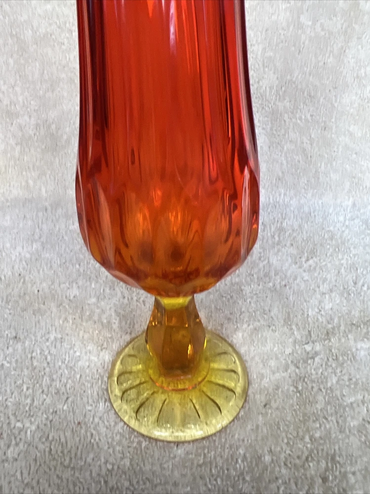 This beautiful Fenton glass vase is a unique addition to any collection. The mid-century modern style and hand-blown glassmaking technique make it a truly one-of-a-kind piece. The amberina orange color with thumbprint design adds a touch of elegance to any room, and the 11 3/4" size makes it a great medium-sized option for all occasions. Although it has been previously owned, it has been well-maintained and remains in great condition. Add this original, handmade vase to your collection today! Good condition no chips are cracks beautiful color. Please see your photos as these are part of the description.