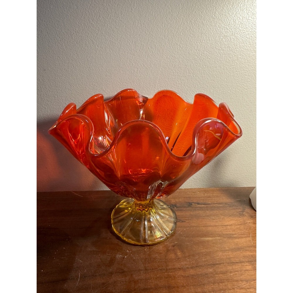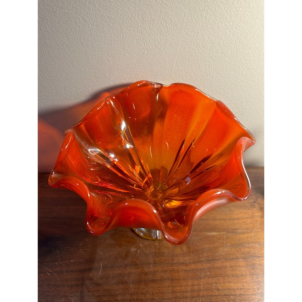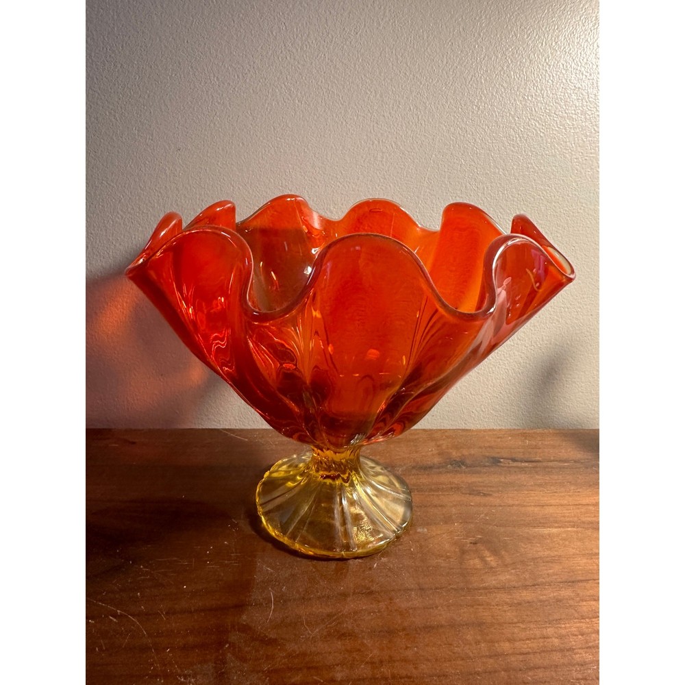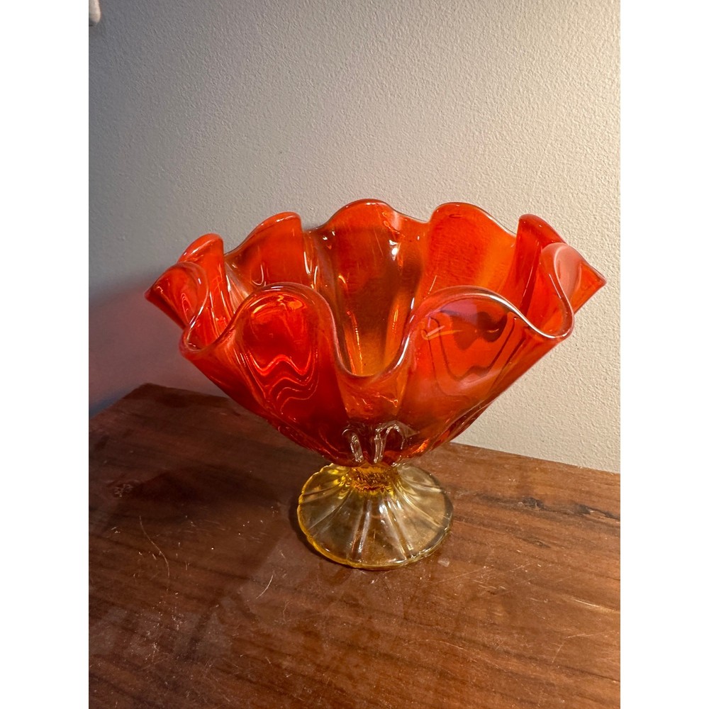 <![CDATA[<div>This American glass dish from the 1960s presents a unique visual appeal with its rounded wave design and footed base. The glass exhibits a striking ruby/amber hue, which deepens to a more intense orange at the base and lightens towards the top edge, all encircled by a clear and red band. It's believed that this may be a piece from the Viking Glass Company, renowned for their innovative designs. With dimensions of 4.5” H x 7” Diameter and a 3” diameter base, this piece balances size and design elegantly.
