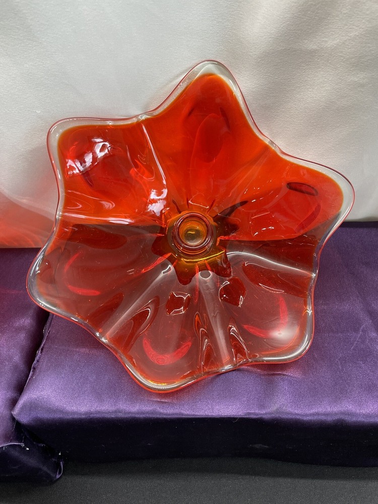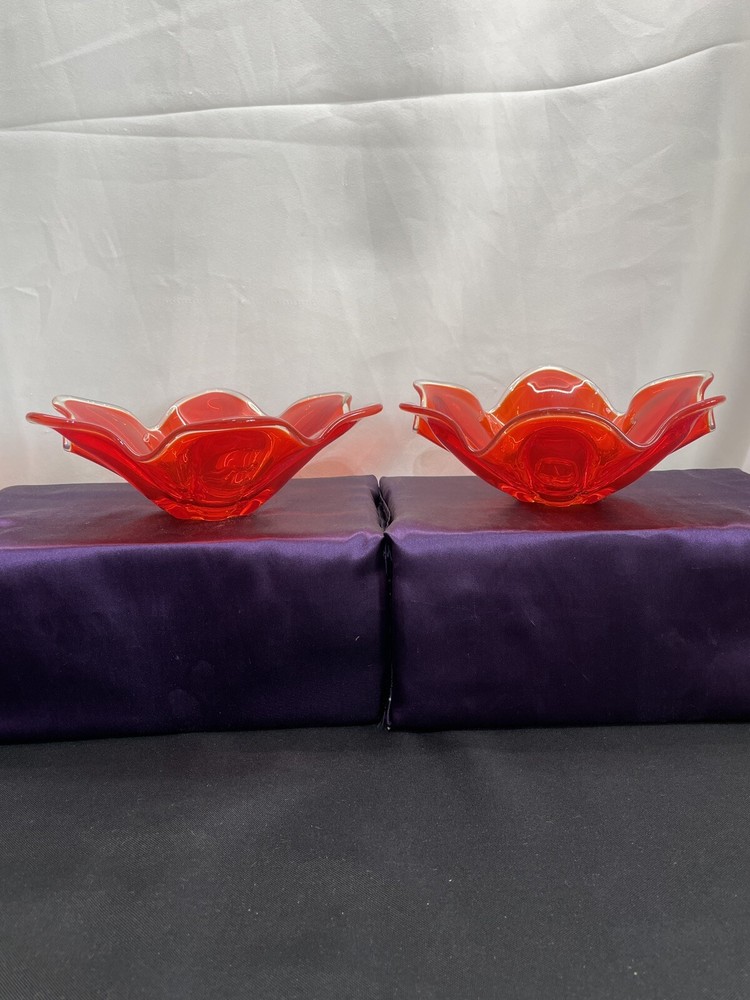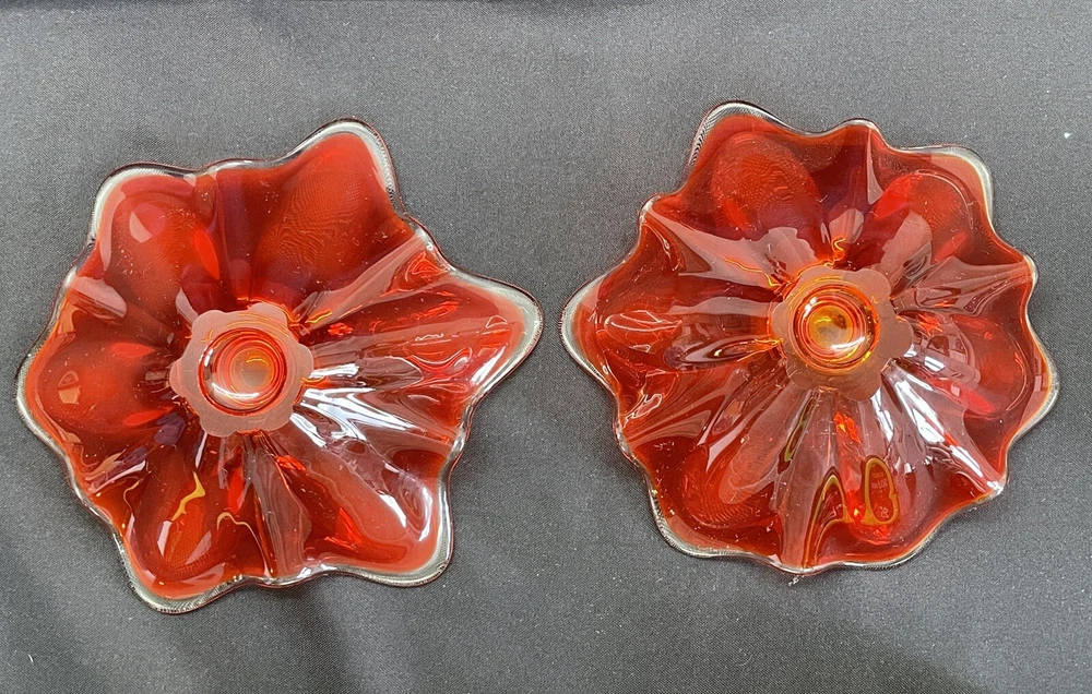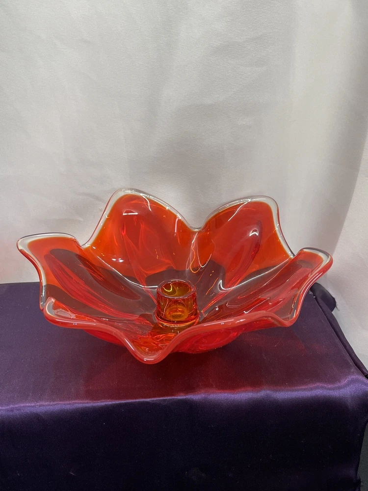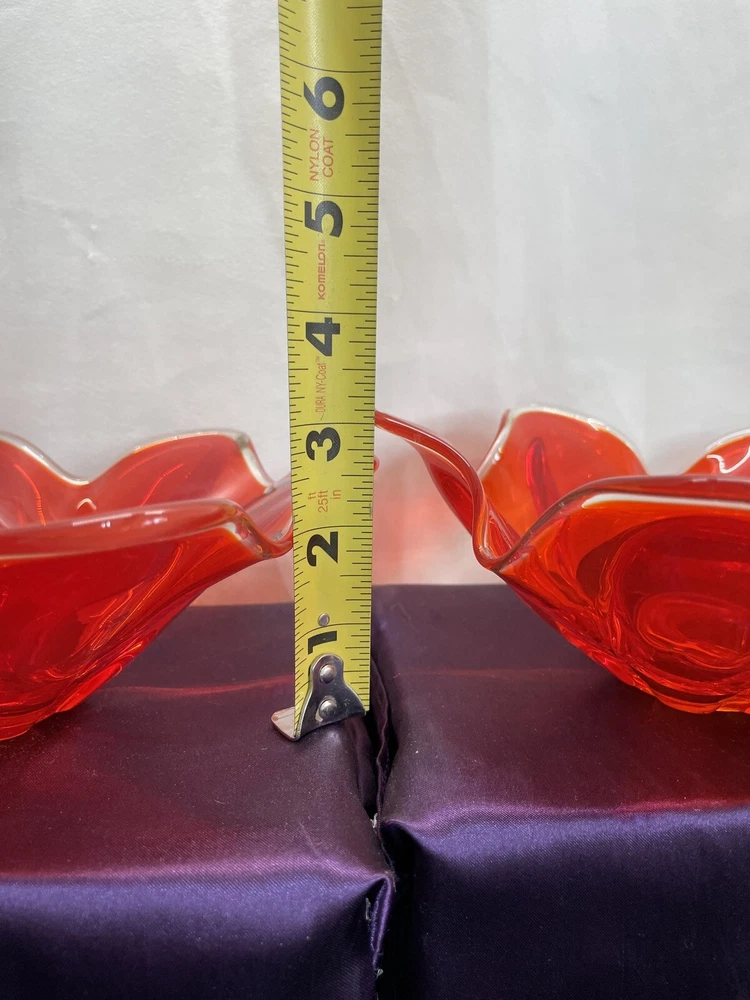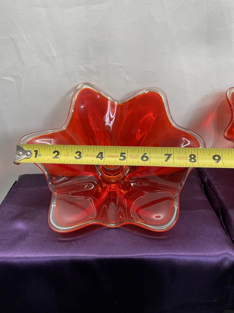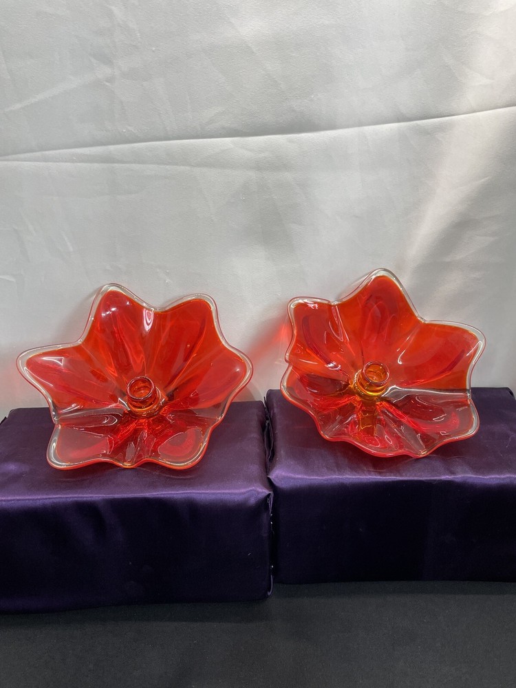 Vintage Hand Blown Art Glass Ruffled Orange Candlestick Holders From a non smoking home and in fine condition. Read Full description, Look at all pictures for size and wear. NO ORIGINAL box. No cracks or chips, THAT I CAN SEE. IF THERE ARE CRACKS OR CHIPS I NOTICE WHEN I AM PACKING, I WILL CONTACT BEFORE I SHIP. I do my best to look over and run my hands over each item to ensure I am describing as best as possible. My goal is honesty, integrity great packing & fast shipping. As is no returns. USA and Global shipping.