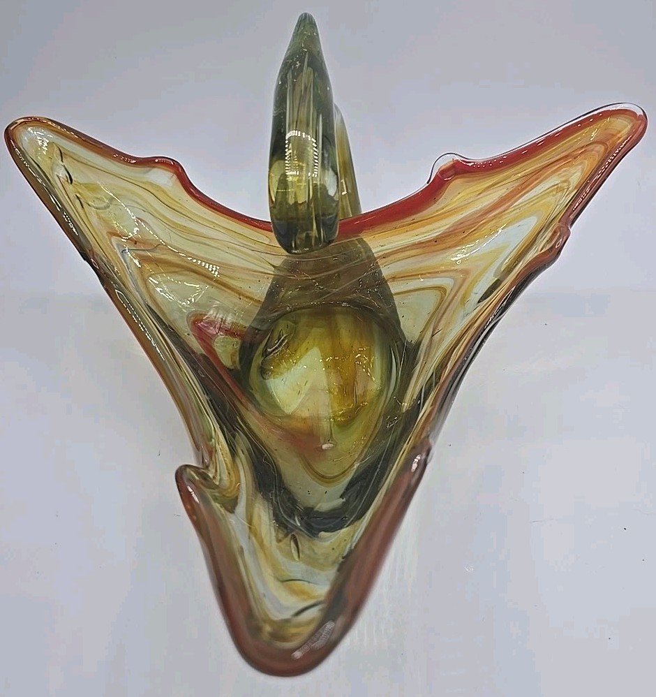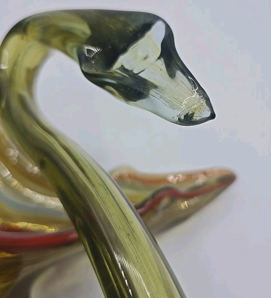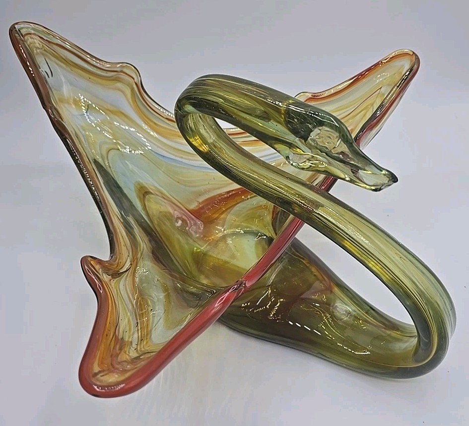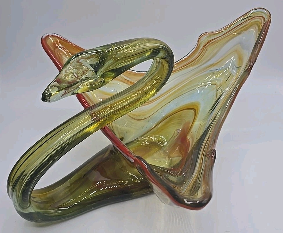 This stunning centerpiece dish is a true masterpiece, handcrafted using traditional glassblowing techniques. The unique combination of orange, green, and brown colors creates a striking visual appeal, while the swan design adds a touch of elegance to any room. Perfect for mid-century modern decor, this piece is sure to be a conversation starter. Made from high-quality glass, it is both durable and stylish, making it a great addition to any collection. Whether used as a focal point in a dining room or as a decorative piece in a living room, this swan centerpiece dish is sure to impress. Not sure if beak is chipped or if that's where the blow tube was detached. It's not sharp but wanted to point it out. can send other pics upon request.