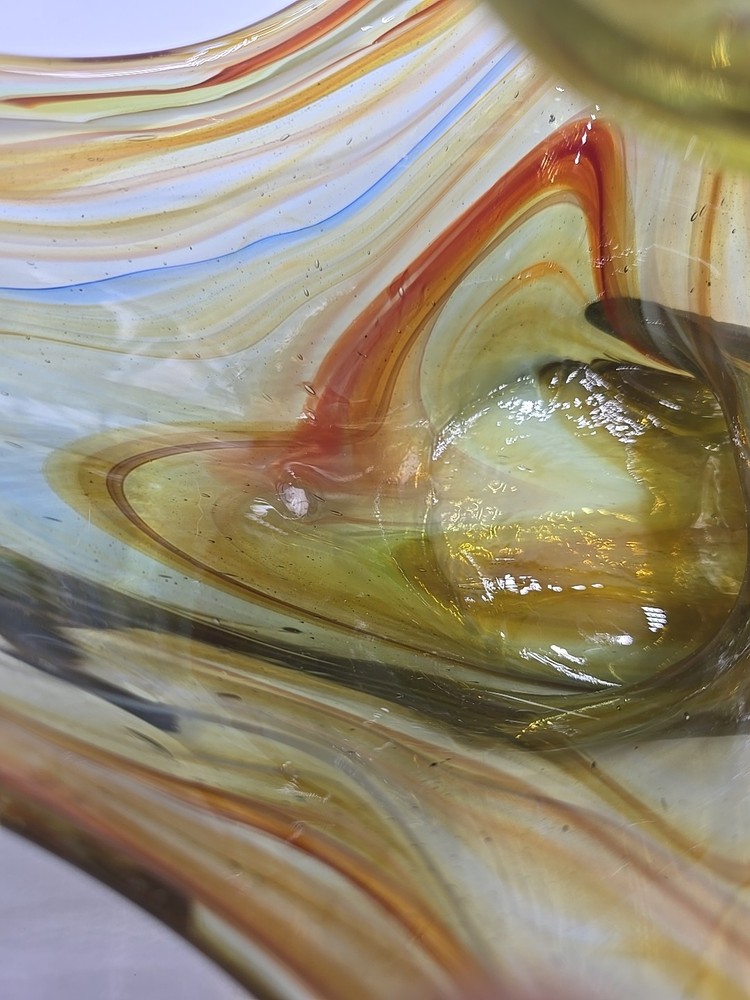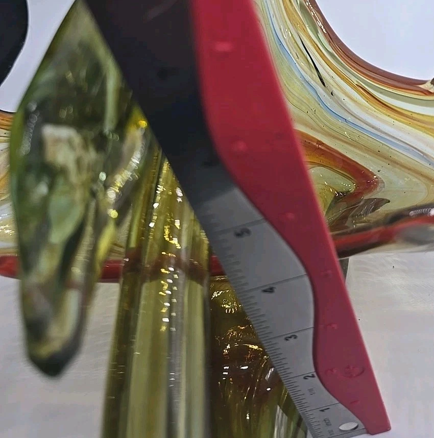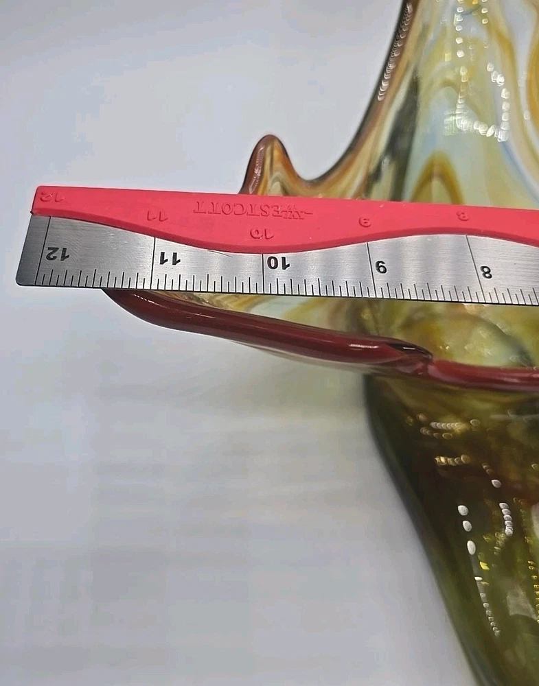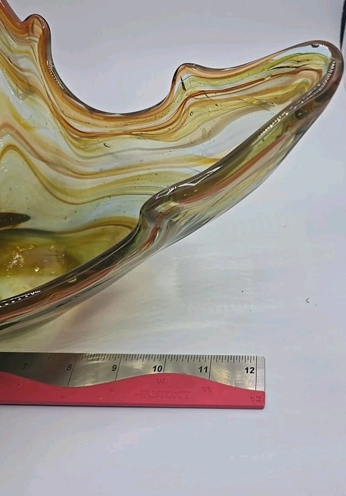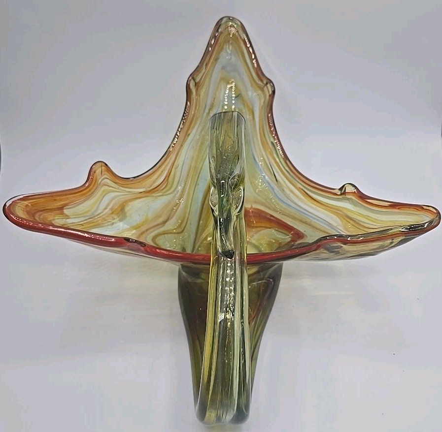 This stunning centerpiece dish is a true masterpiece, handcrafted using traditional glassblowing techniques. The unique combination of orange, green, and brown colors creates a striking visual appeal, while the swan design adds a touch of elegance to any room. Perfect for mid-century modern decor, this piece is sure to be a conversation starter. Made from high-quality glass, it is both durable and stylish, making it a great addition to any collection. Whether used as a focal point in a dining room or as a decorative piece in a living room, this swan centerpiece dish is sure to impress. Not sure if beak is chipped or if that's where the blow tube was detached. It's not sharp but wanted to point it out. can send other pics upon request.