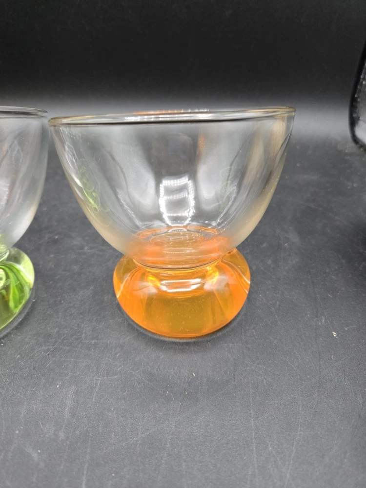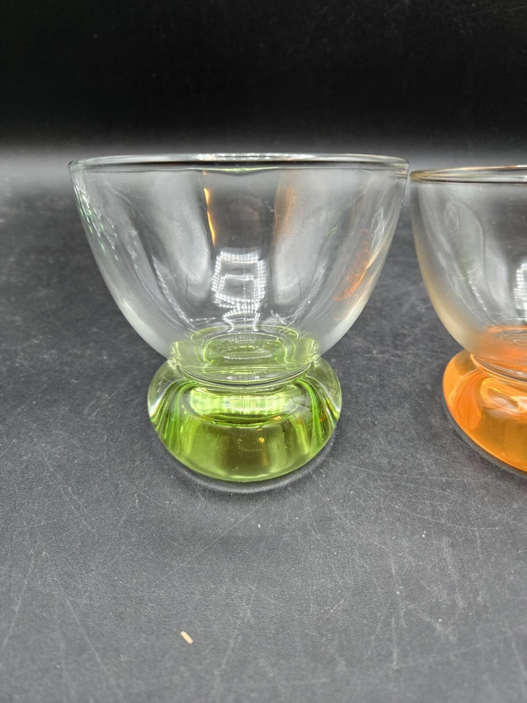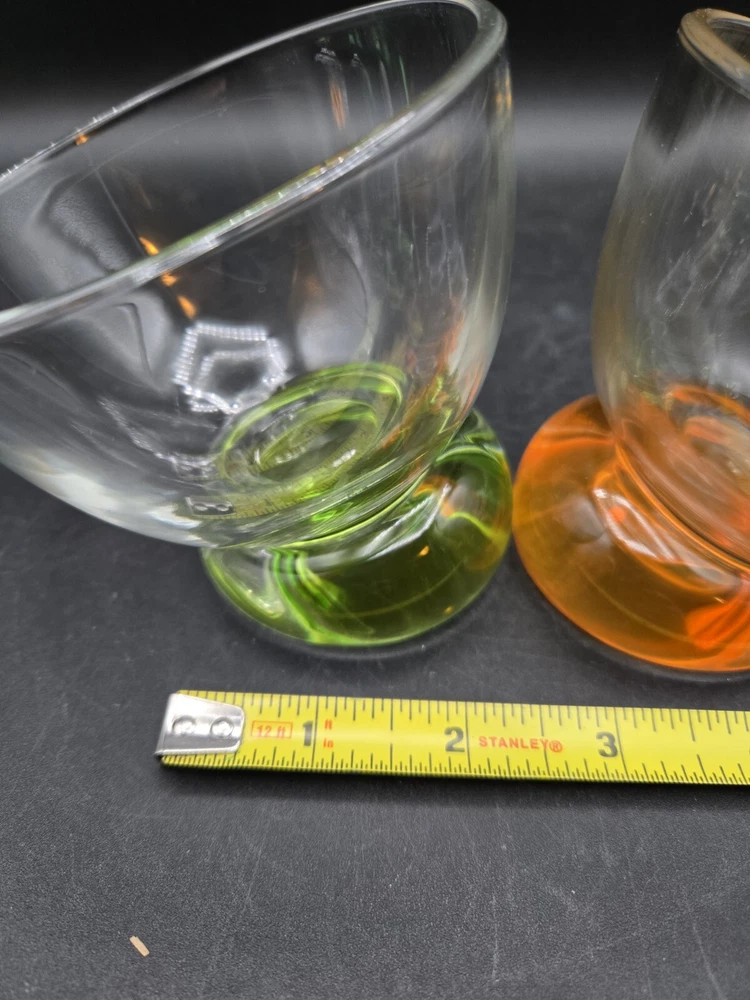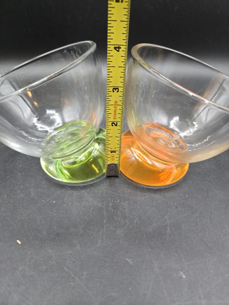 This set of two vintage Mid Century Modern cocktail glasses features a unique design with a tilted shape in green and orange colors. The glasses have a heavy bottom for stability and are made of fused glass material. With a 6oz capacity and a height of 4 inches, these stylish bar glasses from the Century product line are perfect for all occasions, adding a touch of retro charm to your drinkware collection. Tipsy glasses. No chips or cracks