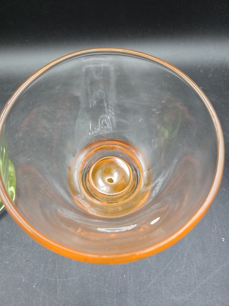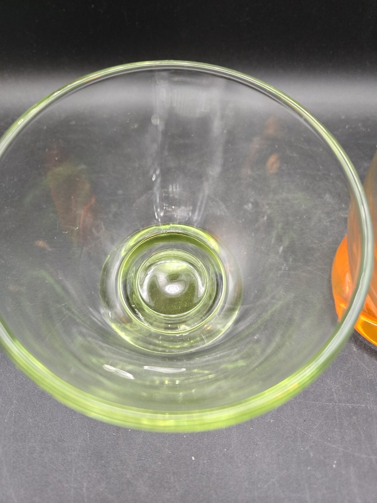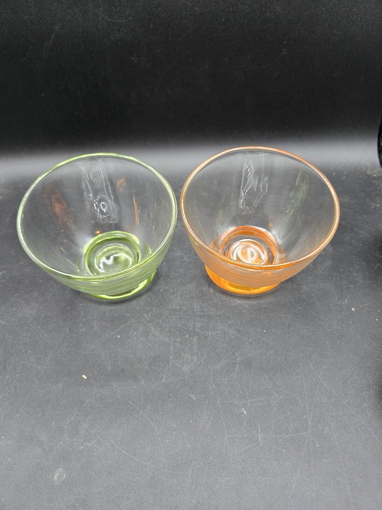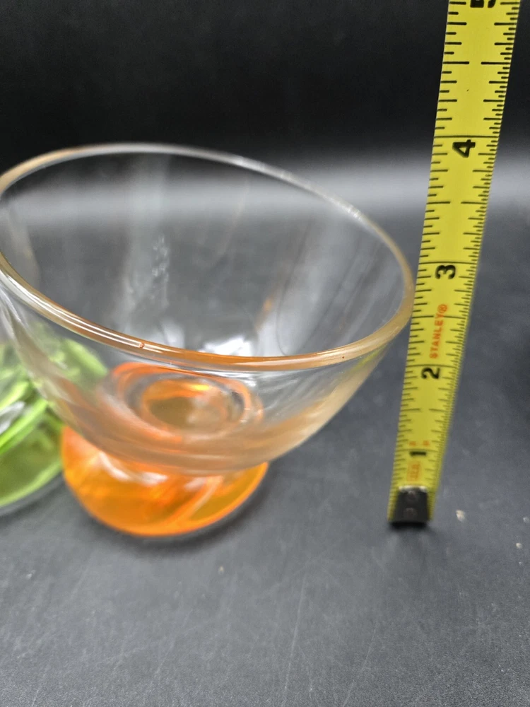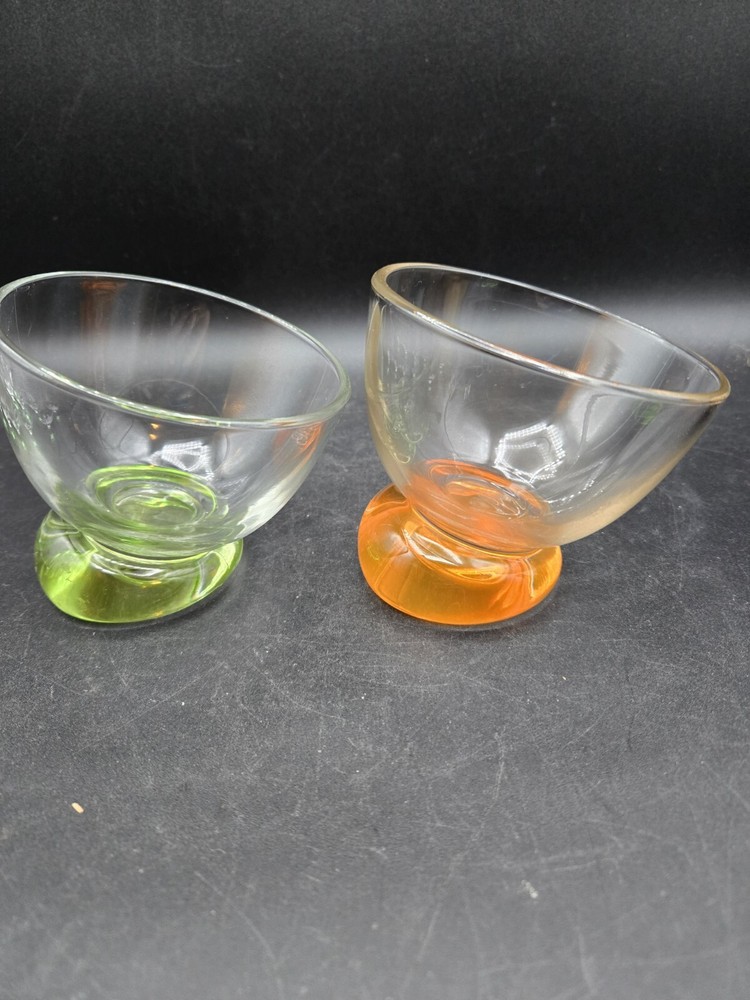 This set of two vintage Mid Century Modern cocktail glasses features a unique design with a tilted shape in green and orange colors. The glasses have a heavy bottom for stability and are made of fused glass material. With a 6oz capacity and a height of 4 inches, these stylish bar glasses from the Century product line are perfect for all occasions, adding a touch of retro charm to your drinkware collection. Tipsy glasses. No chips or cracks