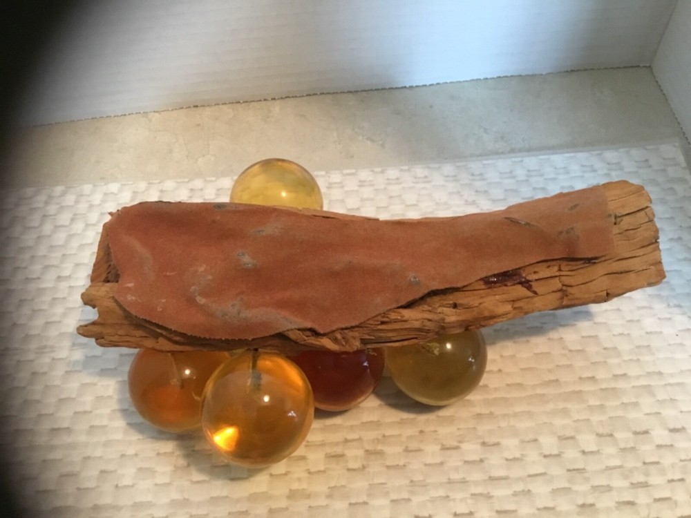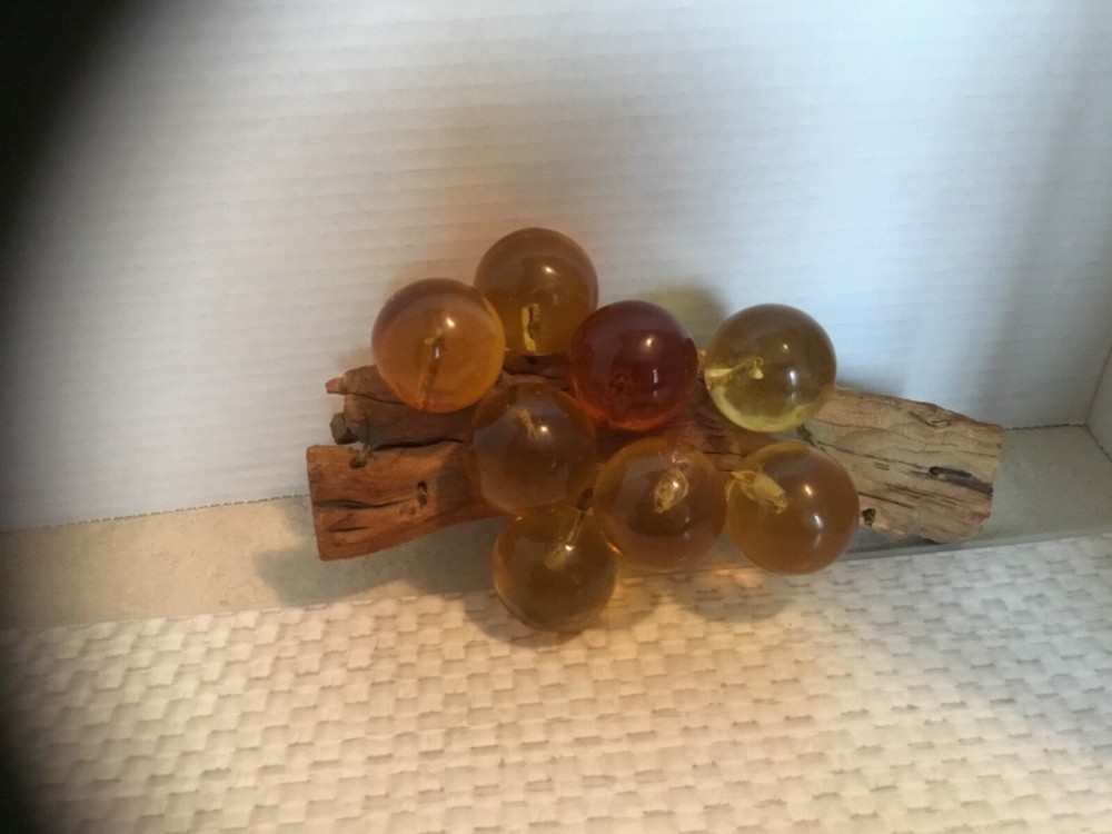 Vintage Mid-Century Lucite Grapes (8) on Driftwood. Driftwood measures 9.5” long. Grapes are a beautiful honey colored amber with one grape being orange. Beautiful Fall colors! Condition is “Used”. There is a small scuff on one grape. Very hard to see. These are Mid-Century gorgeous!