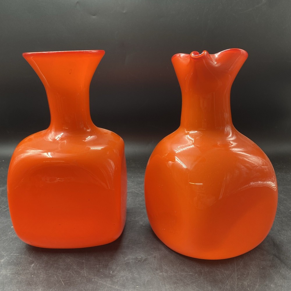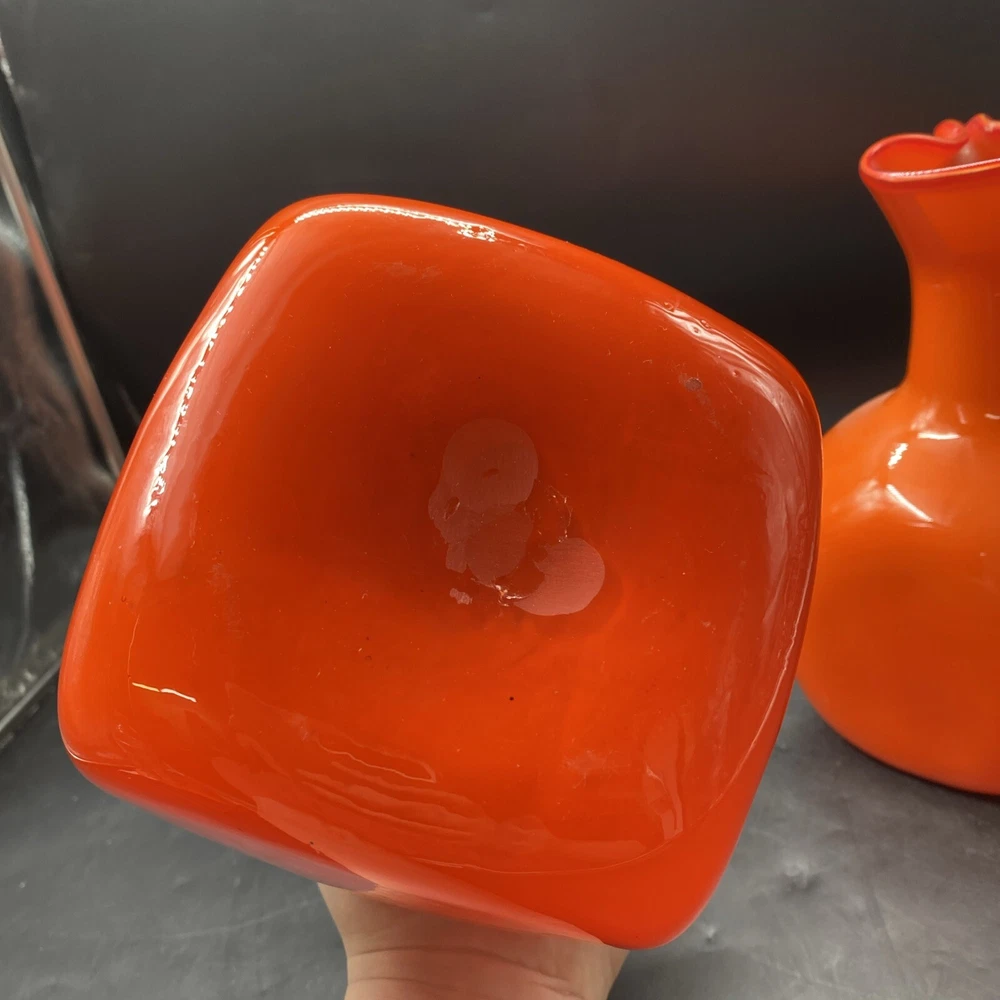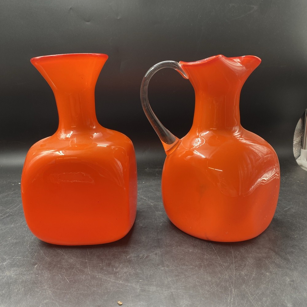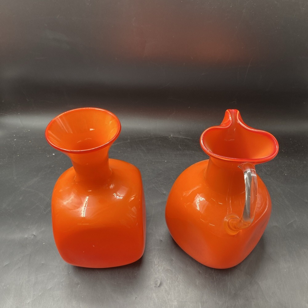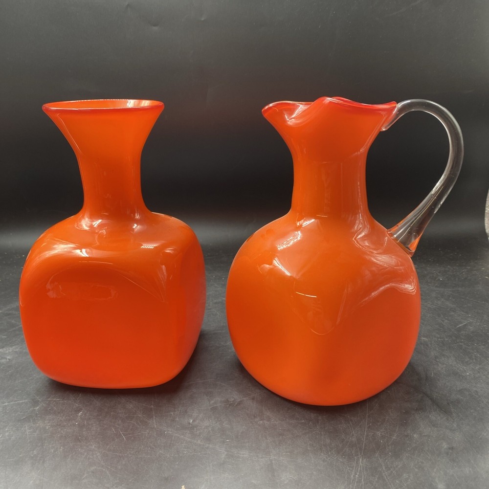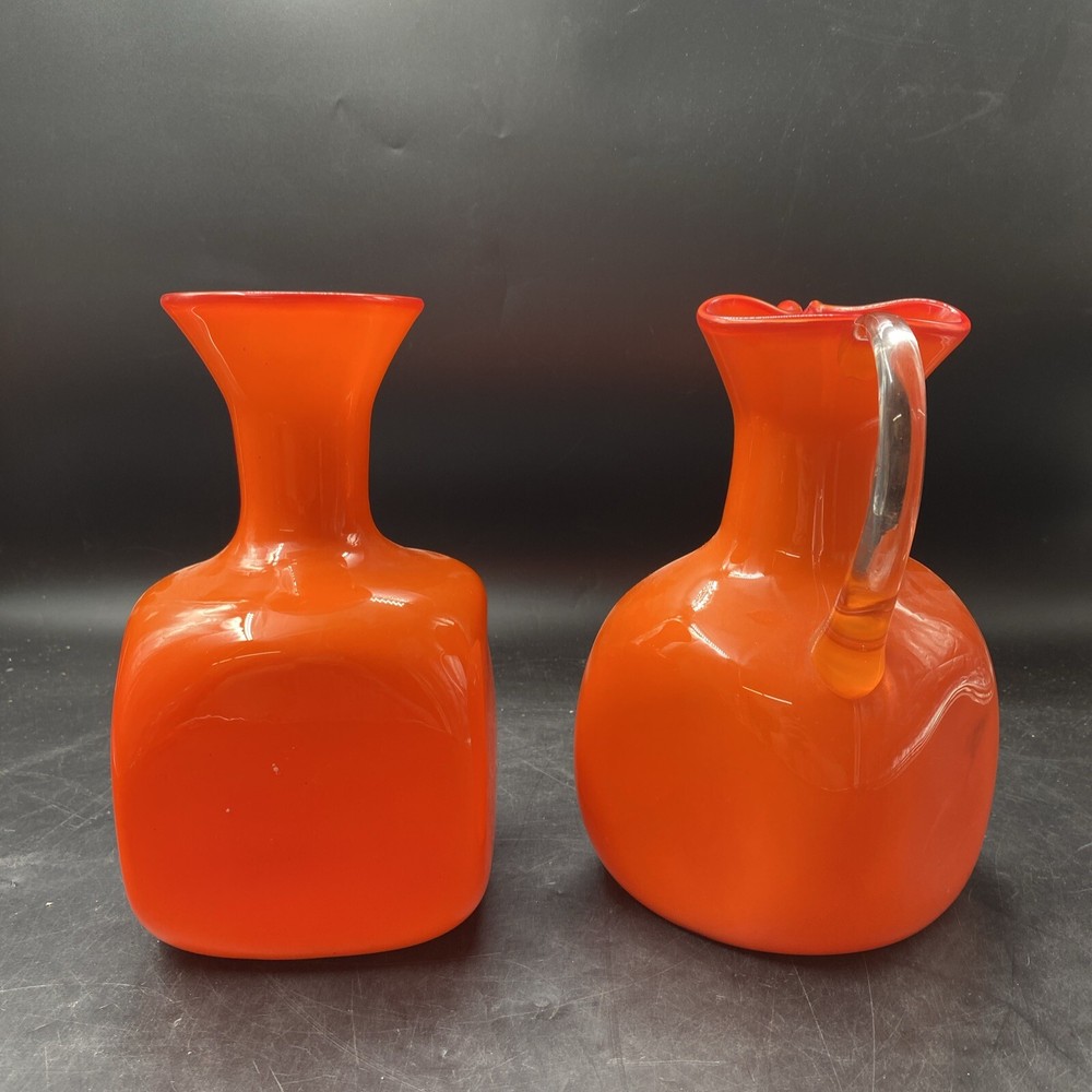 This stunning pitcher and carafe set is a must-have for any Mid-Century Modern enthusiast. The vibrant orange color and unique, modernist design make them a standout addition to any home decor. Crafted from high-quality glass, this set is both durable and stylish, perfect for serving up your favorite beverages. The unmarked brand adds to the intrigue of this set, making it a true statement piece. Whether you're using them for a special occasion or simply enjoying a refreshing drink on a hot summer day, this pitcher and carafe set are sure to impress. Add them to your collection today and elevate your home bar or kitchen decor.