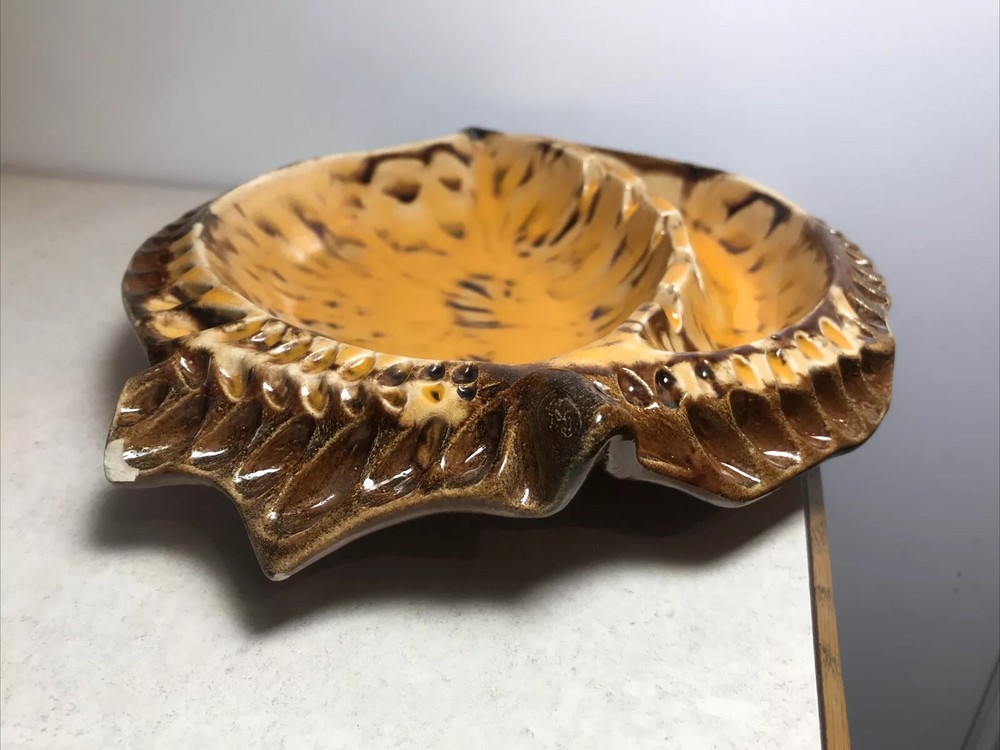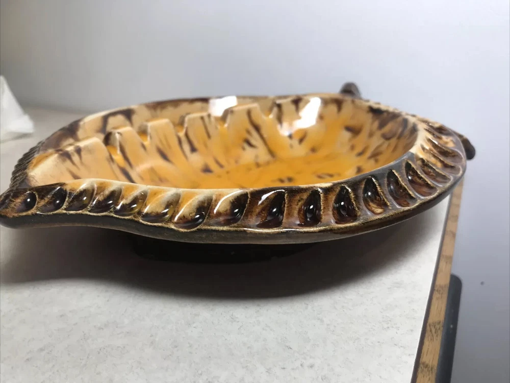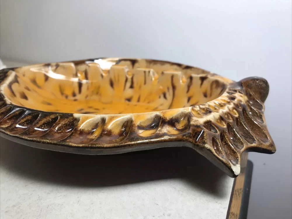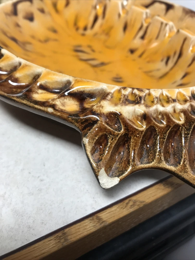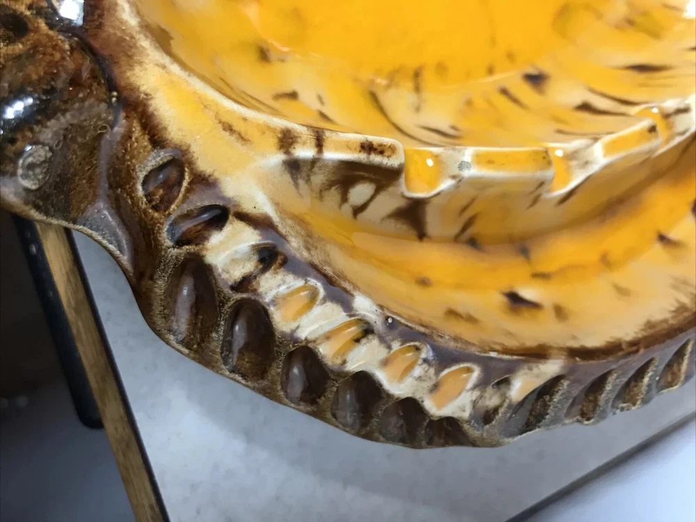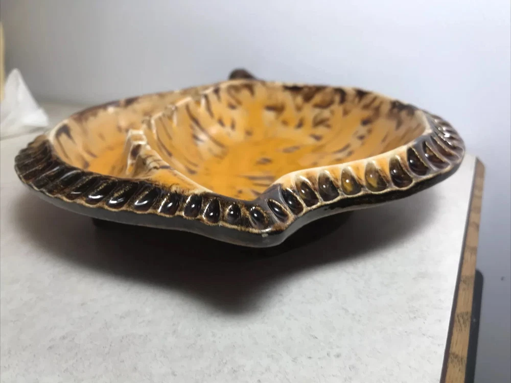 Mid Century Modern Orange Drip Glaze Cal Style 201 Pottery MCM Atomic Ashtray. Good shape overall, has 4-5 smaller chips that aren't too distracting. And one slightly larger chip on a more prominent corner. And the piece is crazed throughout on the topside, but seemingly not the bottom. No through-cracks. See last 4 photos for closeups of the more obvious chips.