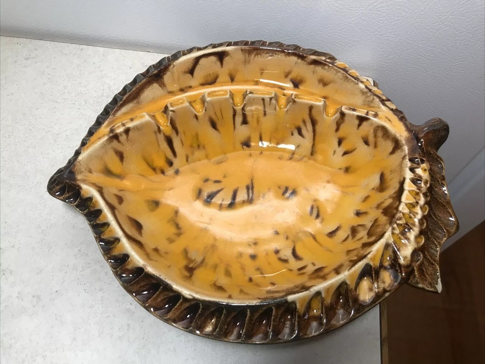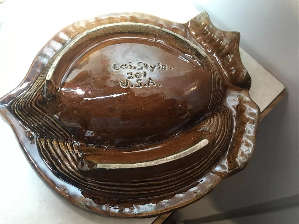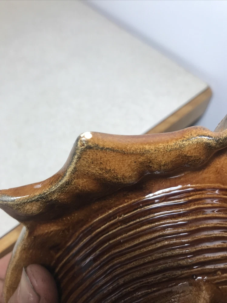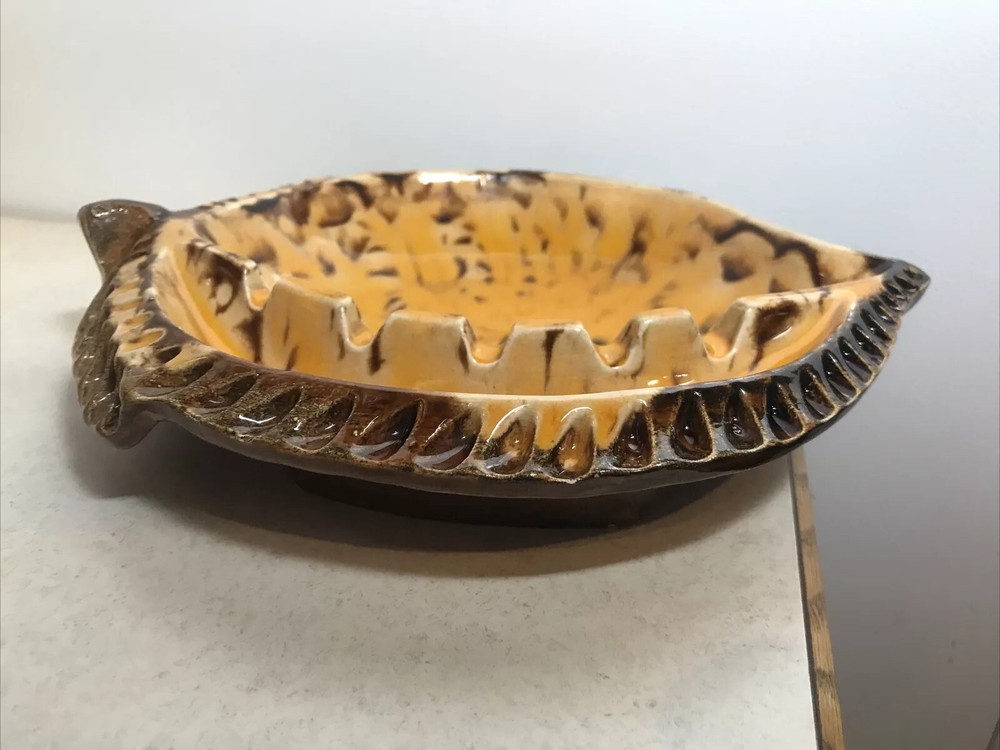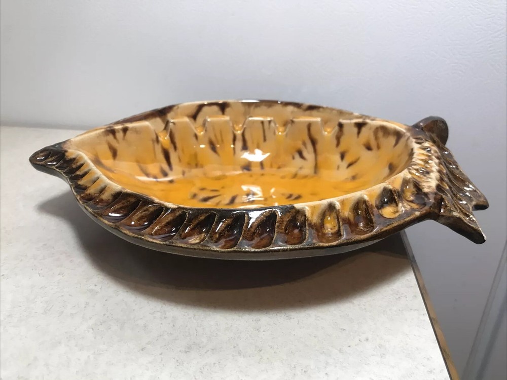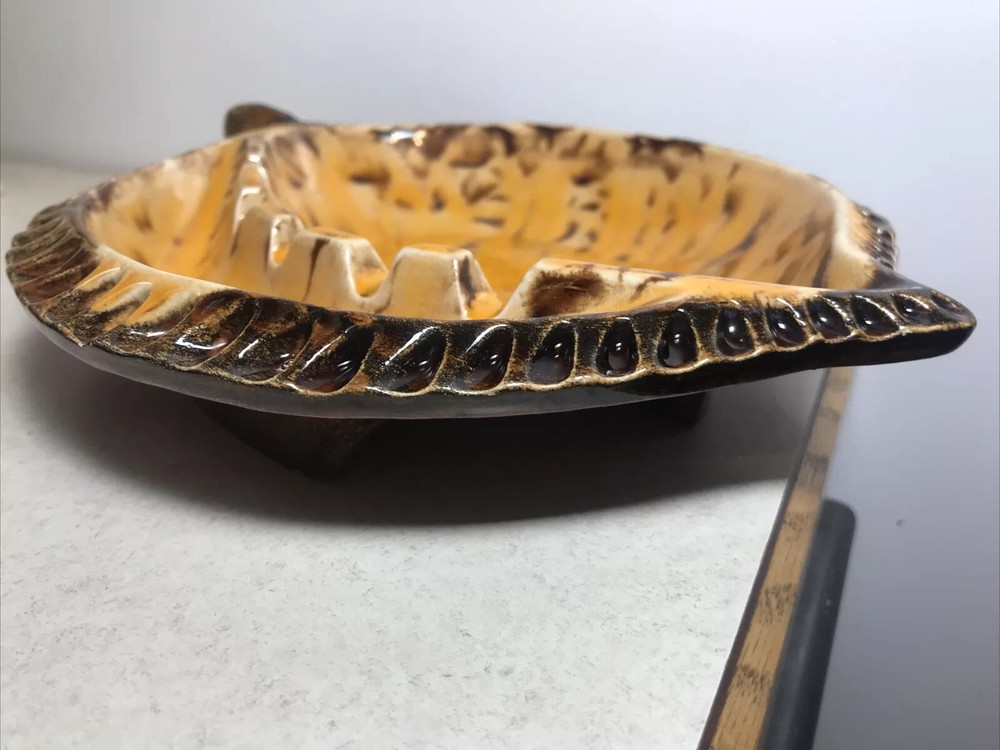 Mid Century Modern Orange Drip Glaze Cal Style 201 Pottery MCM Atomic Ashtray. Good shape overall, has 4-5 smaller chips that aren't too distracting. And one slightly larger chip on a more prominent corner. And the piece is crazed throughout on the topside, but seemingly not the bottom. No through-cracks. See last 4 photos for closeups of the more obvious chips.