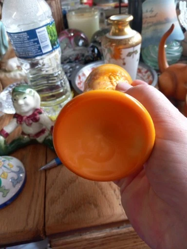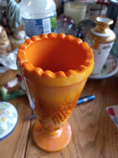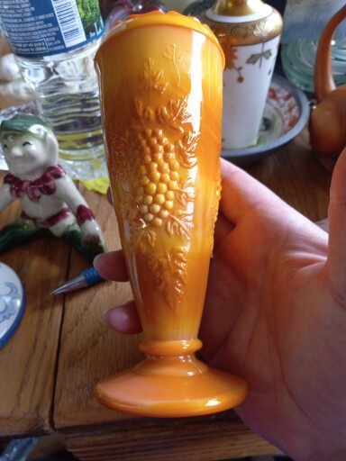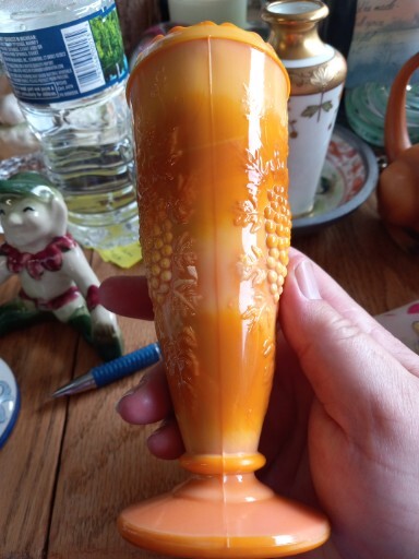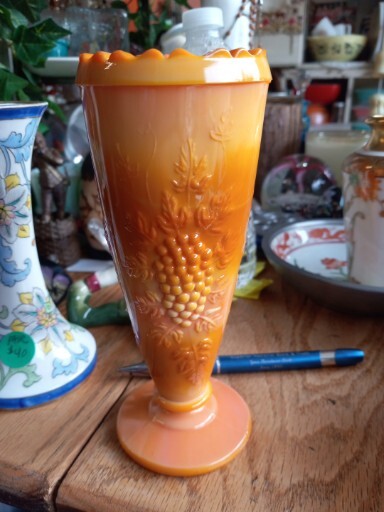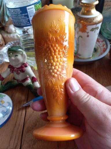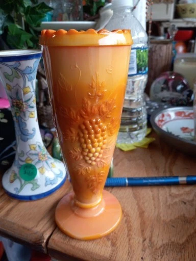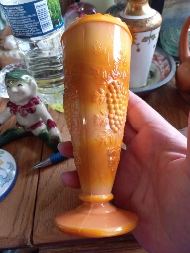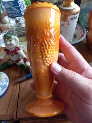 This vintage vase is a beautiful piece of mid-century modern décor. The glass is a unique orange slag color with pressed grape clusters on the surface. Measuring approximately 6 1/2" in height and 2.5" in width, this vase is perfect for displaying flowers or as a stand-alone decorative piece. The vase is unmarked but is an original production style from the mid-20th century (1941-1969) in the United States. It has a lovely vintage feel and is in good used condition. Add a touch of retro charm to your home with this stunning vase.
