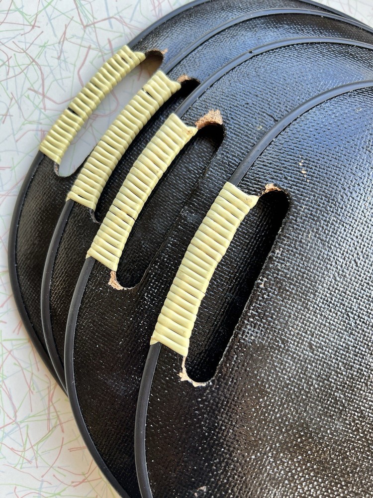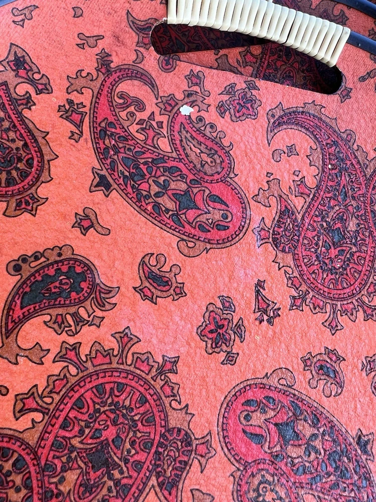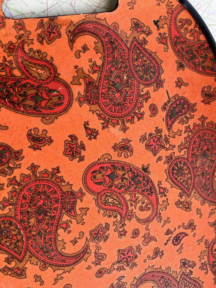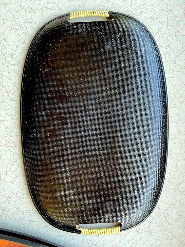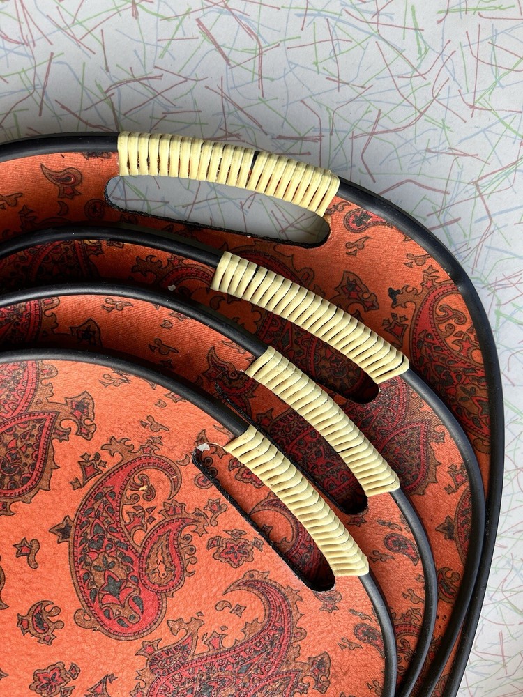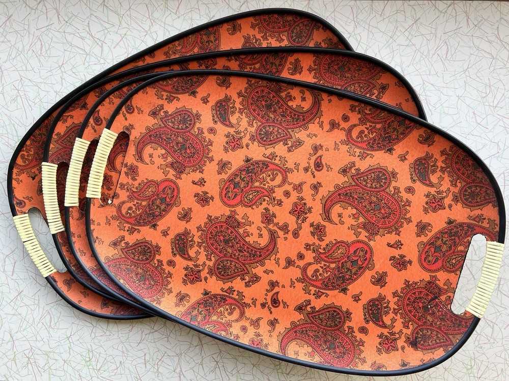 ✨Mid Century Modern Orange Vinyl Tiki Style Serving Trays #4 Vintage 1960s. Amazing MCM orange trays. Perfect set for holiday party or just to display. The orange is some sort of vinyl and is very vibrant. Set are in great vintage condition. The trays do have some mild wear. See pics. One tray does have a faint white ring. See pic. There is some wear on the backside black around the handles. A573 📐18”L, 11.75”W