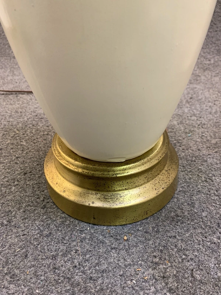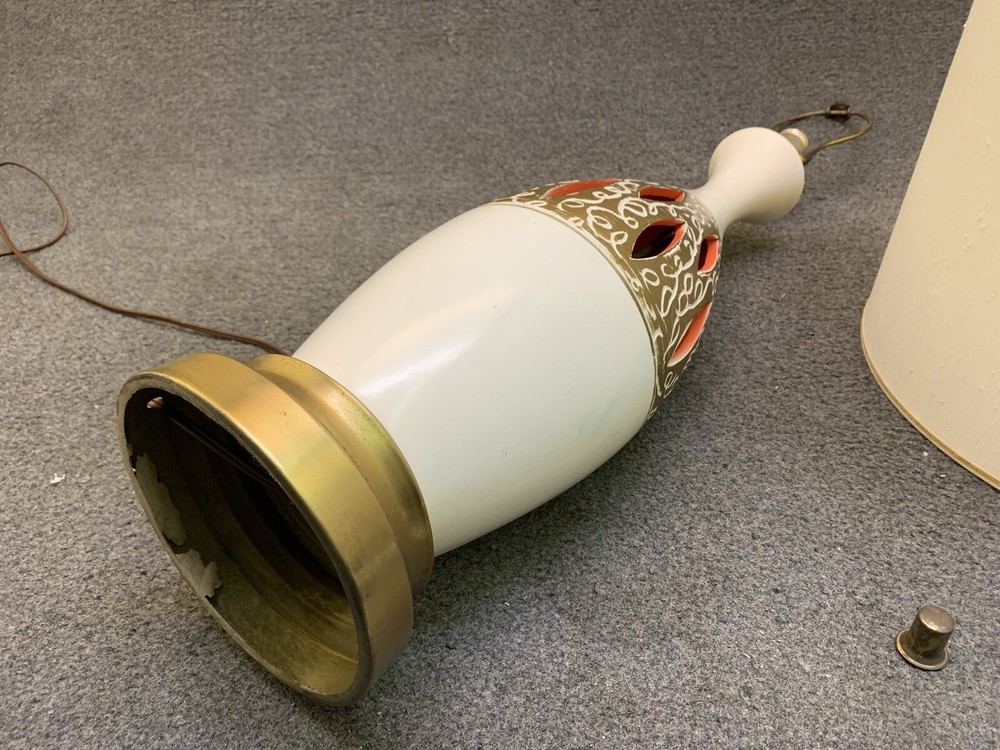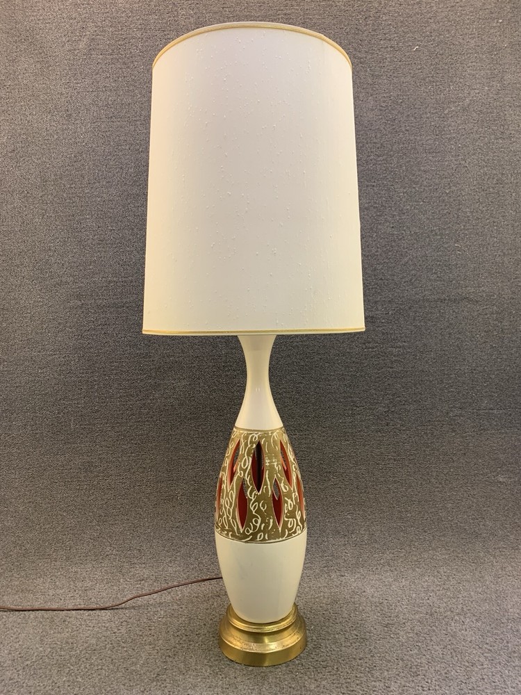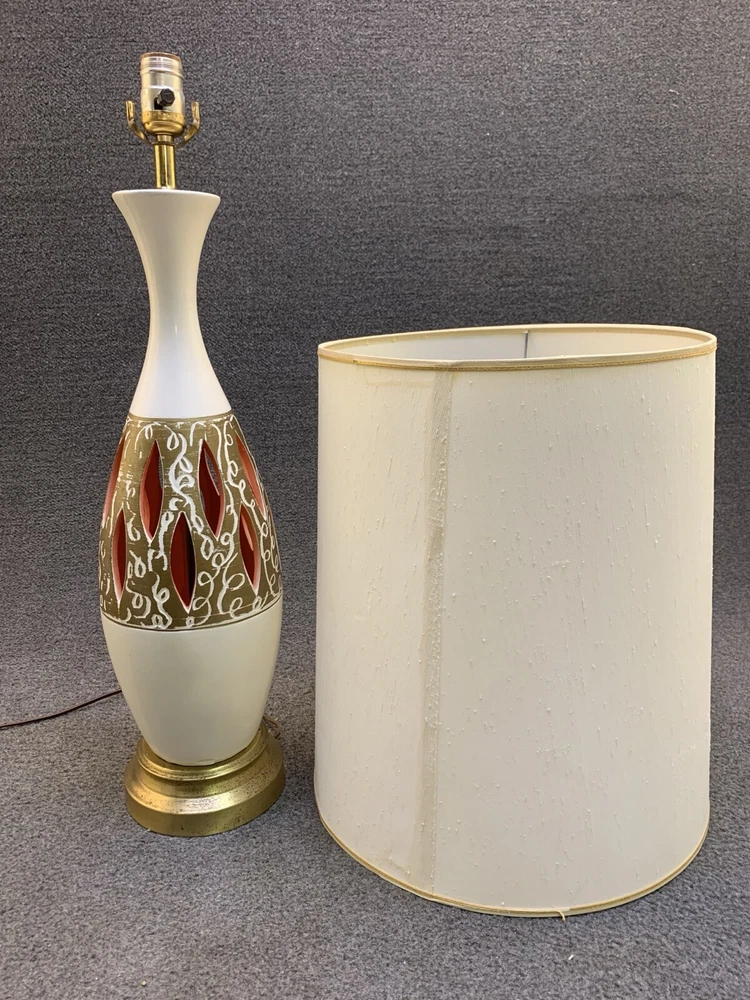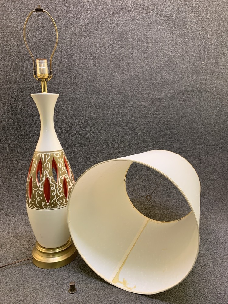 Mid Century Modern Orange White & Gold Ceramic Cut Out Table Lamp Thurston Mid Century Modern Orange White & Gold Ceramic Cut Out Table Lamp in the Style of Gerald Thurston for Lightolier Measures: 26” to top of socket & 38 3/4” to top of shade x 6 3/4” in diameter with a shade of 17 1/8” tall x 15 1/4” in diameter GENERAL INFORMATION TERMS & CONDITIONS OF SALE (i.e. on ALL listings) PAYMENT: I only accept Paypal with payment due in 7 days. ITEM CONDITION: YOU the buyer are the expert. No guarantee are given on these items, & most items are sold for collecting purposes. Condition should be based on photos, description, & condition statement. Items are tested for basic functionality but are not tested for full functionality & reliability during prolonged use cannot be verified. Not all flaws can be photographed or described. Please read the listing carefully, do your research, & email with any questions you may have. PRICING & BEST OFFERS: NO OFFERS unless Best Offer feature provided through eBay is given as an option. Other unsolicited offers will be ignored consistent with eBay policy. Item prices are based on market prices of comparable sales. When the Best Offer provided by eBay is given as an option, those offers can be considered for up to 48 after submission, & YOU will be bound by eBay terms of service to complete purchase if accepted. RETURNS: If you have a problem or a return, contact me & allow up to 48 hours for a response & before leaving feed back or initiating/escalating a return. The same items must be sent back with return shipping & handling paid by the buyer. No refund will be made without return of the item, & no partial refunds. Use “This item doesn't match the description” or “Arrived damaged” ONLY if this is applicable. ALL fraudulent returns or items received with evidence of buyer modification/repair will be rejected. These items will be held unless arrangements to have the item resent at buyers expense. AS-IS items with stated functional problems do not qualify for ANY return. NO EXCEPTIONS. SHIPPING & HANDLING: Most items are mailed within 24 hours Monday-Friday. Some items may take longer to process based on packing consternations. SHIPPING COSTS: Though an arrival estimates may be listed, a variety of shipping options may be used that balance cost & shipping time. Those paying for shipping will get the shipping option they payed for unless that method is unavailable for the specific circumstances. Any item may be dismantled for cost & safe transport considerations. If you need the item fully assembled, arrangements can be made at buyers cost. **Those using a PO Box or outside the Continental United States may incur a shipping surcharge over the final price.** If you have any special requests please contact me. INTERNATIONAL BUYERS: International shipping options are made available when practical. I participate in eBay’s Global Shipping Program where applicable. Items shipped under 4 pounds are shipped first class international & buyers will assume ALL liability if item is lost or damaged during shipment. For items from 4 to 70 lbs priority international will be used. ALL items sold to international buyers are to be regarded AS-IS & will not be extended any return options no matter defect, except if buyer pays full return shipping. _gsrx_vers_1680 (GS 9.8.3 (1680))