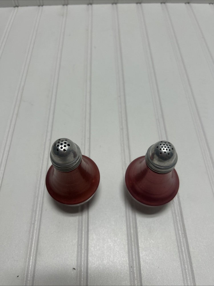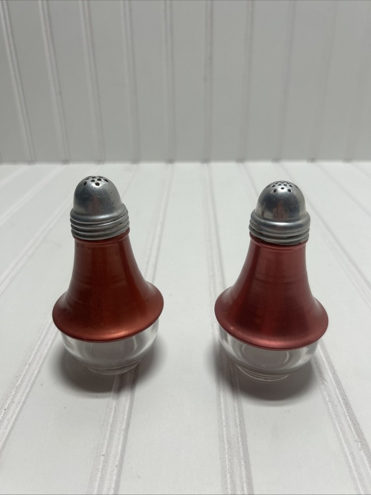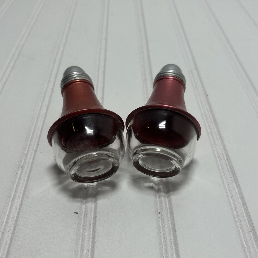 This set includes two Mid Century Modern salt and pepper shakers in a red rust orange color. The shakers have a round bottom shape and are made of glass/aluminum and aluminum. They were manufactured in the 1960s in the United States, making them an original piece from that time period. The design and style of these shakers reflect the Mid Century aesthetic, adding a retro touch to any kitchen or dining table.