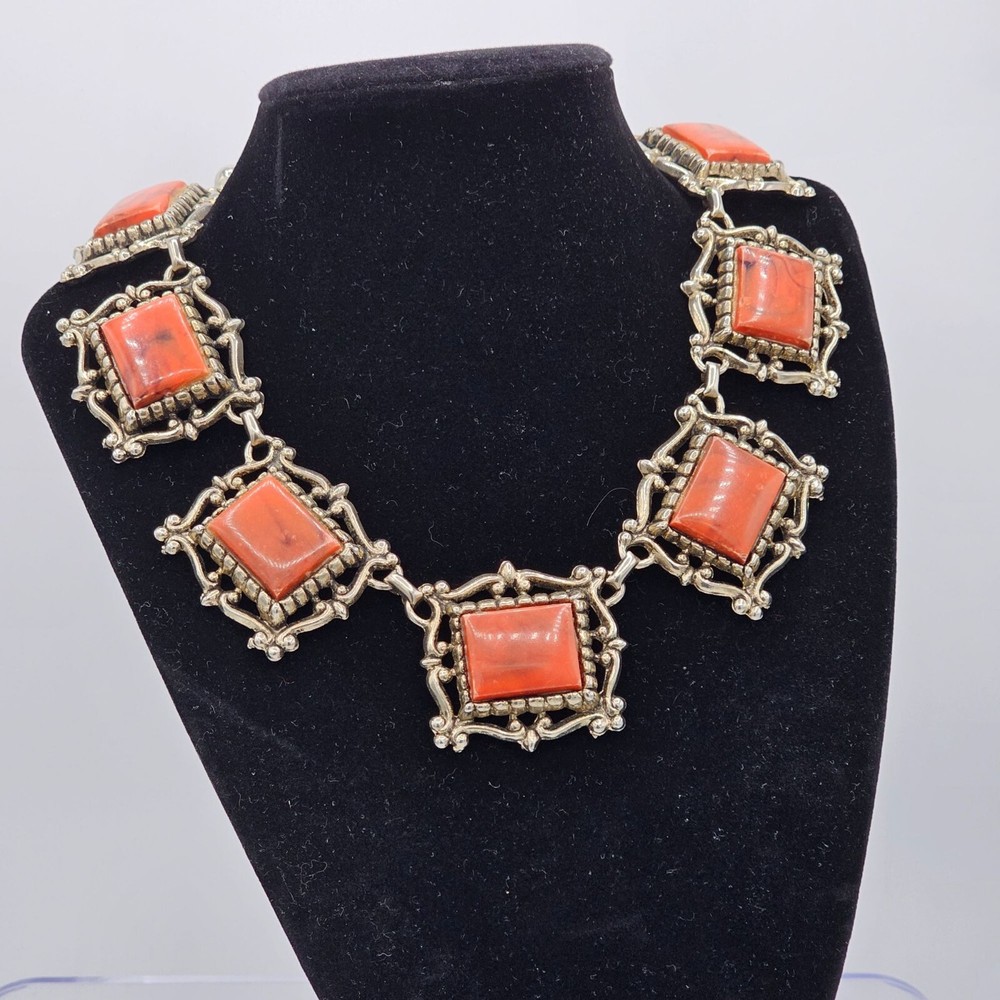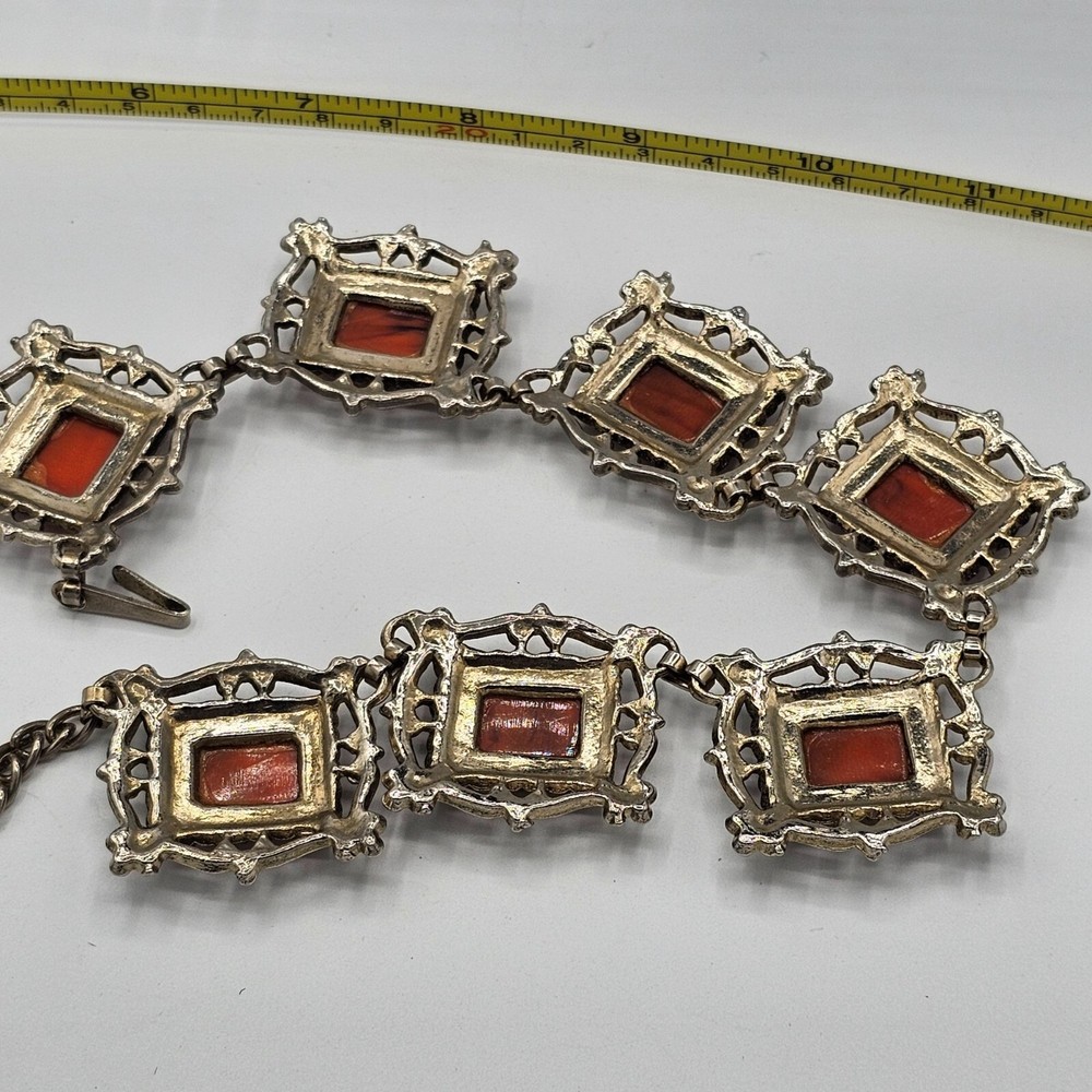 Mid Century Brutalist Tribal Intricate Metal Orange 22 in Very cool brutalist Tribal vintage necklace. I believe the orange stones are only plastic but they are set in intricate silver-tone metal. Has a hook clasp. Good condition for age and wear. Measures about 22 in