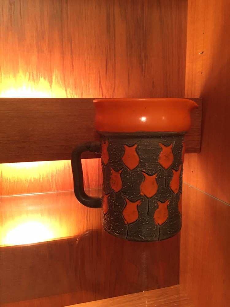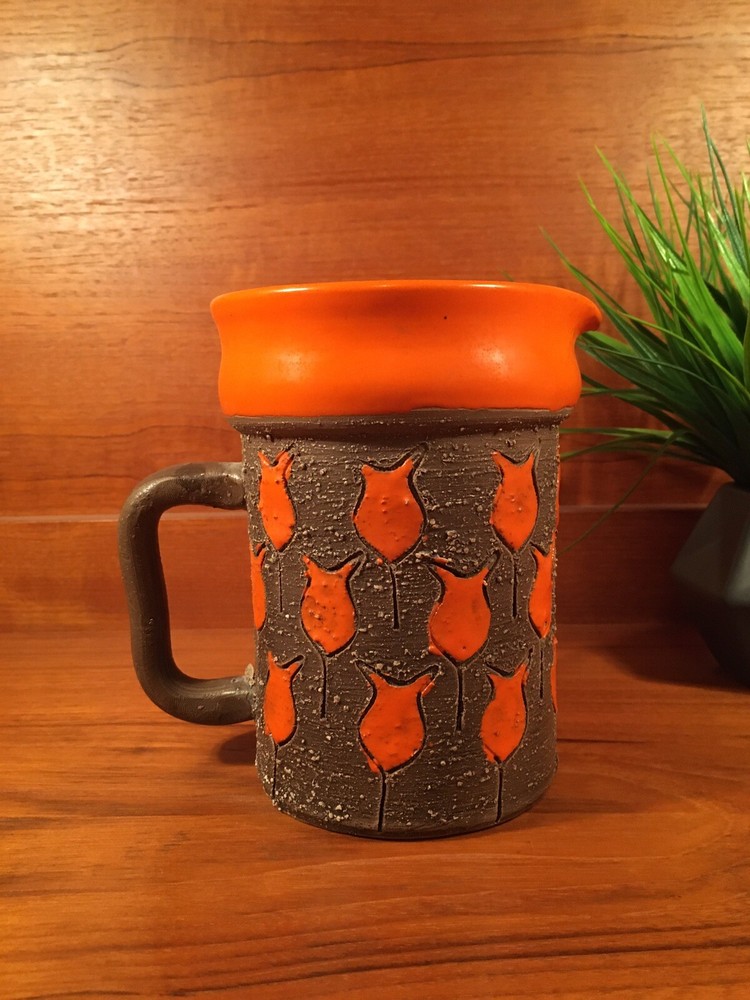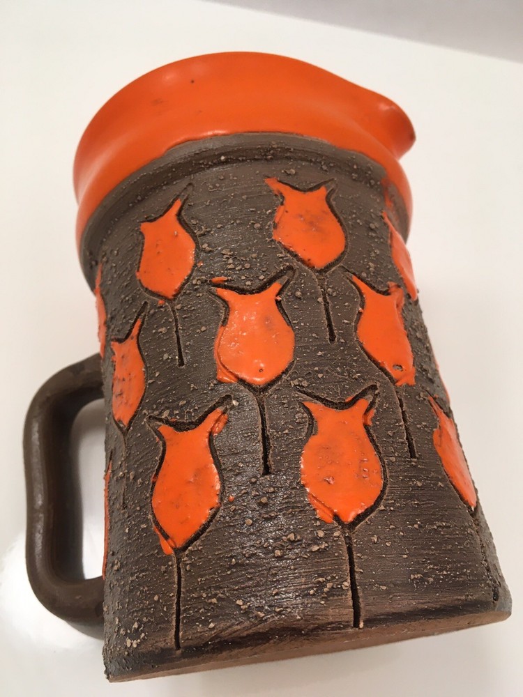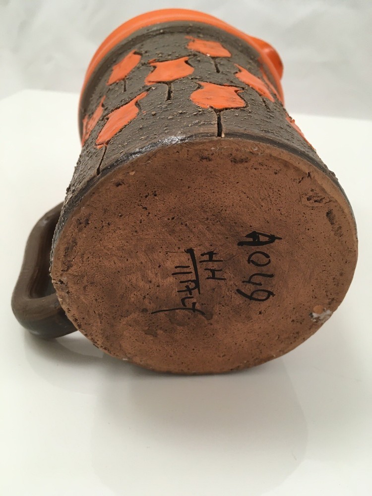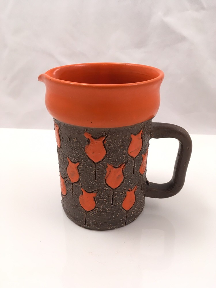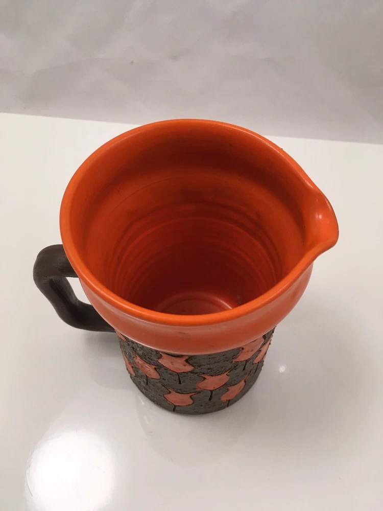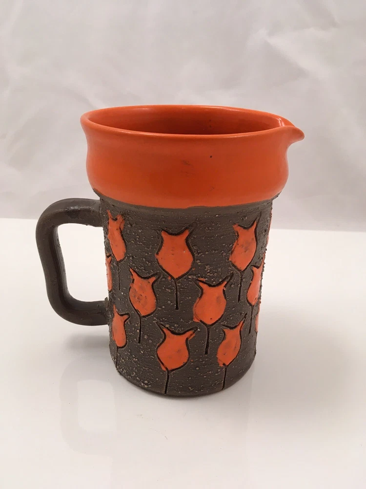 Mid Century Modern Vintage Holy Howard HH Italy Ceramic Pitcher Orange Brown. Great and rare little Holt Howard ceramic pitcher. Brown with orange tulip pattern. Wonderful textures. Great shape no chips or cracks, please see the photos. Marked HH made in Italy 4049. Measures 6x6x4.5 inches