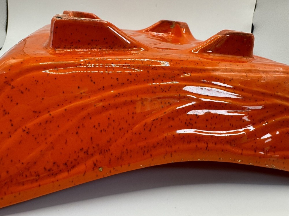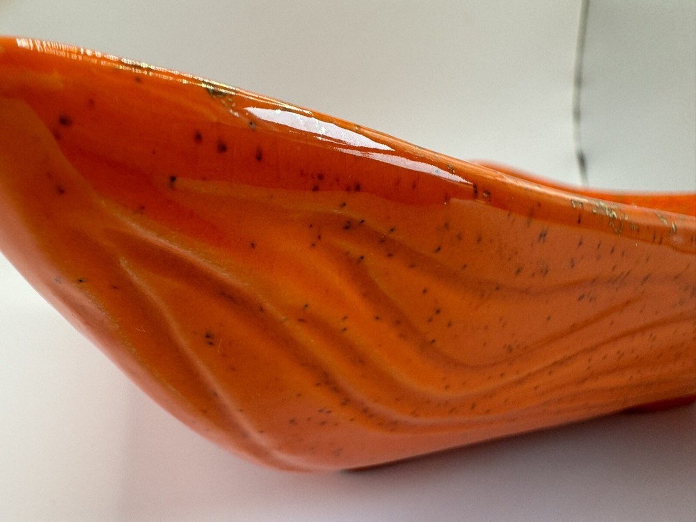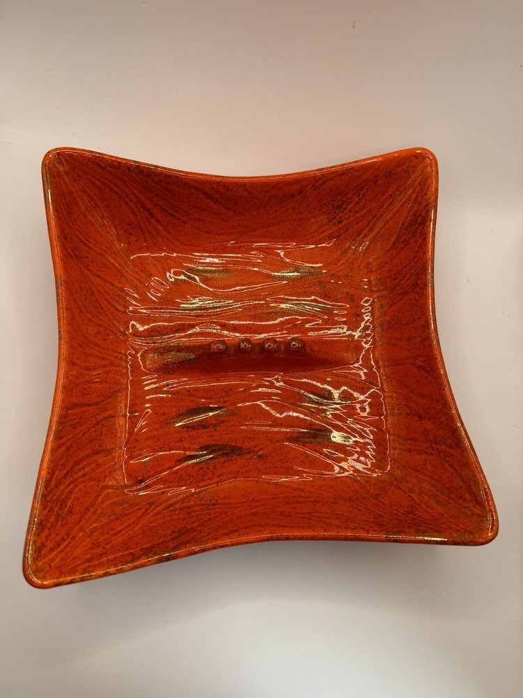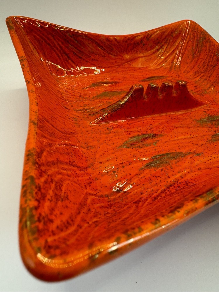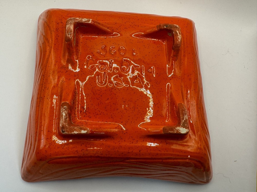 Add a touch of retro charm to your home decor with this vintage USA Pottery ashtray. The square-shaped ceramic ashtray features a glossy orange finish with gold wave accents, perfect for adding a pop of color to any room. Measuring 8.25 inches in length and 2 inches in height, this ashtray is suitable for holding cigarettes and other small items. The backstamp indicates that this ashtray is an original piece produced using the art pottery technique in California. With its mid-century modern style, decorative features, and unique production style, this ashtray is a must-have for any collector or vintage enthusiast.