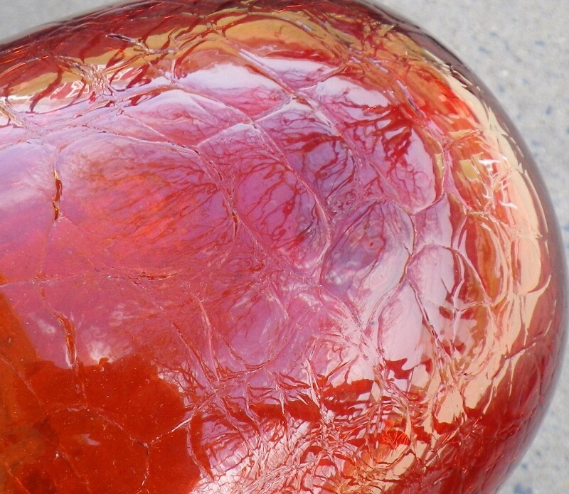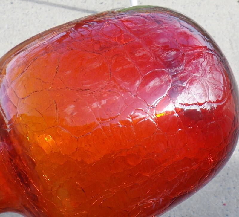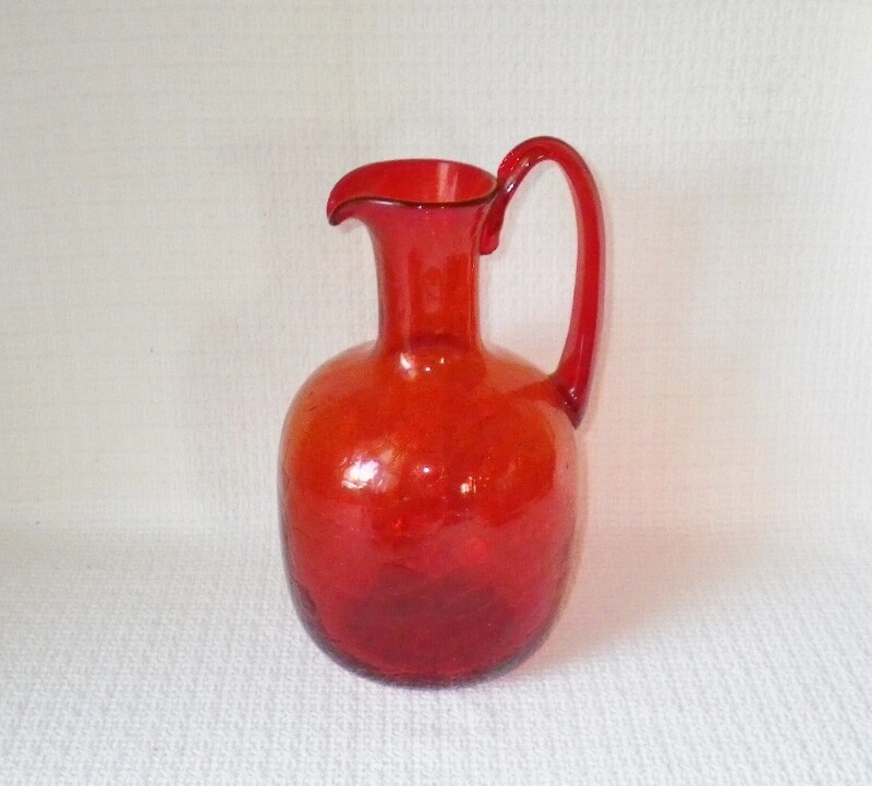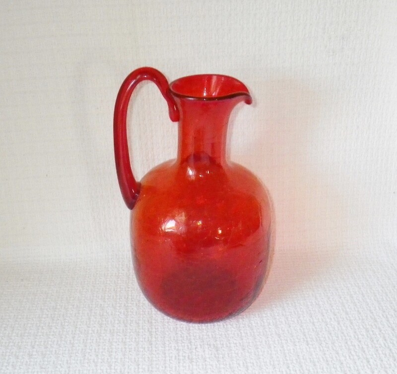 Great mid century blown glass pitcher or jug is a vibrant orange. The jug has an orange peel surface (looks almost like crackle glass at a glance) and an applied handle. It is approx. 11" tall. The jug is not signed/marked, but Blenko comes to mind. It is in very good condition, with no chips or cracks.