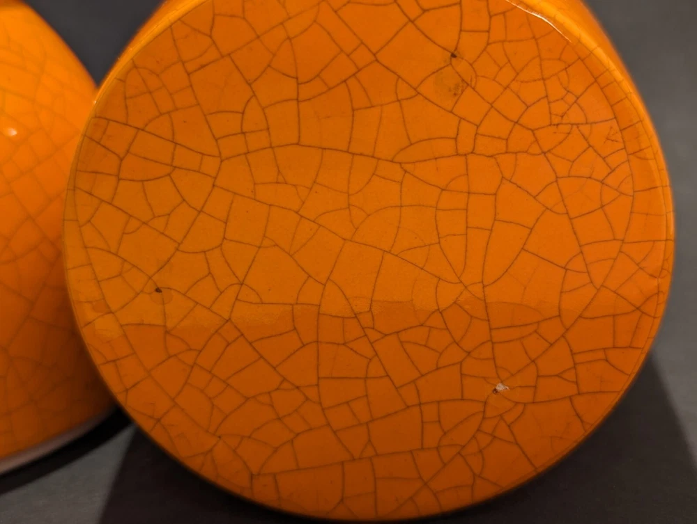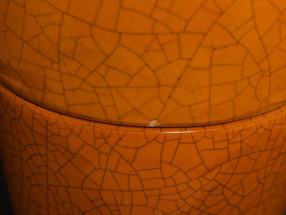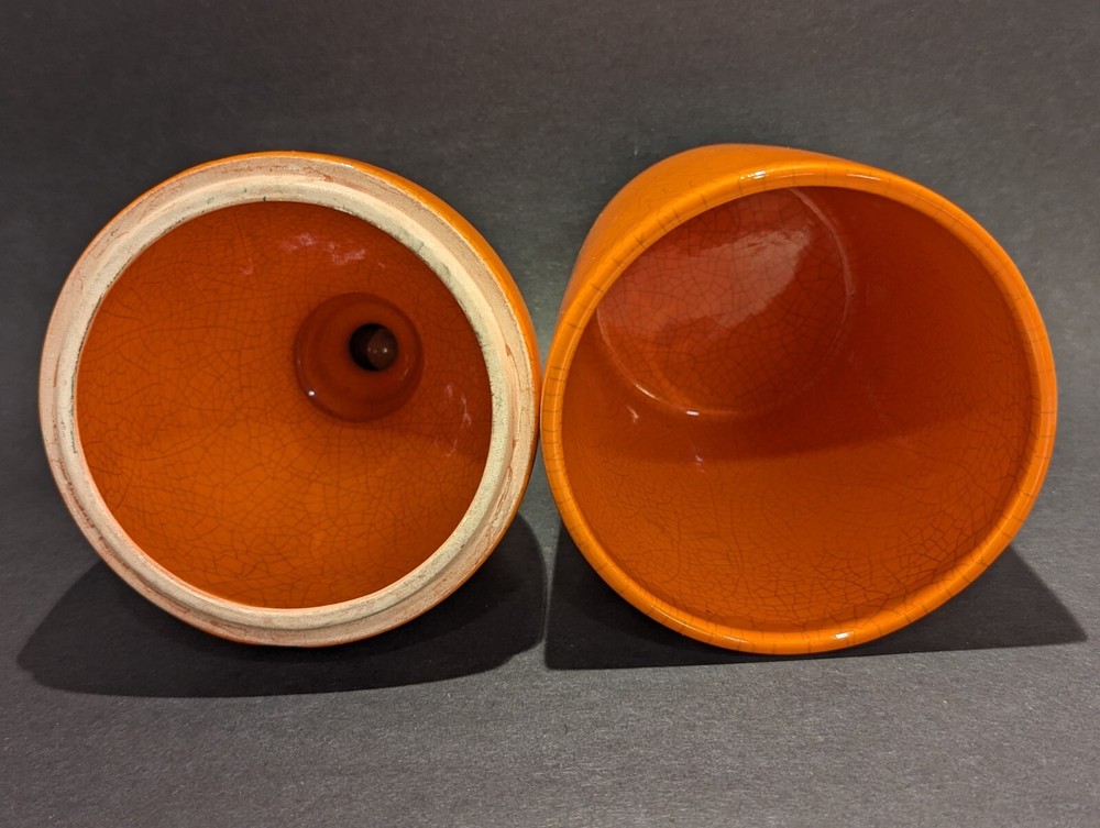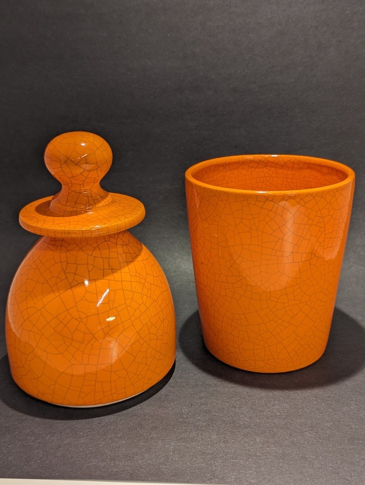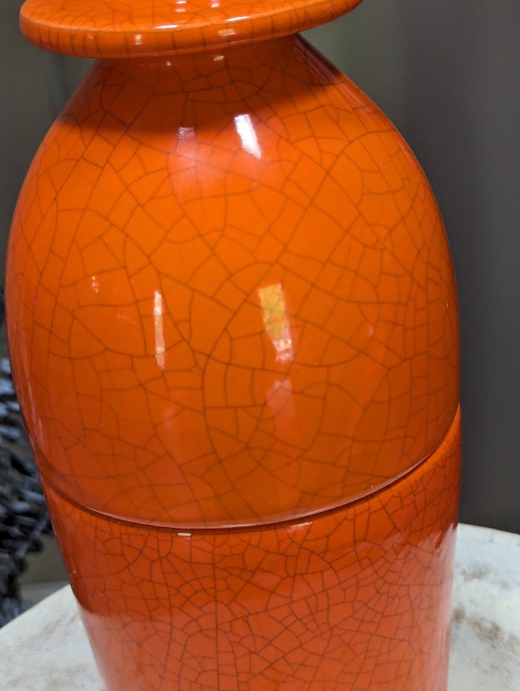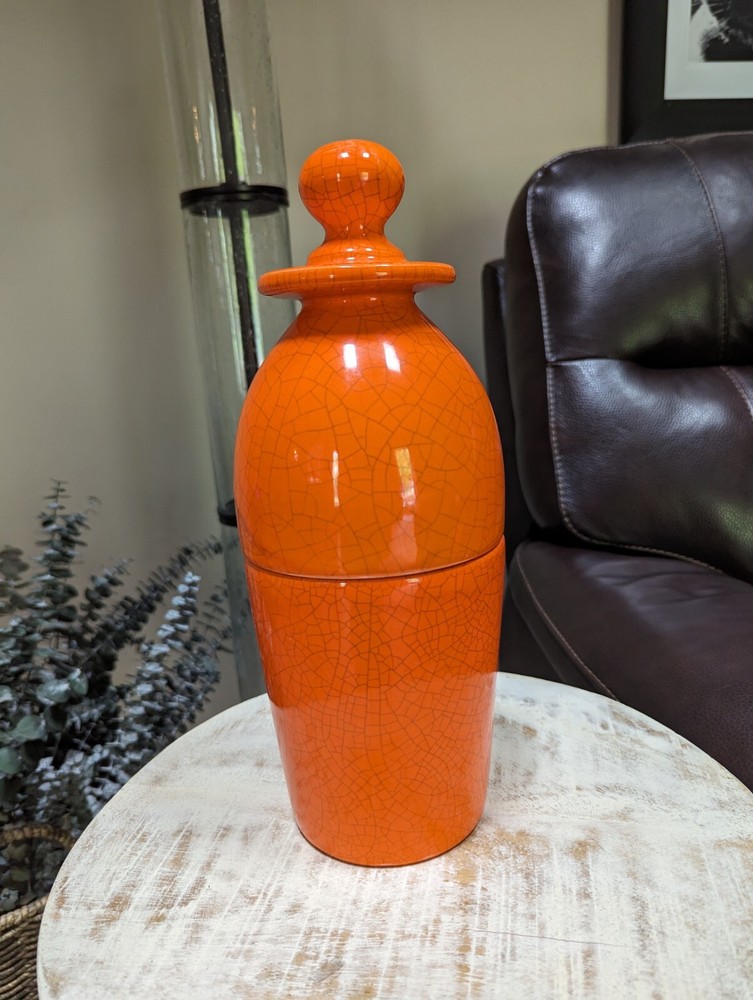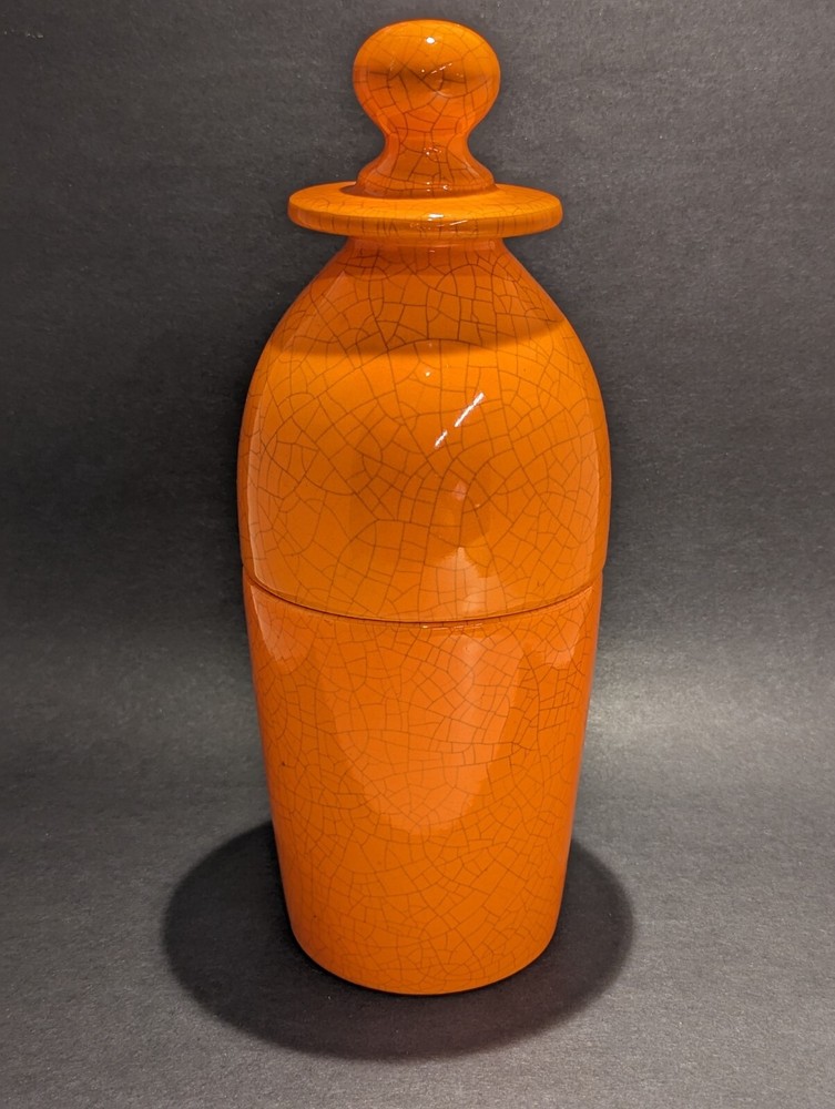 Vintage ceramic mid-century decor piece is orange with a crackled finish and comes in 2 pieces. The photo taken on the white table reflects it's true color. It stands 13 3/4"H. Base W/O top, is 5 3/4"H. At its widest point, it is 5". This can be used as decor or, can be used as a planter pot with the top removed. The condition is pre-owned, but good. The crackle finish looks great and the orange is vivid. There is a tiny nick next to one of the three holes at the bottom. There is small area on the rim of the lid that didn't receive glaze. It is not chipped. Please see photos. I use USPS, FEDEX, or UPS for shipping depending on the rate. Thanks for stopping by! Check back soon as new items are added often. Dazzleberry Blue