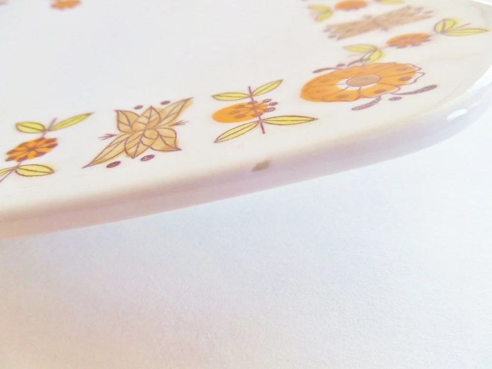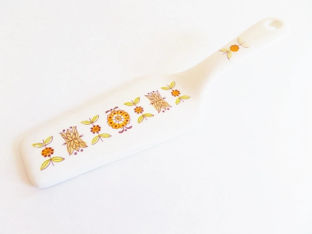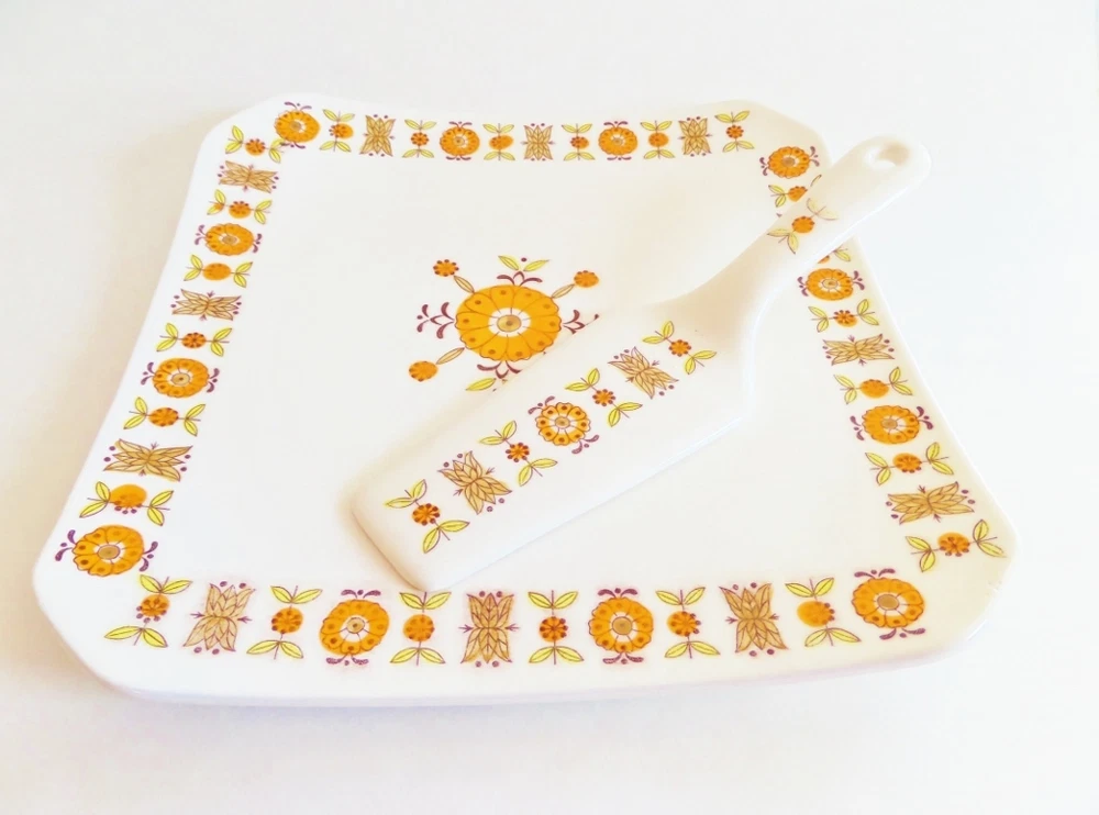This is a cute retro ceramic cake plate and matching server. The set was made in Japan in the 1960s or 1970s. The square swooping design of the plate is like a sushi plate. The bright orange, yellow, and brown colors pop against the white background. Just think how great a chocolate cake would look on it! The ceramic plate is in good condition, with some age appropriate wear. There are a couple of small chips of glaze on the edges. The plate is slightly wobbly, but I think that is because of the swooping design. You could put rubber button protectors on the bottom if it really bothered you. The server is in good condition, but has 3 spots underneath that look like the glaze has rubbed off (see the last picture.) The cake plate measures 10.25" square. The server is 9.375" long X 2.5" wide.