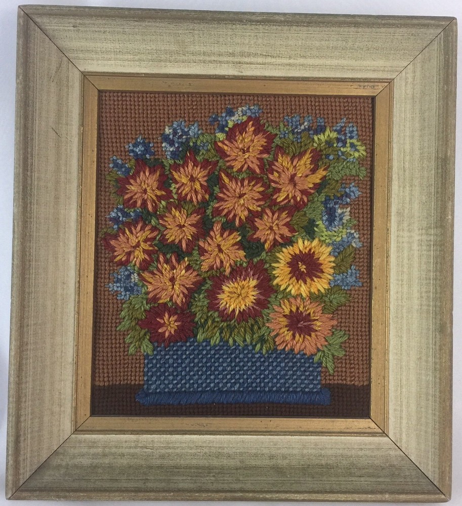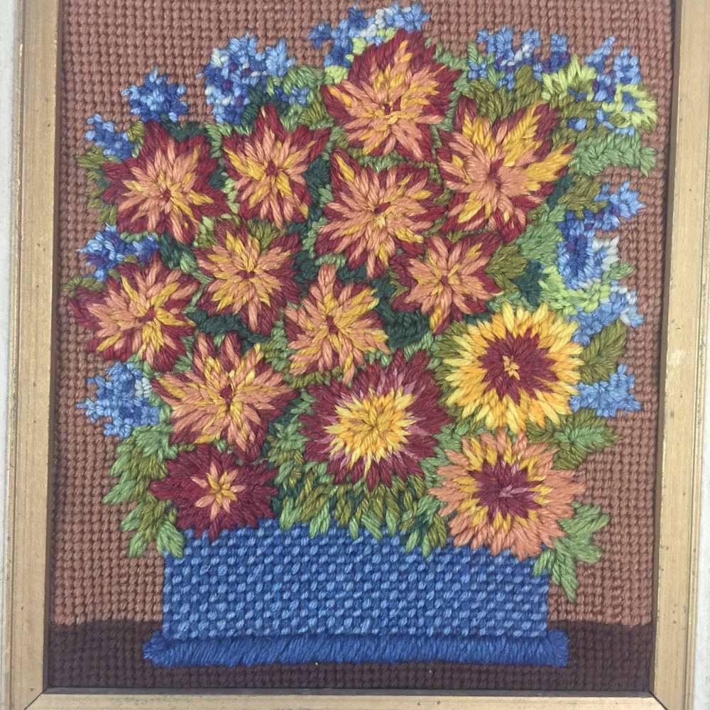 Gorgeous Mid Century Needlepoint of Orange Flowers In Vase Wall Art Decor. Framed in original Vintage Frame. Nice Vintage Condition: Could be restretched and placed under glass if you prefer. Approximate Dimensions: Height: 11.25" Width: 10.25" Depth: 2.5" Thank you for shopping Maries Curio