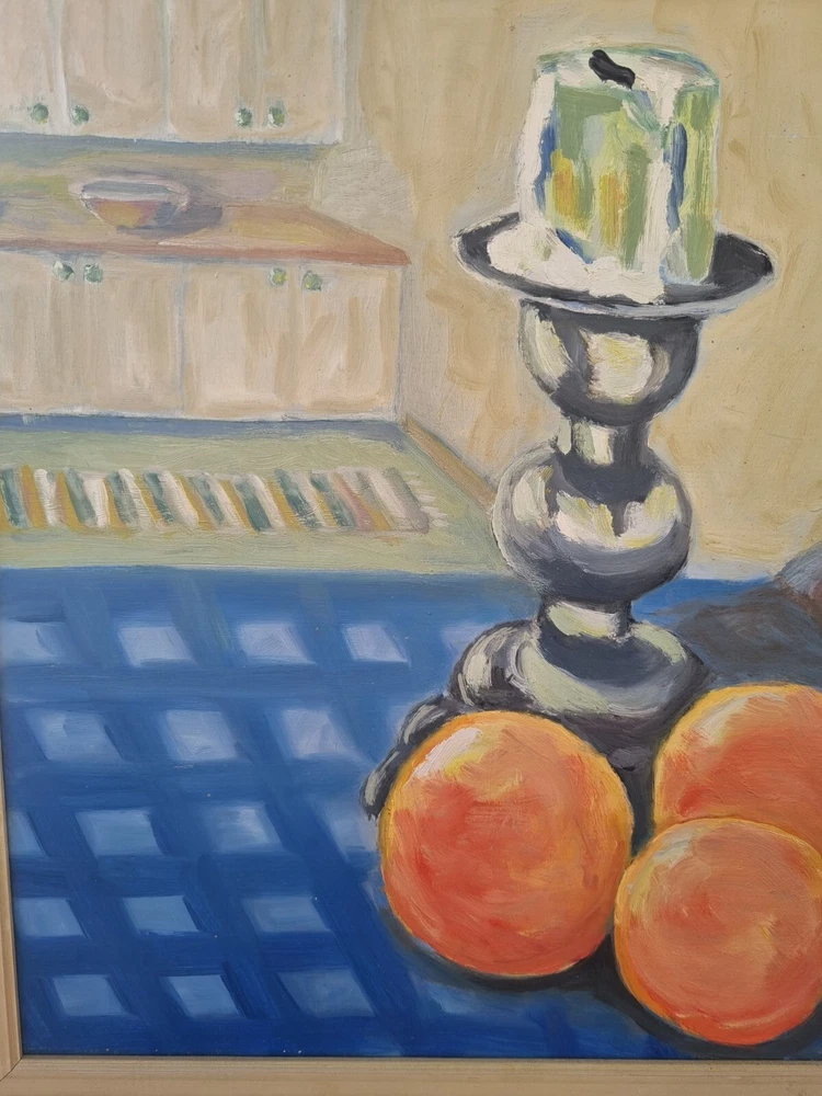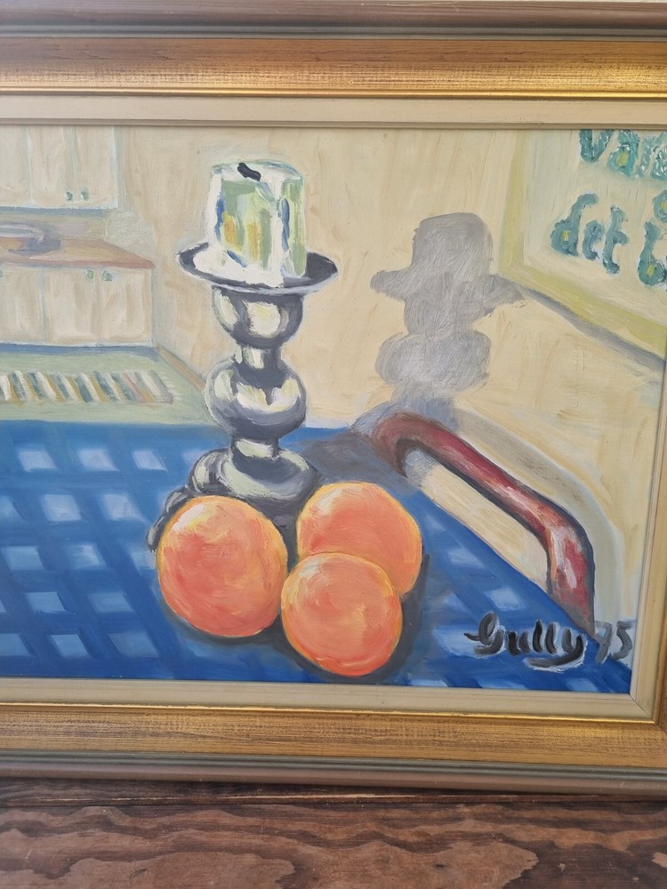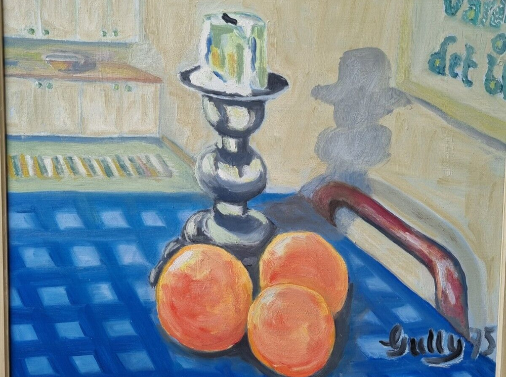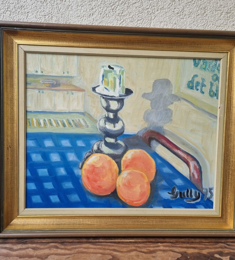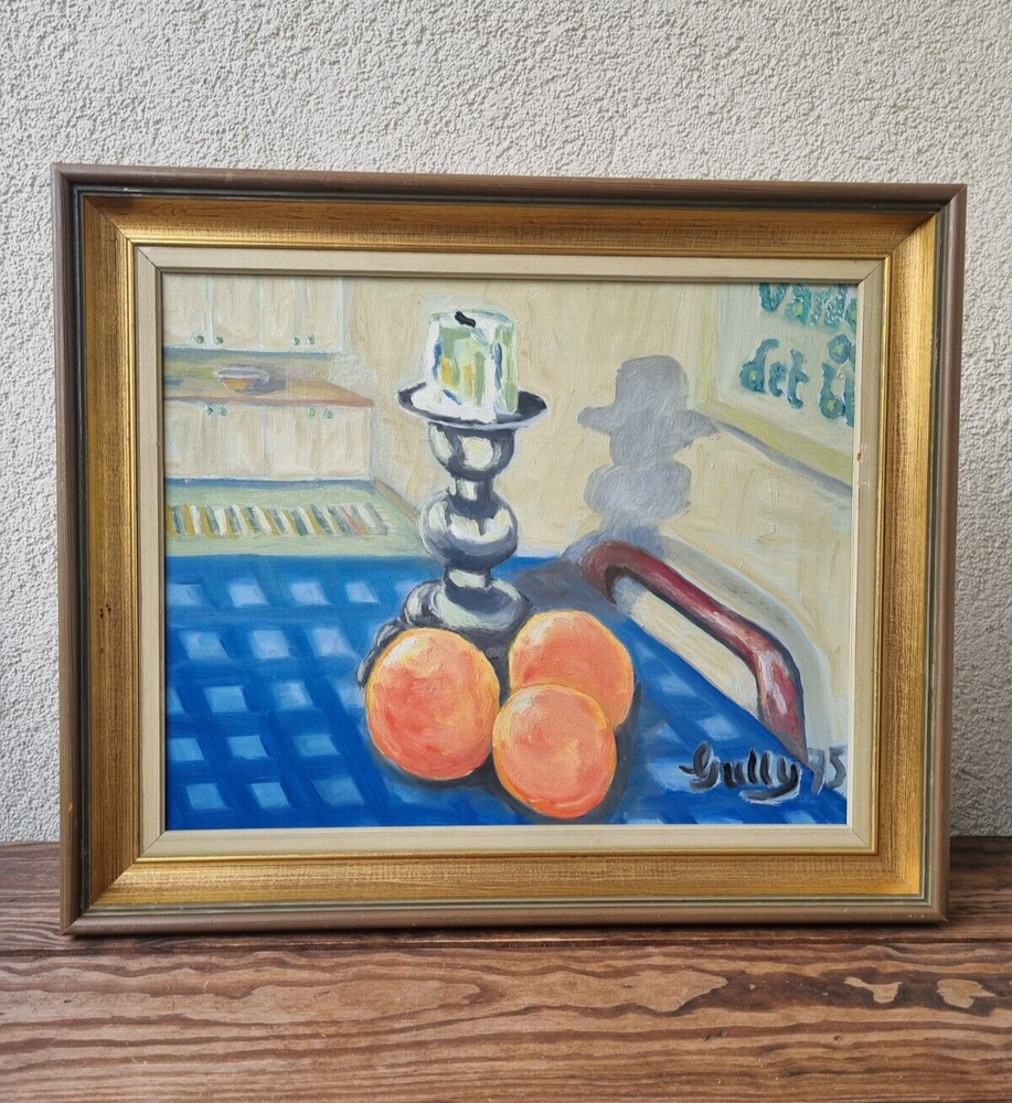 Mid Century Original Still Life Oil Painting From Sweden- still life with oranges. Expressive, bright still life with oranges and a candlestick. Bright contrast of oranges with a blue tablecloth, in the foreground, kitchen interior. Good mood painting, done in oil on board, unknown Swedish artist's signature in the lower right corner -Gully, dated 75. The painting itself is in excellent condition and comes with the original wooden frame. Framed Painting size 49x 41 cm/ 19x 16 inches. Perfect vintage art for your home! Color can change our feelings, alter our behavior and change lives!