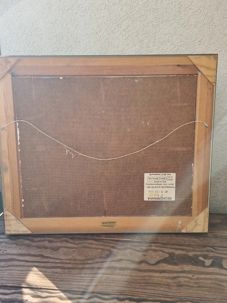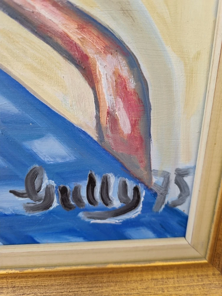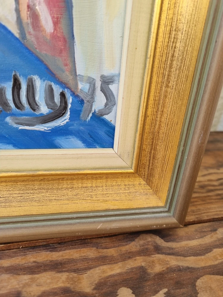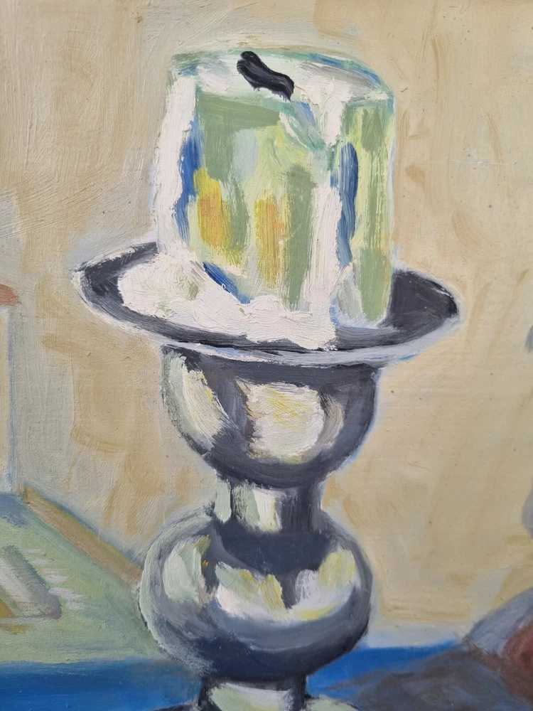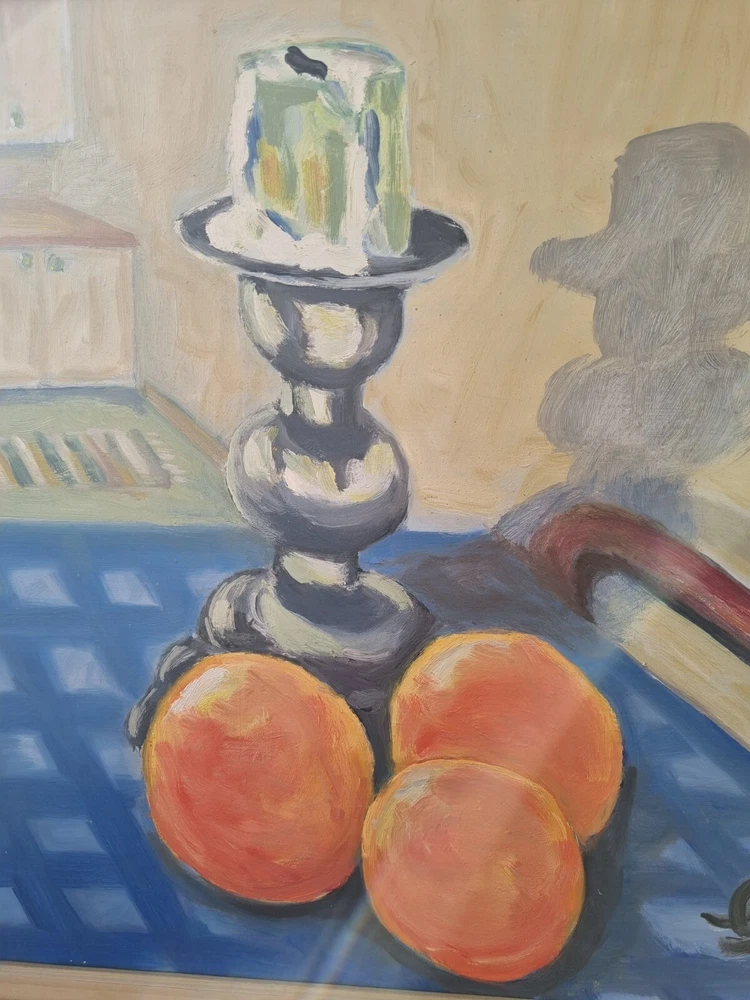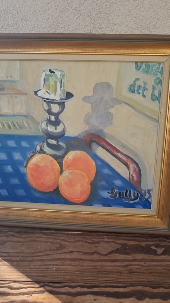 Mid Century Original Still Life Oil Painting From Sweden- still life with oranges. Expressive, bright still life with oranges and a candlestick. Bright contrast of oranges with a blue tablecloth, in the foreground, kitchen interior. Good mood painting, done in oil on board, unknown Swedish artist's signature in the lower right corner -Gully, dated 75. The painting itself is in excellent condition and comes with the original wooden frame. Framed Painting size 49x 41 cm/ 19x 16 inches. Perfect vintage art for your home! Color can change our feelings, alter our behavior and change lives!