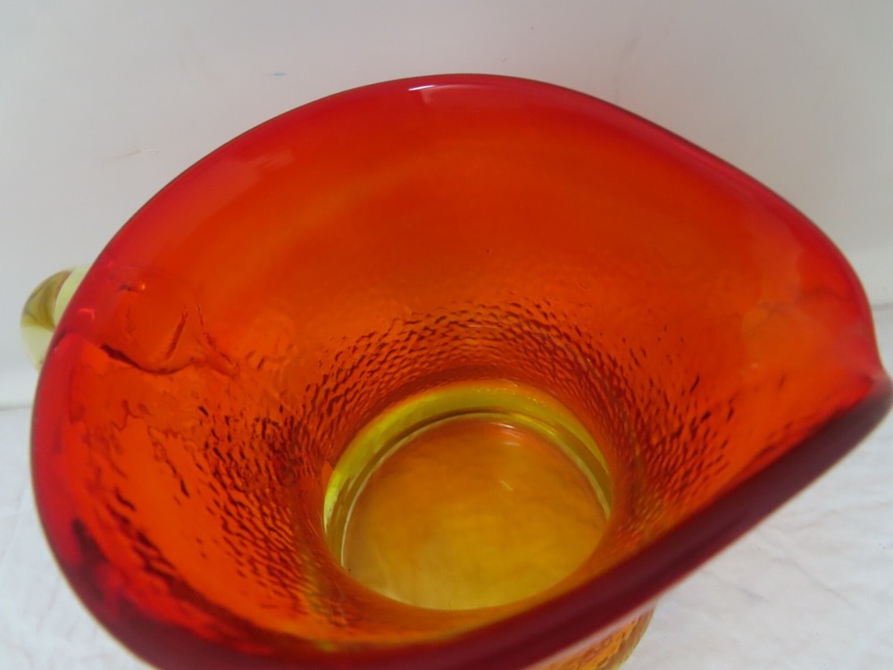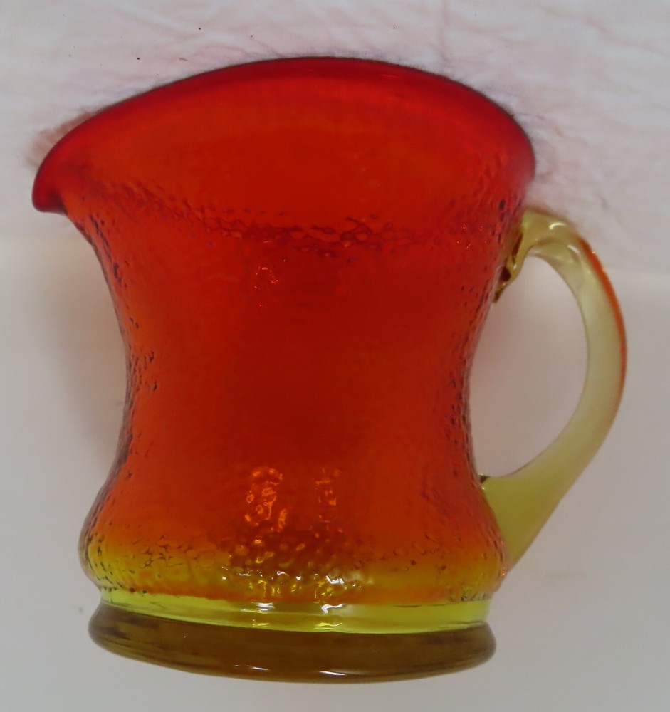Crackle Glass Amberina Small Creamer Milk Jug Pitcher This lovely small Creamer/Pitcher is made out of crackle glass, and is in good condition. This Creamer has a classic handled silhouette, a delightful Amberina red and yellow color to the glass, and a delightful texture to the glass from the crackle glass. Measures 3 1/8" tall, diameter of top without the spout is a little less than 3" No chip or cracks. Weigh 7.5 oz Track Page Views With Auctiva's Counter