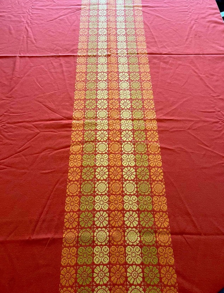 Vintage Mid Century Danish Cotton Tablecloth By Sebbelov Burnt Orange Color With Center Pattern Measures Roughly 58" x 100" Slight Fading Few Small Blemishes Shown In Last 2 Photos Overall Good Condit...