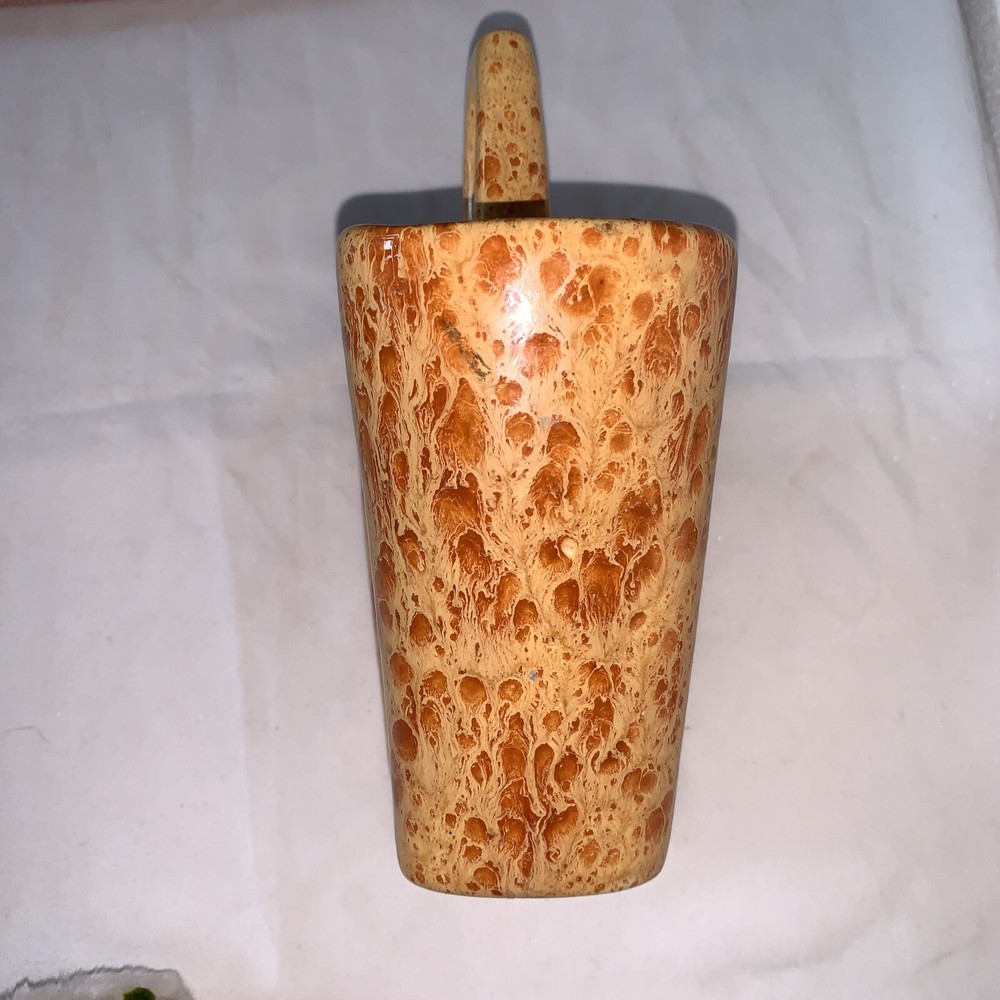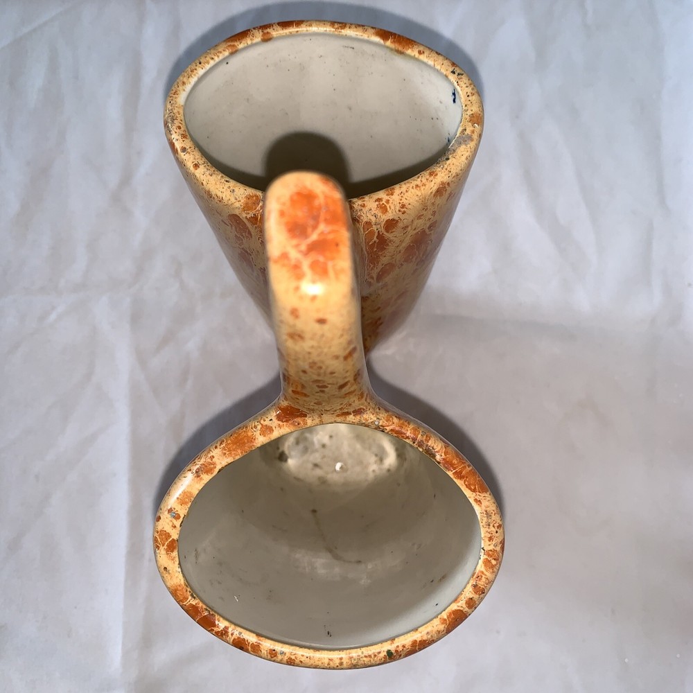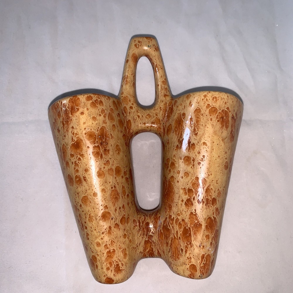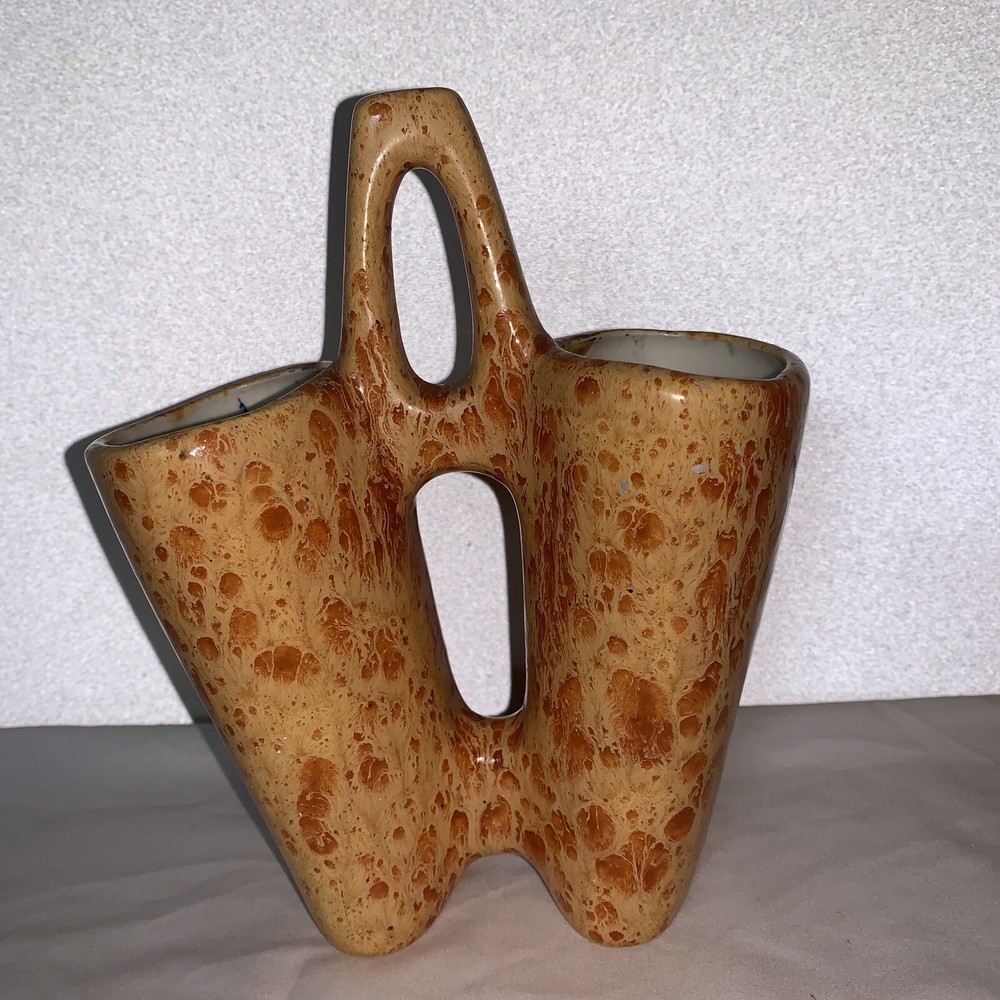 Handmade planter utensil makeup brush holder vintage ceramics abstract design in glazed orange splatter glaze finish 8 inches high and 6.5 inches wide perfect for displaying small plants or holding kitchen utensils Signed NORMA LUV DOT ’75 Neat piece See pics please