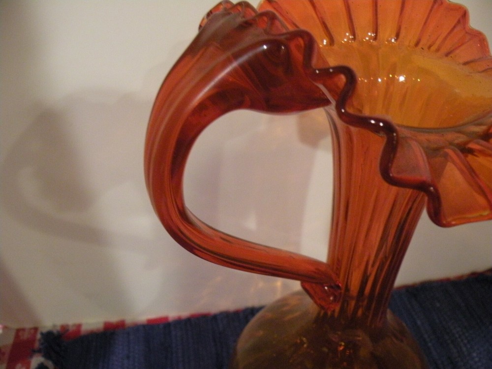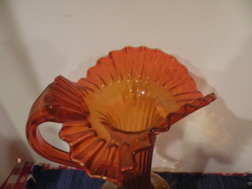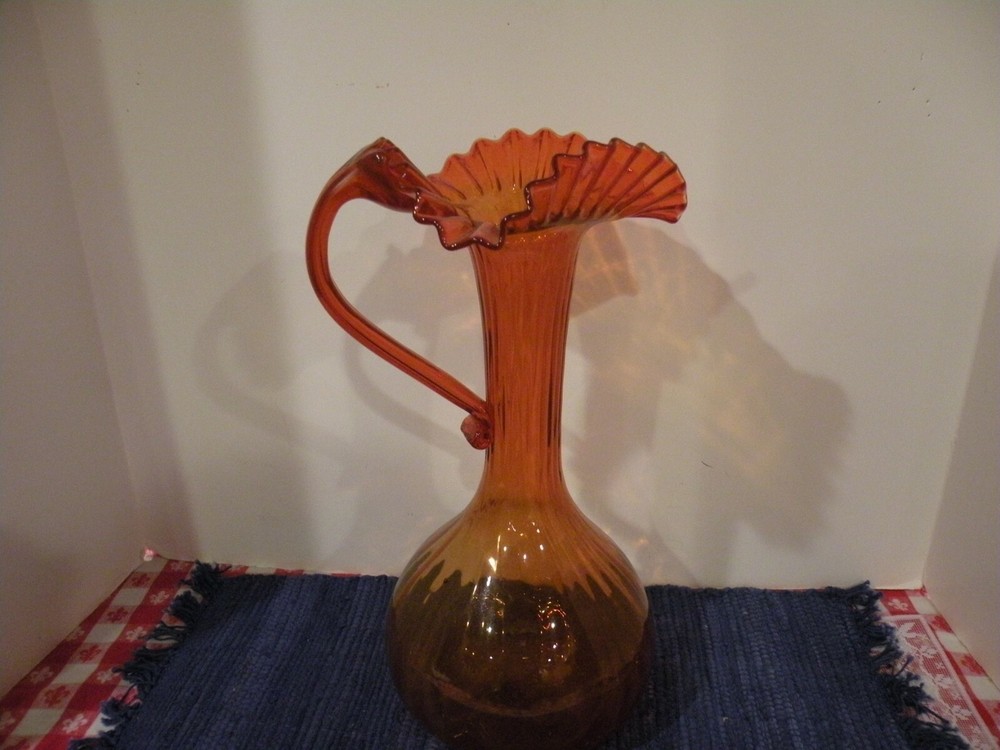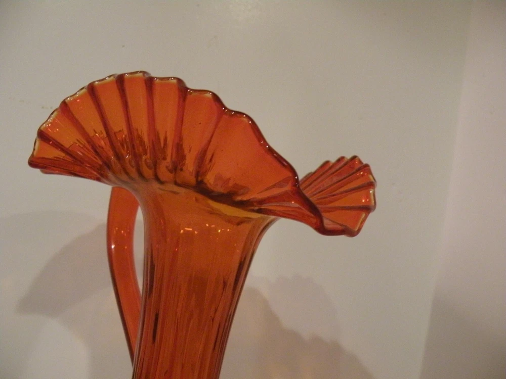 Mid- Century beautiful Tall orange glass Pitcher. The Pitcher measures 13 1/2' tall and the opening is 7". The pitcher has a ruffled wide edging with an applied handle. The stem is rippled glass. Pitcher is roughly 20" around the widest area. Condition excellent no chips or damage. Postage parcel select, priority or FedEx mail you choose. Thanks for looking!