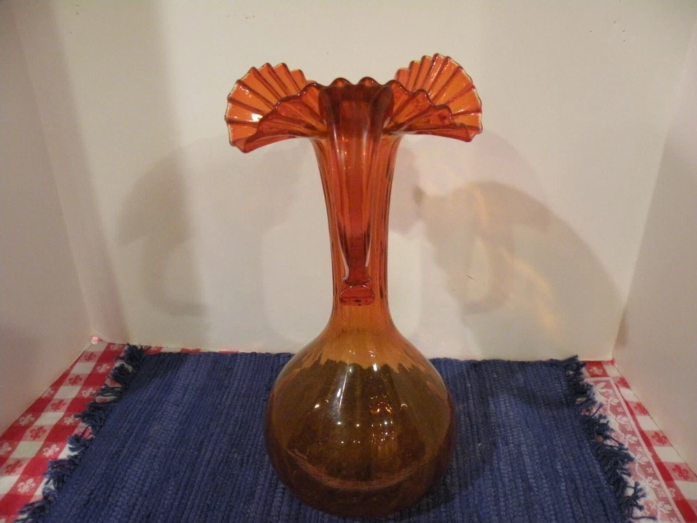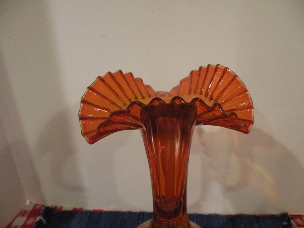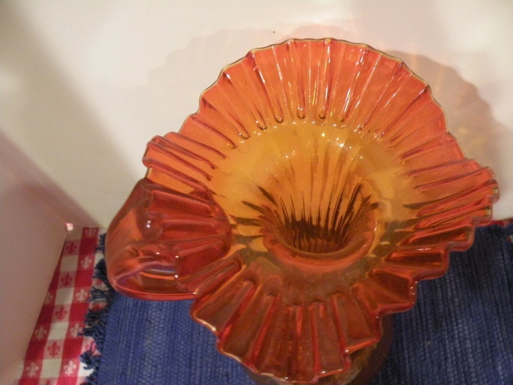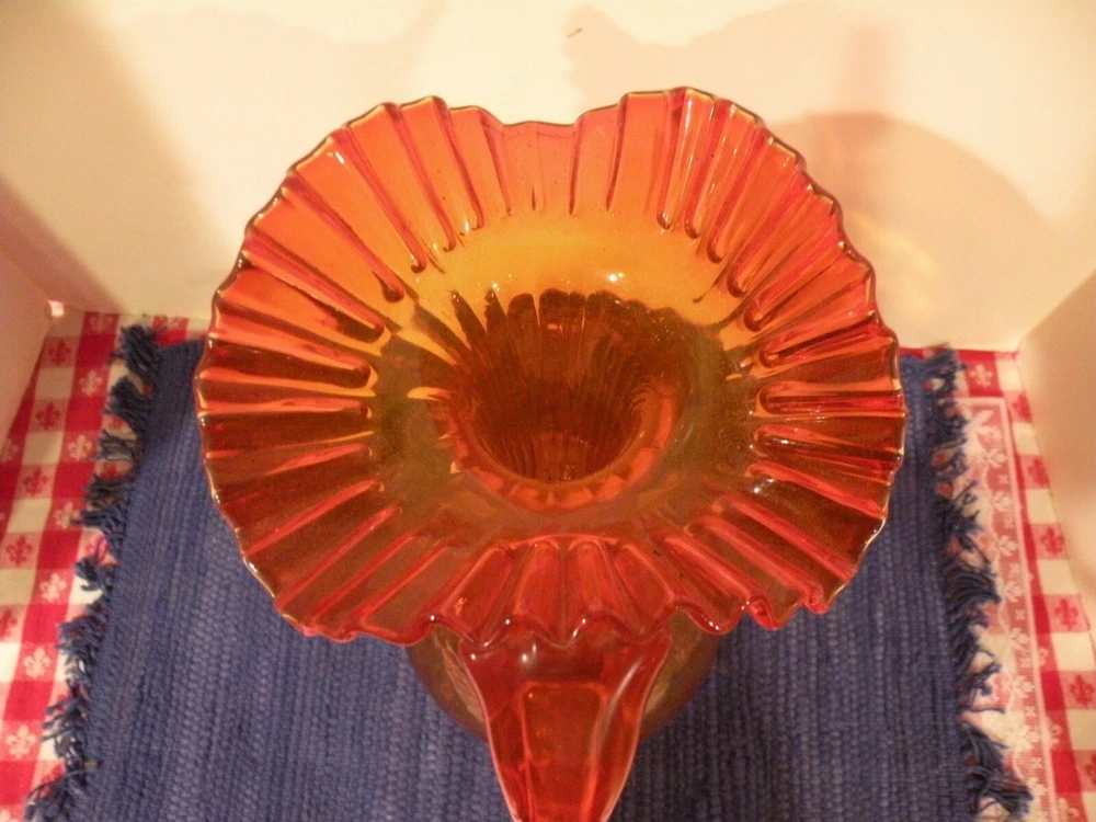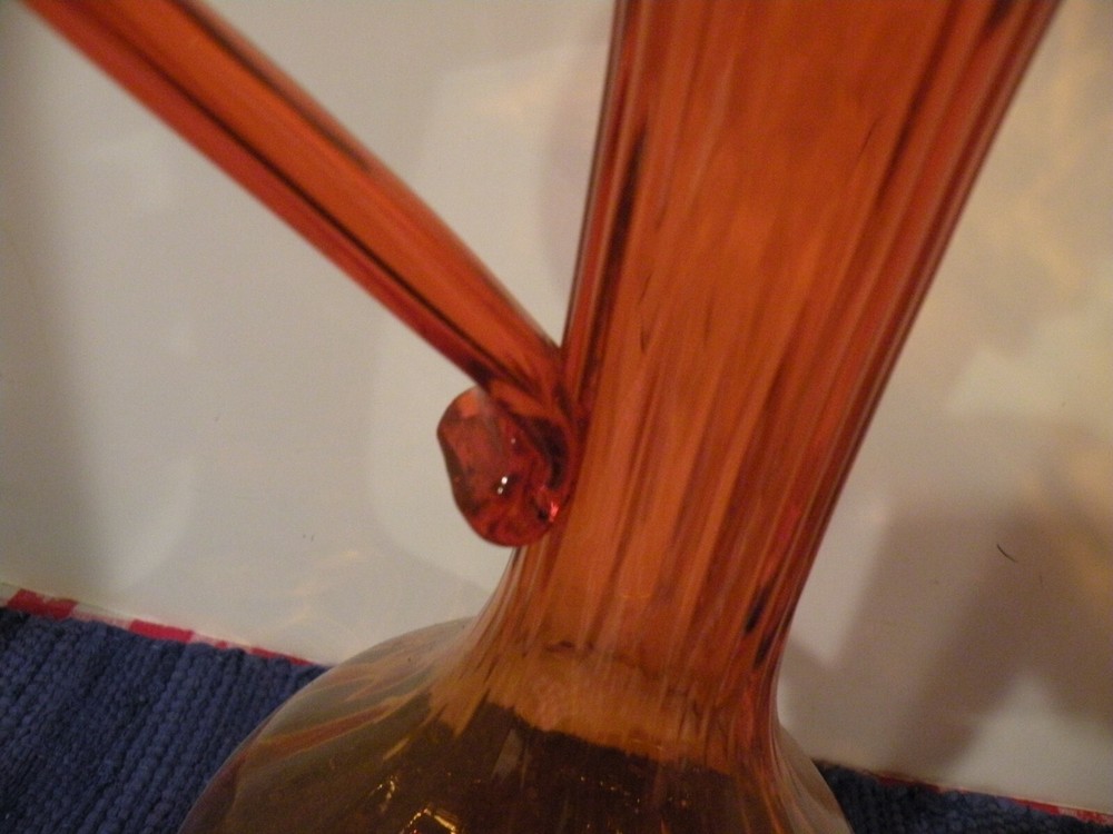 Mid- Century beautiful Tall orange glass Pitcher. The Pitcher measures 13 1/2' tall and the opening is 7". The pitcher has a ruffled wide edging with an applied handle. The stem is rippled glass. Pitcher is roughly 20" around the widest area. Condition excellent no chips or damage. Postage parcel select, priority or FedEx mail you choose. Thanks for looking!