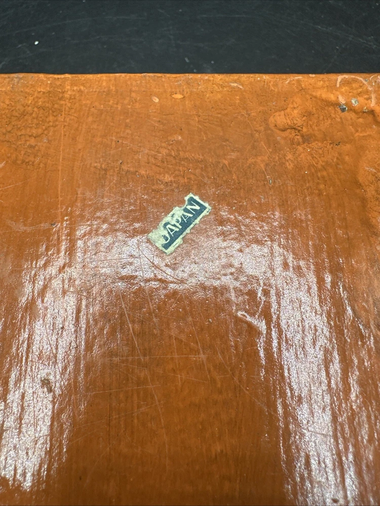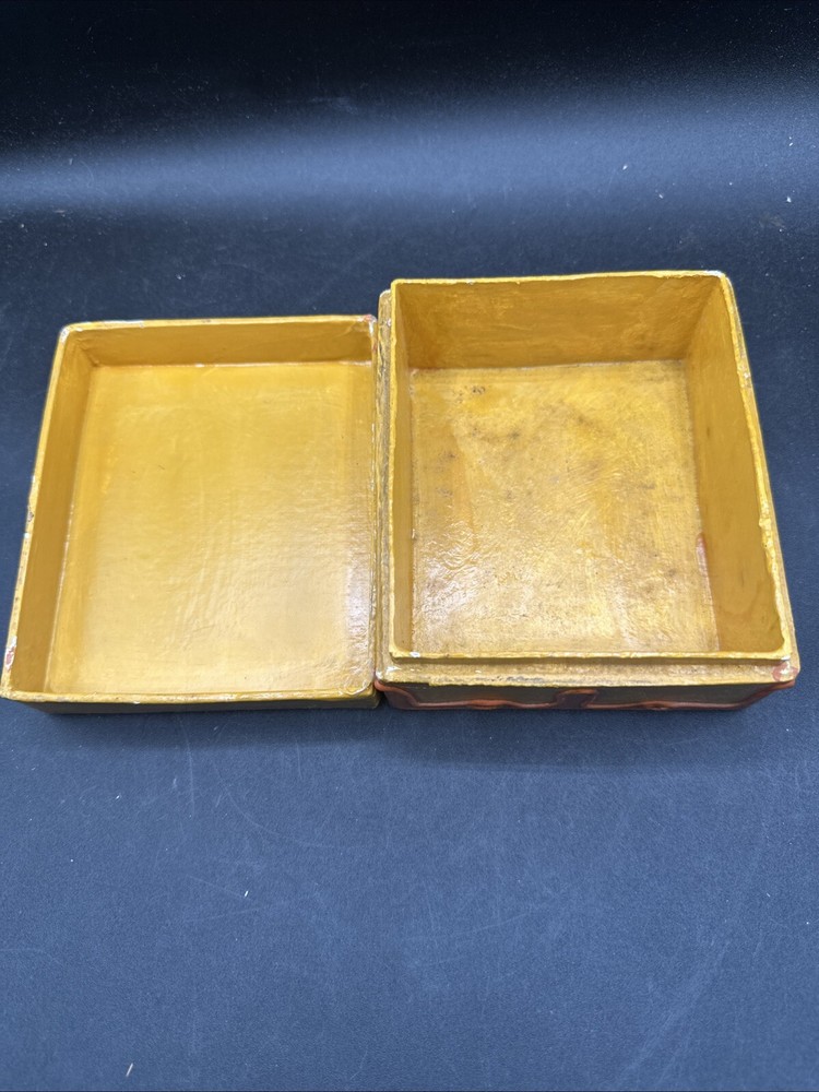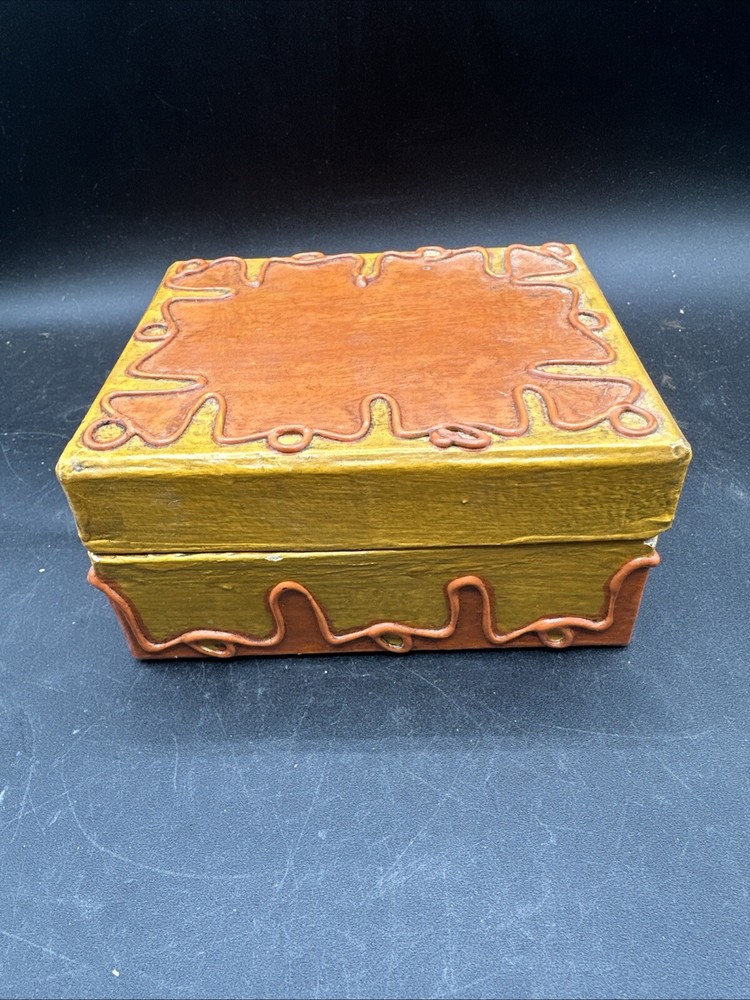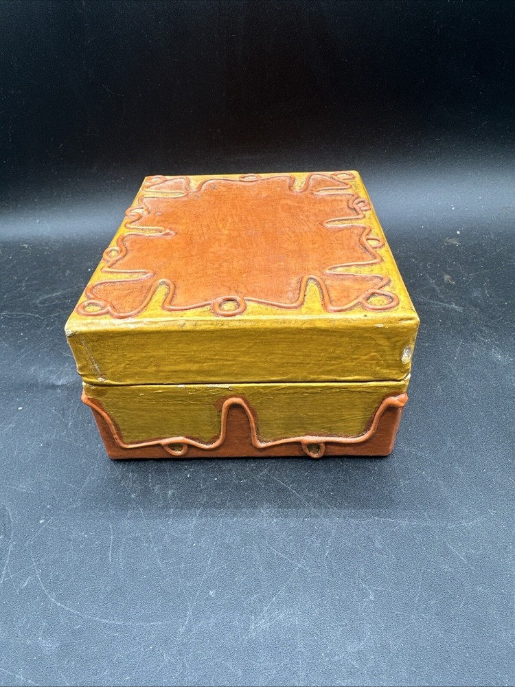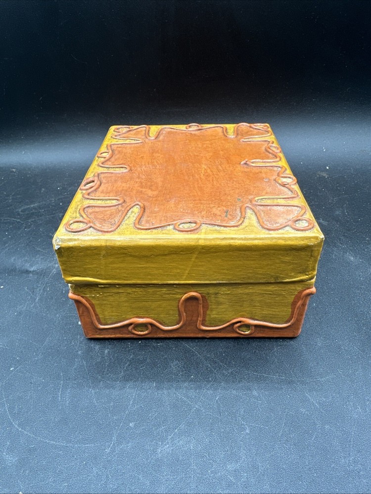 The trinket box is from the mid-century era, featuring a design in orange and yellow colors. It is made in Japan and has a boxing theme. The brand is CENTURY, and it comes boxed. This decorative collectible item is a unique addition to any collection or a stylish way to store small items.