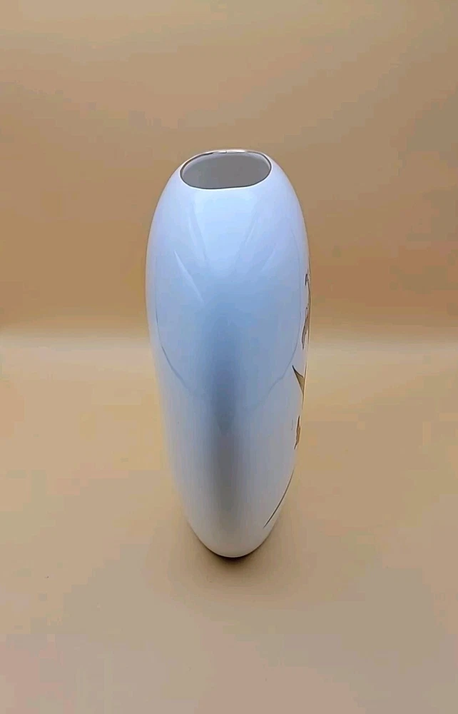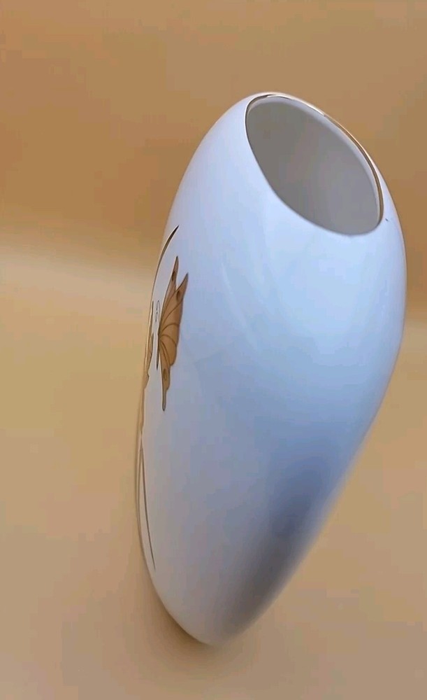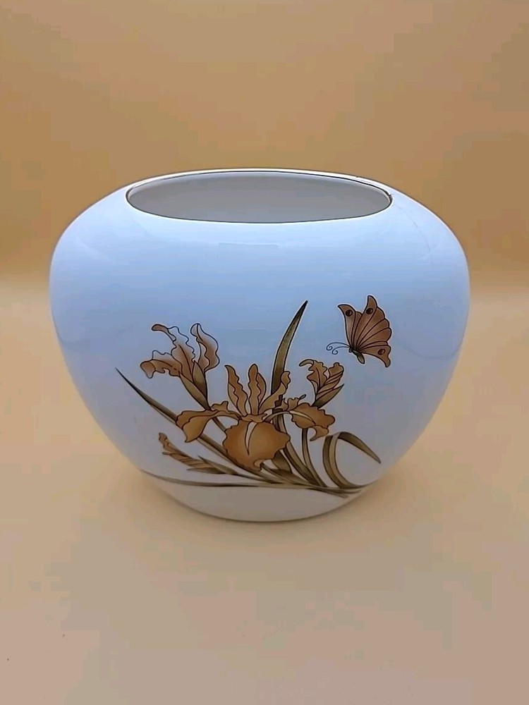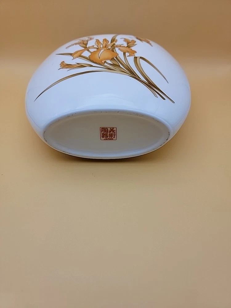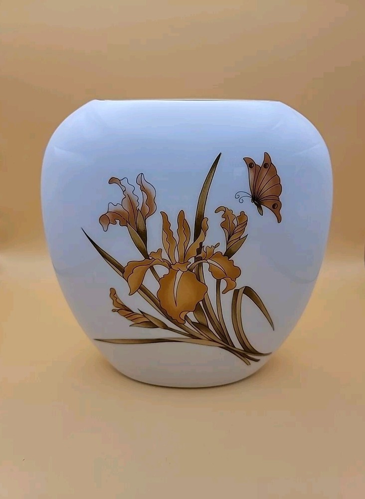 Pretty very unique design. Mid Century Made in Japan Vase with a Gold and Orange Lilly and Gold and Orange Butterfly. Really nice shape and in excellent vintage condition. No Chips. There is a hair line fracture in the last picture, it's at the top. The Vase measures approximately 7 1/4" T X 7 1/4" Please!, look at all the pictures as they are part of the description. If you have any questions about it, please message me about it before purchasing.