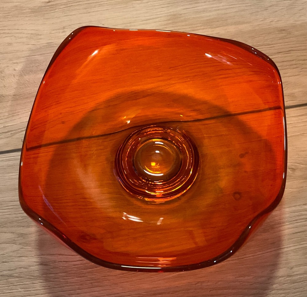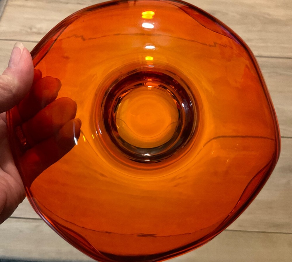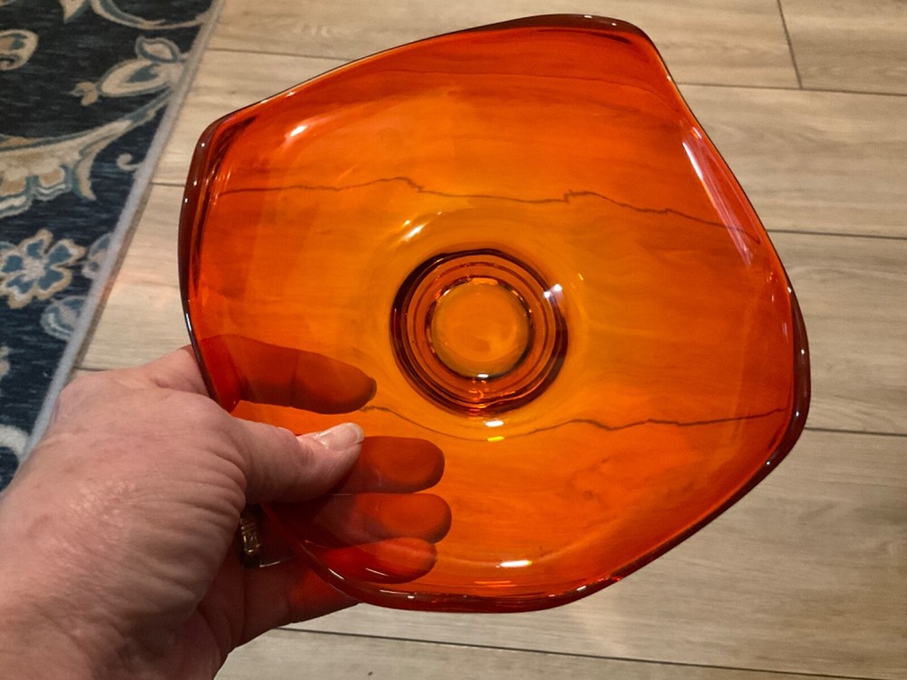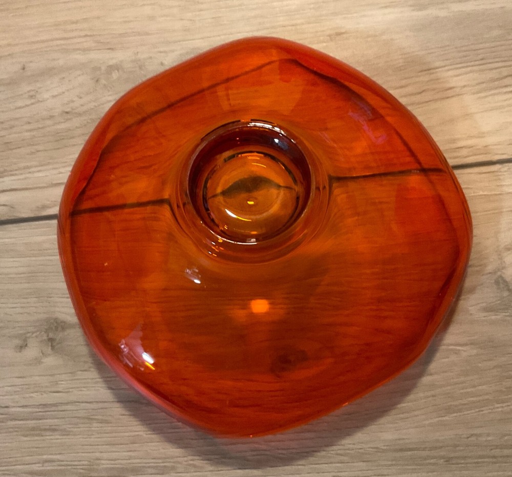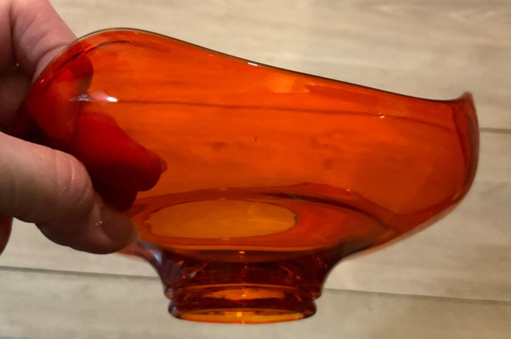 Mid Century Viking curved edge candy dish in stunning orange glass. This is a beautiful dish and in excellent condition but I am downsizing and have to let it go to a new home. Measures approx 7” by 2 1/2”. Perfect for adding to your Vintage Decor Vibe.