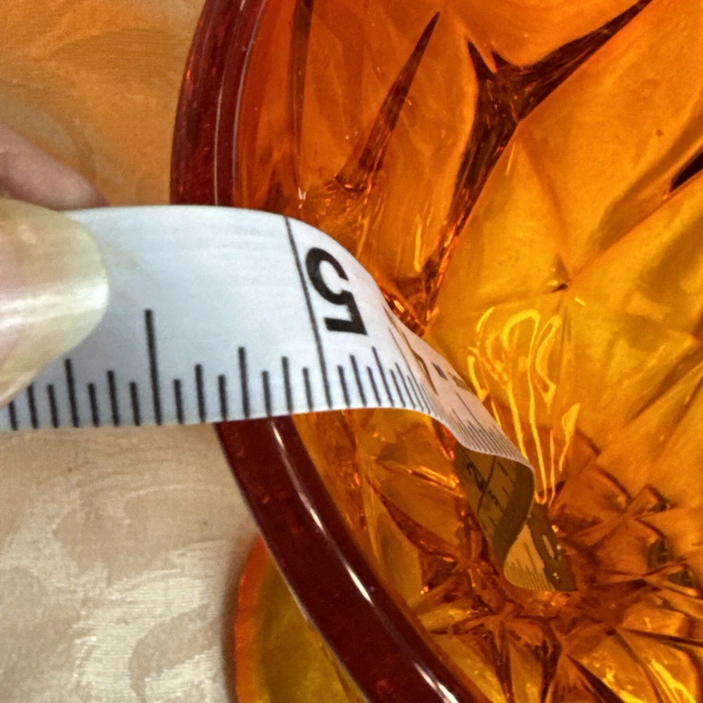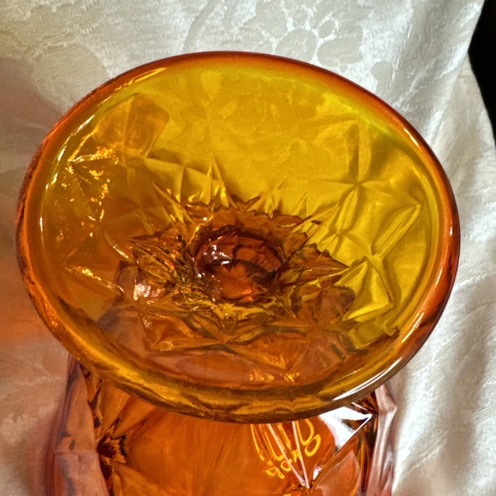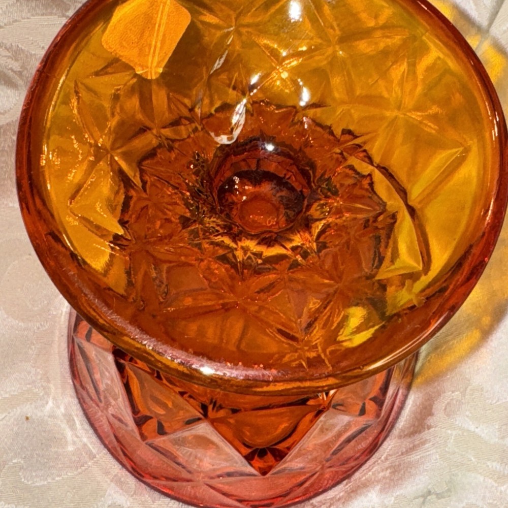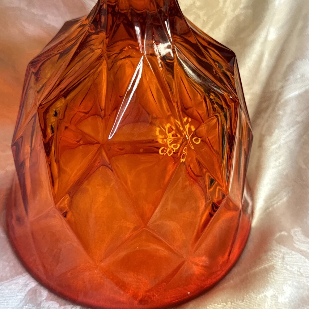 Pictures are part of description. Please ask questions needs a little more cleaning. I see some dripped wax beautifully colored orange persimmon Viking sticker on glass no chips or dings excellent shape for age.