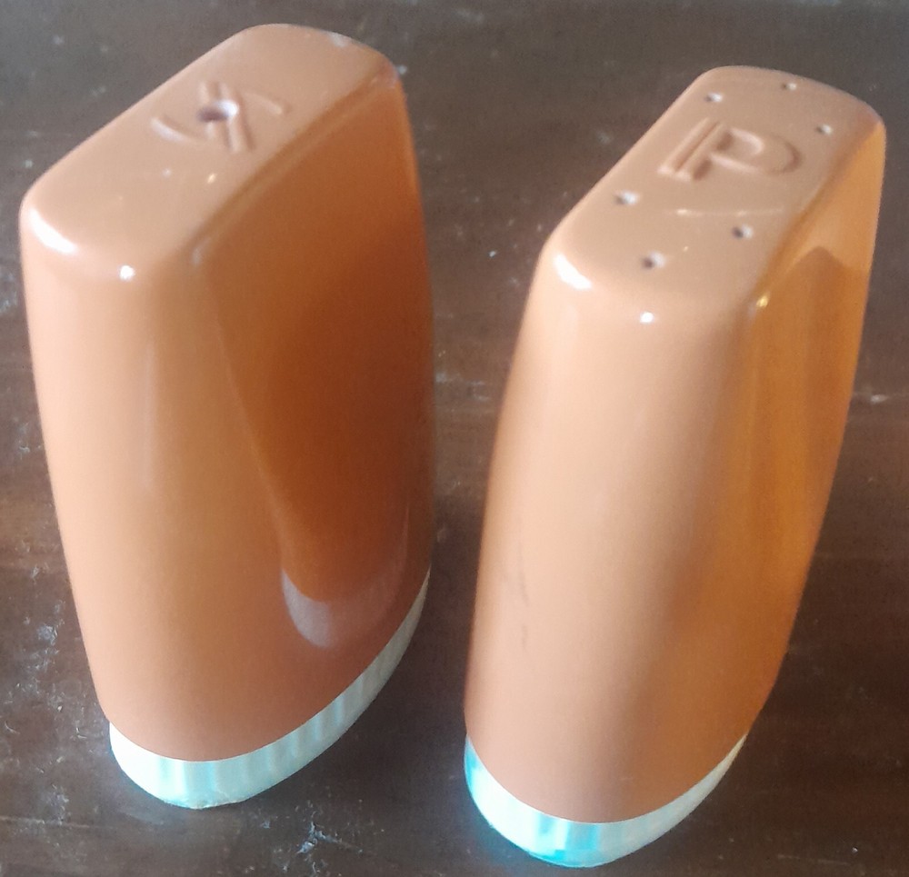 Add a pop of colour to your kitchen with these vintage Bessemer Ware salt and pepper shakers from the 1950s. The set includes two shakers in rich orange, perfect for adding a retro touch to your dining table or picnic set. Made of durable plastic , these shakers are in as-new condition and are an original piece from the mid-century era. They are suitable for use with both salt and pepper, making them a versatile addition to your kitchen tools or picnic ware collection. Bring a touch of nostalgia to your home with these iconic shakers. Australian Made by the Nylex Corporation