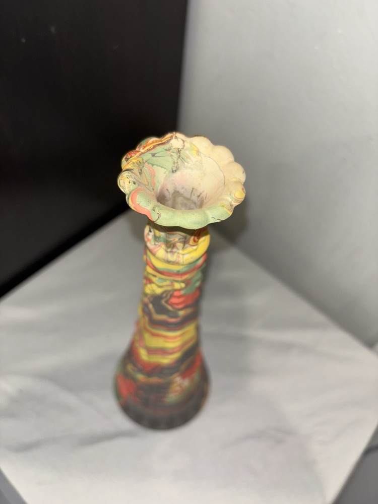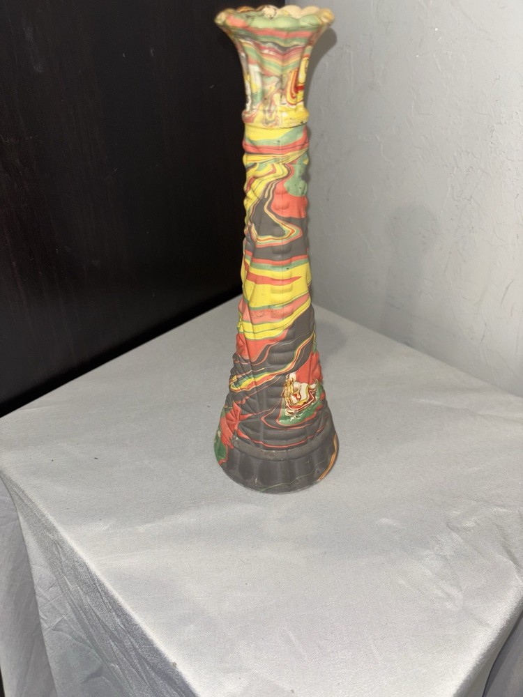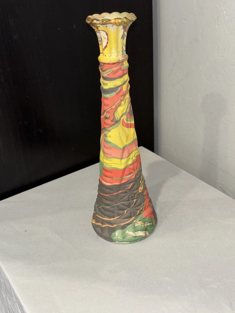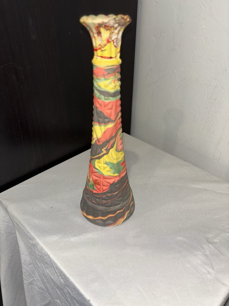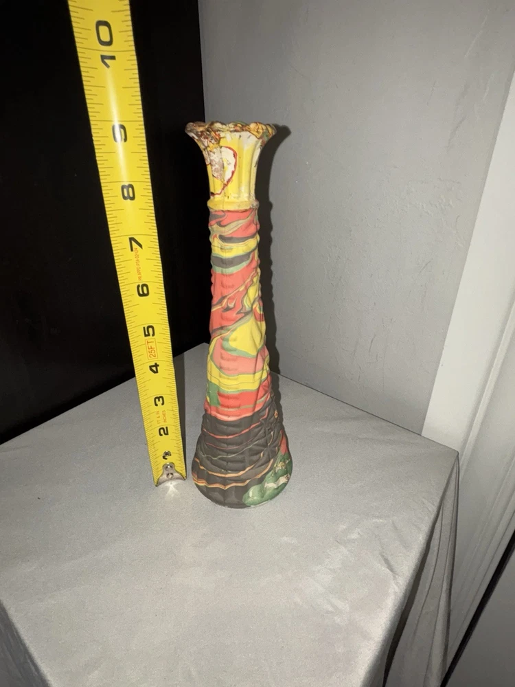 This vintage vase is a unique addition to any collection. The mid-century modern design, with its hand-painted details, makes it a one-of-a-kind piece. The ceramic vase stands at 9 inches tall and features a vibrant orange color. It is perfect for displaying flowers or as a standalone decorative item. The vase is unmarked but is likely from the Century product line.